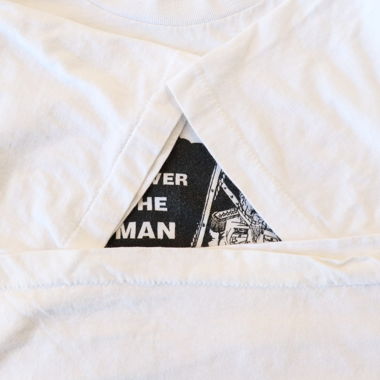 MODEL: SADDAM HUSSEIN T-Shirt MADE IN: U.S.A. AGE: 80's SIZE: L COLOR: ホワイト MATERIAL: コットン 100% COMMENT: 80年代 サダムフセイン Tシャツ フロントにラバープリント BVDボディ/レギュラーウェイト天竺 袖/裾ともにシングルステッチ ●BLOGでもご紹介しておりますので是非ご覧ください● SIZE DETAILS Size Chart 身幅: 55cm 着丈: 74cm 肩幅: 46cm 袖丈: 21cm ※着用モデル(男性): 身長176cm / 体重54kg CONDITION Condition Chart Rank "B" 着用感はあるが、汚れ・ダメージ・色褪せ等の無いまたは軽微な良好状態(下記詳細) ・全体: 着用感 ・袖: 左袖に軽微な汚れ ※その他詳細や詳しい画像をご覧になりたい場合はContact Formからお気軽にお問い合わせ下さい。