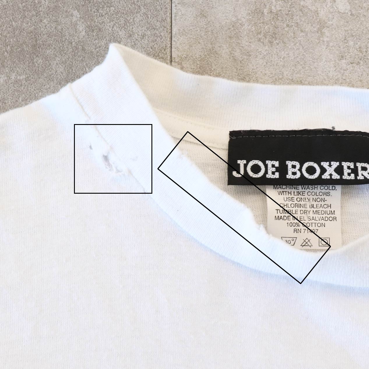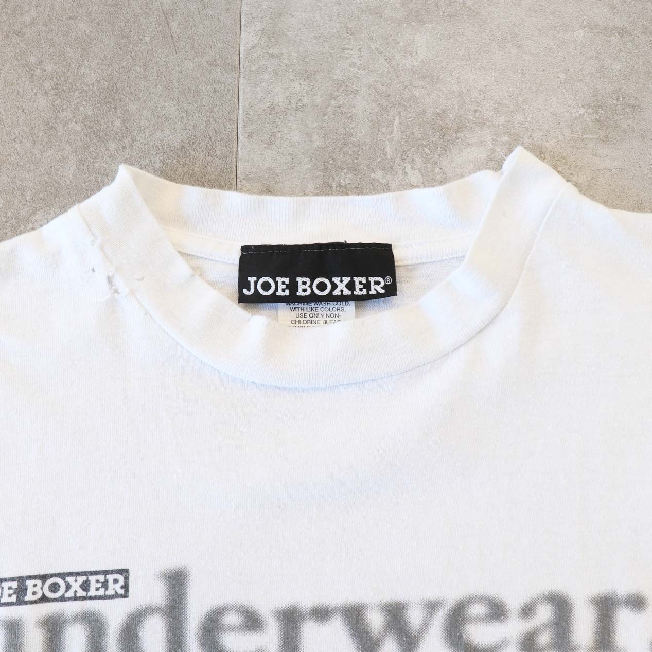 MODEL: JOE BOXER T-Shirt MADE IN: El Salvador AGE: 90's SIZE: XL COLOR: ホワイト MATERIAL: コットン 100% COMMENT: 90年代 ジョーボクサー Tシャツ フロントにラバープリント レギュラーウェイト天竺 袖/裾ともにダブルステッチ ●BLOGでもご紹介しておりますので是非ご覧ください● SIZE DETAILS Size Chart 身幅: 61cm 着丈: 68cm 肩幅: 59cm 袖丈: 18.5cm ※着用モデル(男性): 身長176cm / 体重54kg CONDITION Condition Chart Rank "C" 着用感があり、汚れ・ダメージ・色褪せが一部または全体にある状態(下記詳細) ・全体: 着用感 ・フロント: 襟付け根に穴、襟リブ端にスレ穴 ※その他詳細や詳しい画像をご覧になりたい場合はContact Formからお気軽にお問い合わせ下さい。