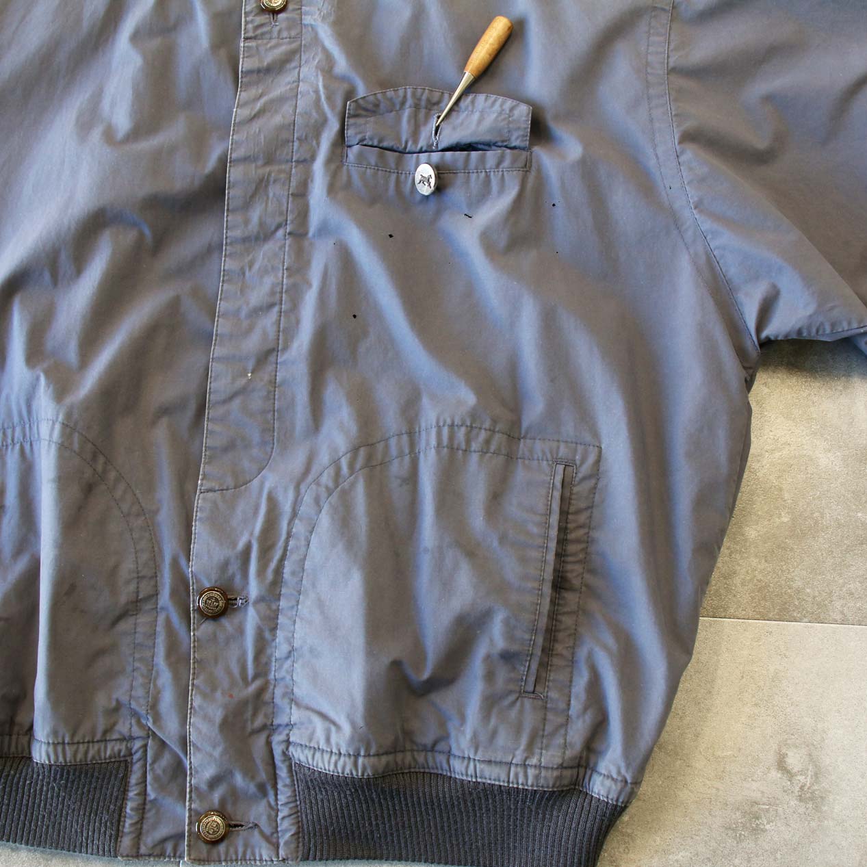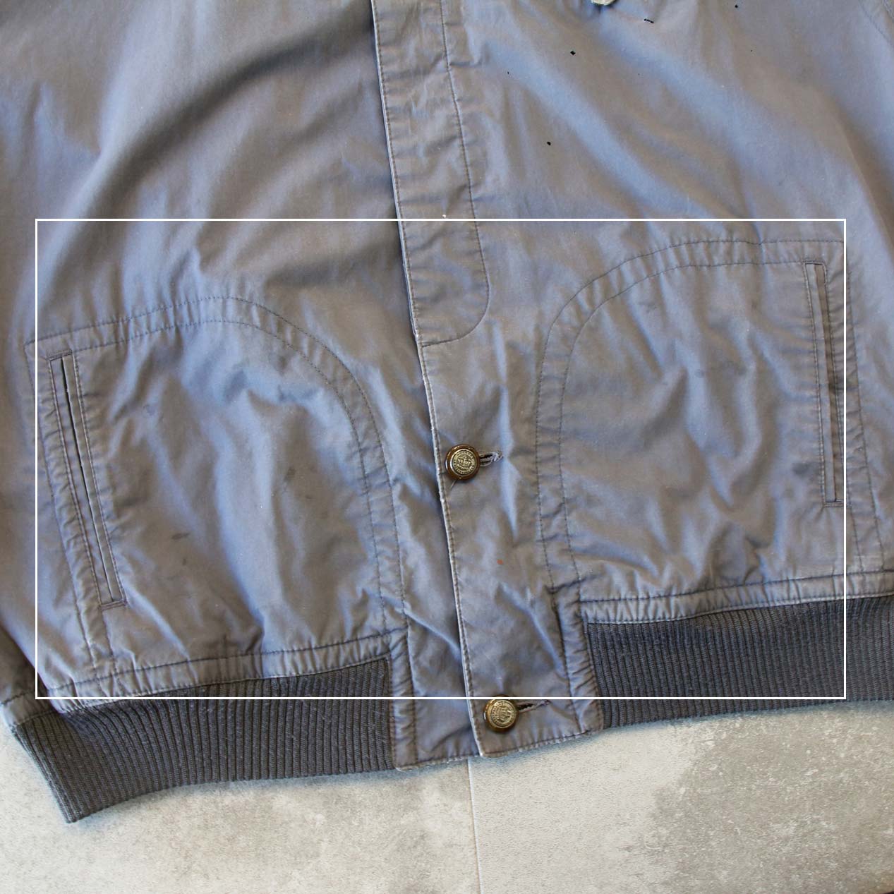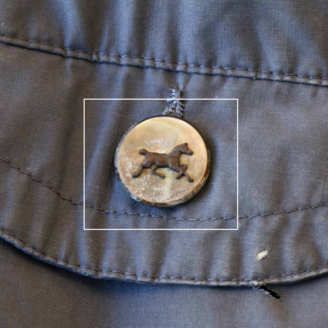 ・フロント: 左胸に穴、胸ポケットボタン替え、ハンドポケット上に汚れ