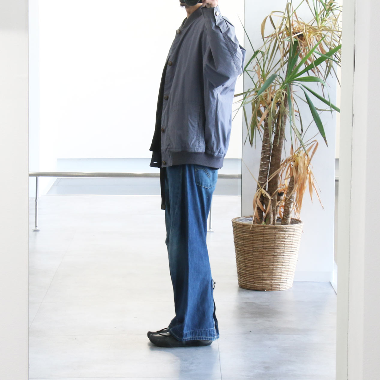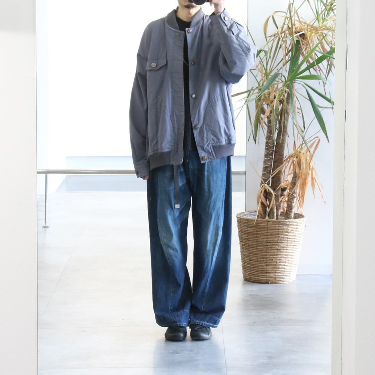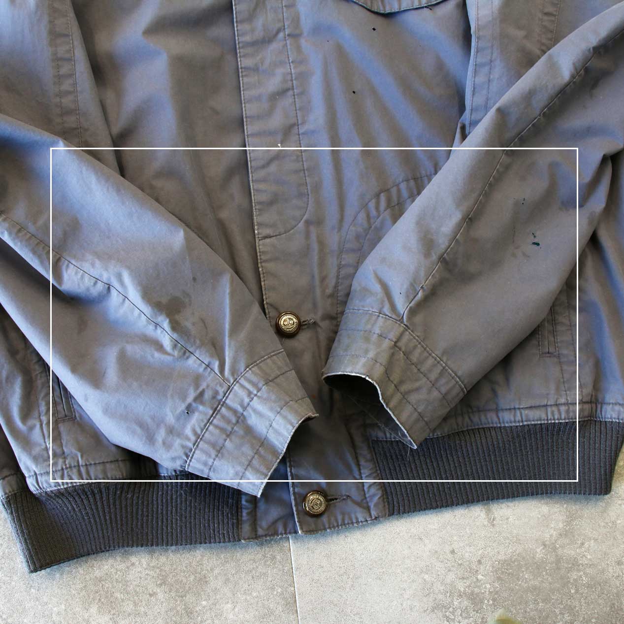 ・フロント: 左胸に穴、胸ポケットボタン替え、ハンドポケット上に汚れ