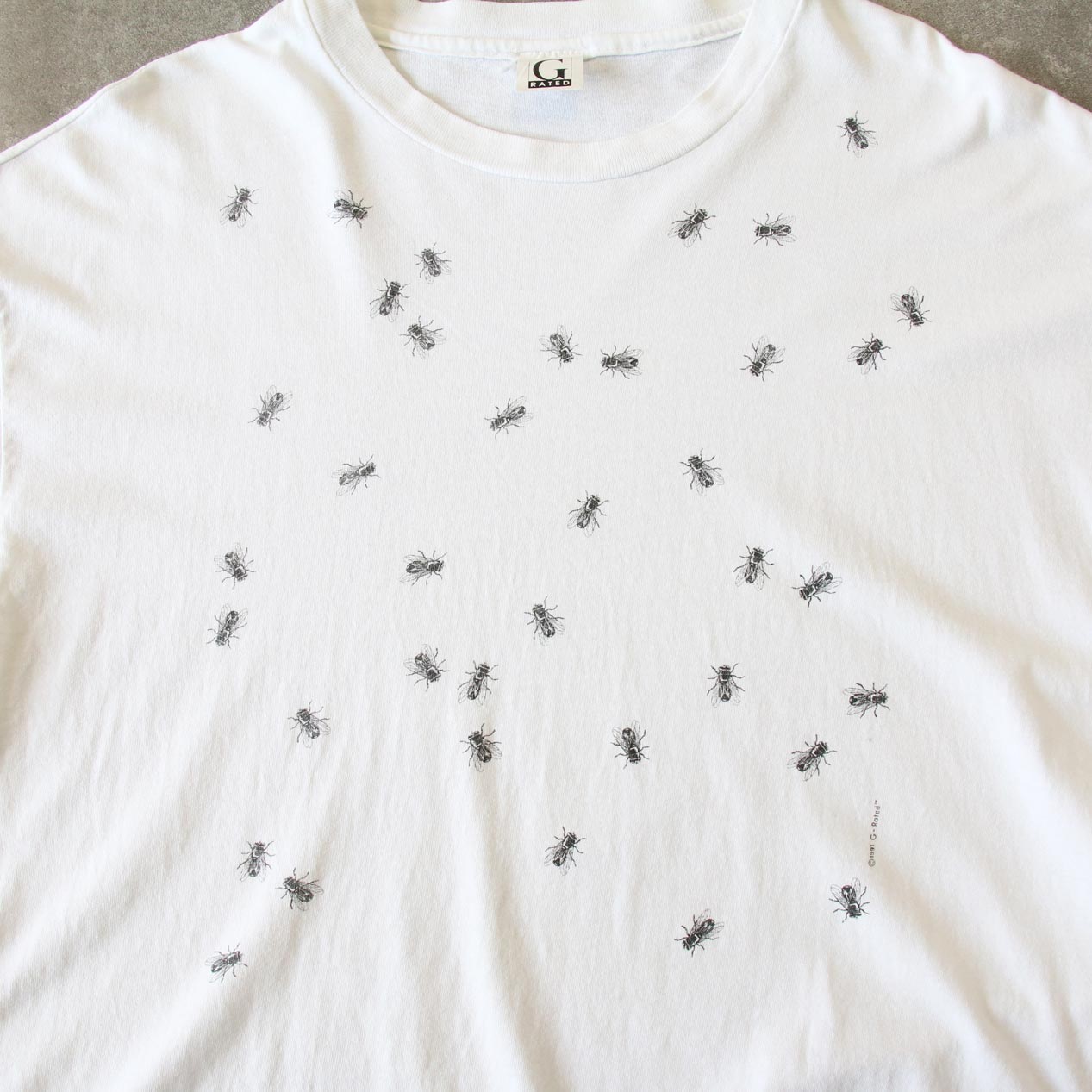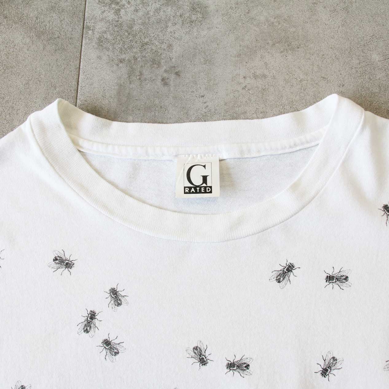 MODEL: G-RATED Fly Patterned Shirt MADE IN: U.S.A. AGE: 90's SIZE: XL COLOR: ホワイト MATERIAL: コットン 100% COMMENT: フロント/バック ラバープリント レギュラーウェイト天竺 袖/裾ともにシングルステッチ ●BLOGでもご紹介しておりますので是非ご覧ください● SIZE DETAILS Size Chart 身幅: 59cm 着丈: 75cm 肩幅: 57cm 袖丈: 21cm ※着用モデル(男性): 身長176cm / 体重54kg CONDITION Condition Chart Rank "B" 着用感はあるが、汚れ・ダメージ・色褪せ等の無いまたは軽微な良好状態(下記詳細) ・全体: 着用感 ※その他詳細や詳しい画像をご覧になりたい場合はContact Formからお気軽にお問い合わせ下さい。