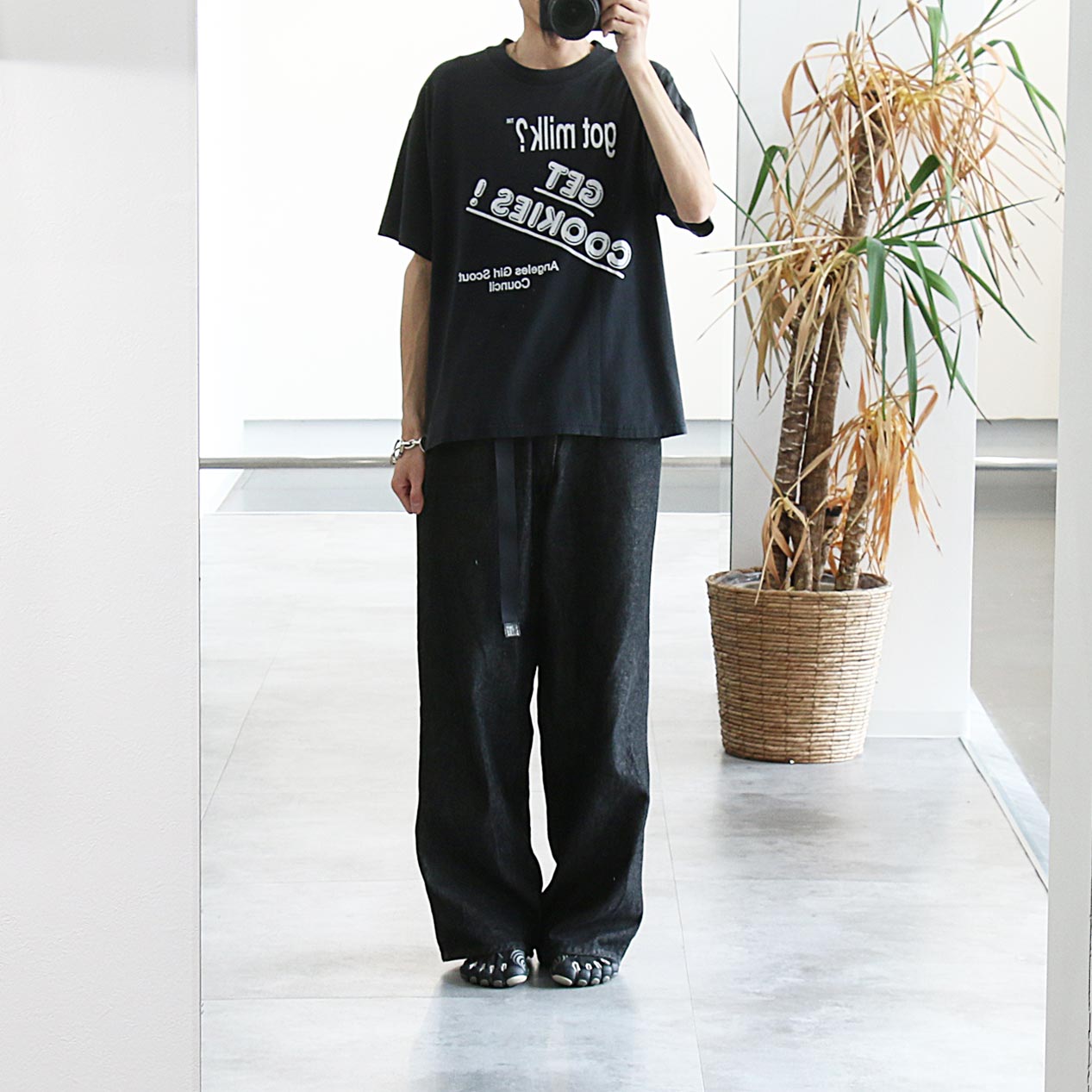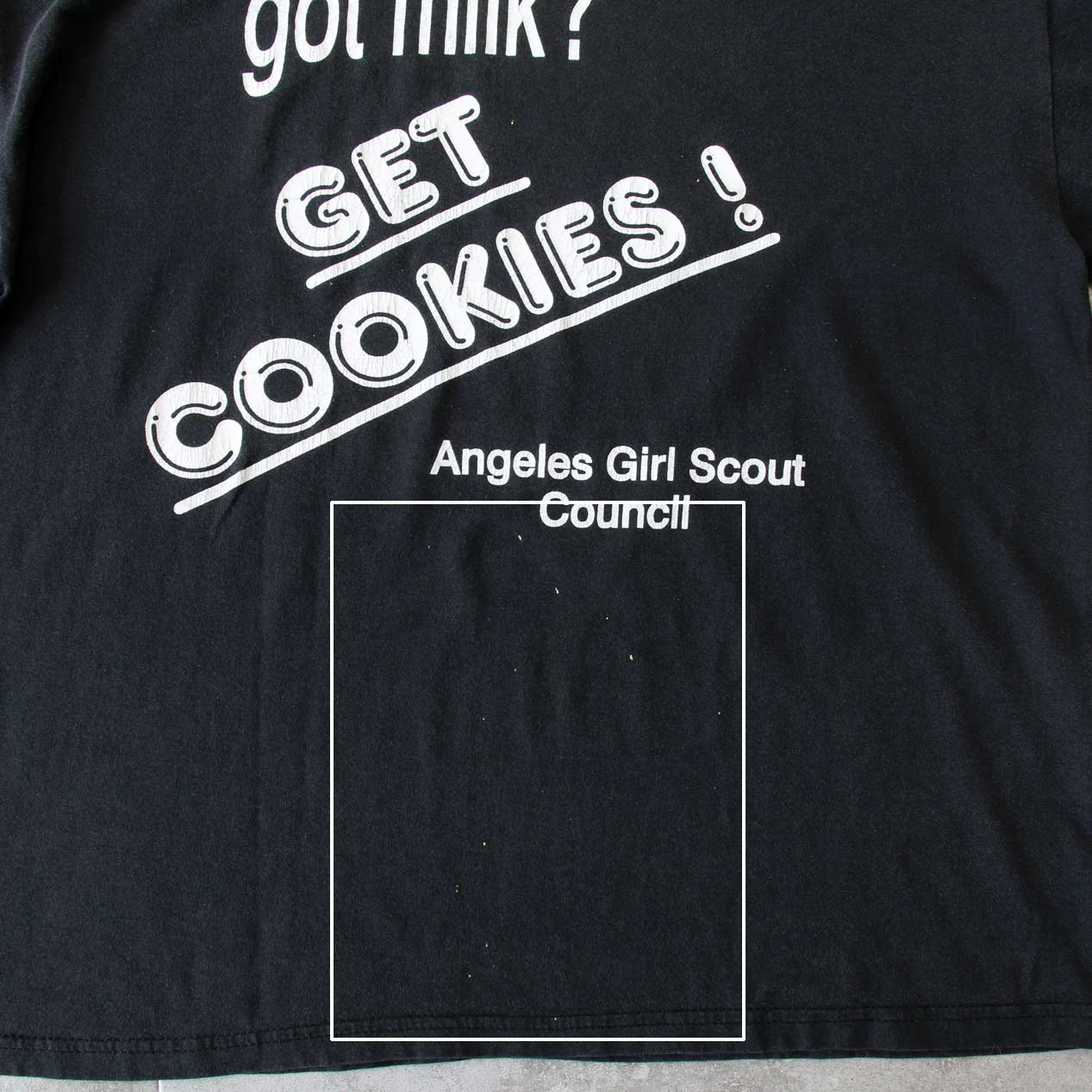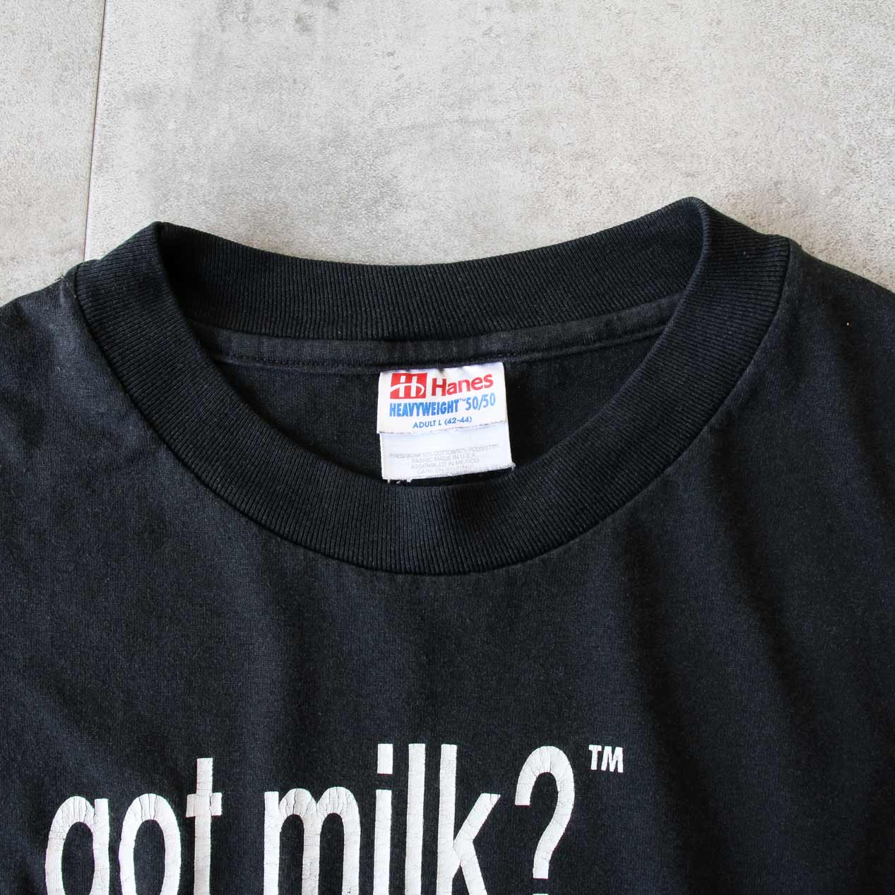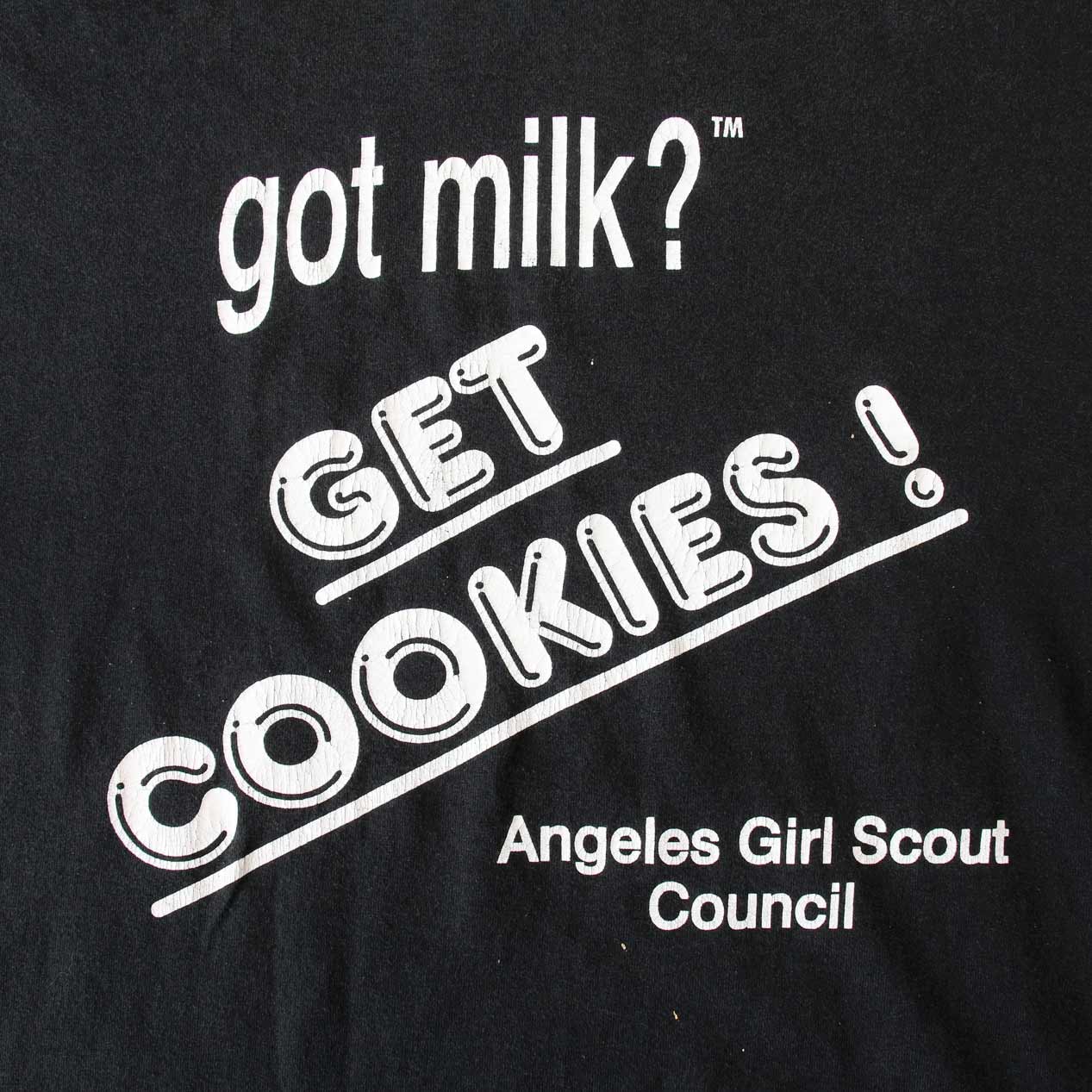MODEL: GOT MILK? / GET COOKIES! T-Shirt MADE IN: Mexico AGE: 90's SIZE: L COLOR: ブラック MATERIAL: コットン 50% ポリエステル 50% COMMENT: フロント ラバープリント レギュラーウェイト天竺 袖/裾ともにダブルステッチ ●BLOGでもご紹介しておりますので是非ご覧ください● SIZE DETAILS Size Chart 身幅: 58cm 着丈: 68cm 肩幅: 55cm 袖丈: 20cm ※着用モデル(男性): 身長176cm / 体重54kg CONDITION Condition Chart Rank "C" 着用感があり、汚れ・ダメージ・色褪せが一部または全体にある状態(下記詳細) ・全体: 着用感 ・フロント: 腹部~裾付近に軽微なペンキ飛び ※その他詳細や詳しい画像をご覧になりたい場合はContact Formからお気軽にお問い合わせ下さい。