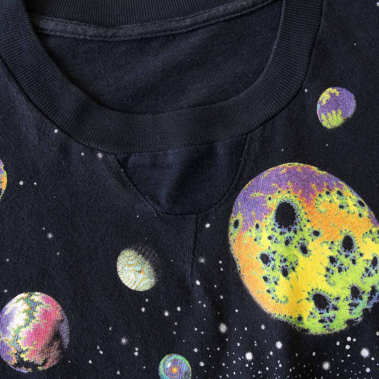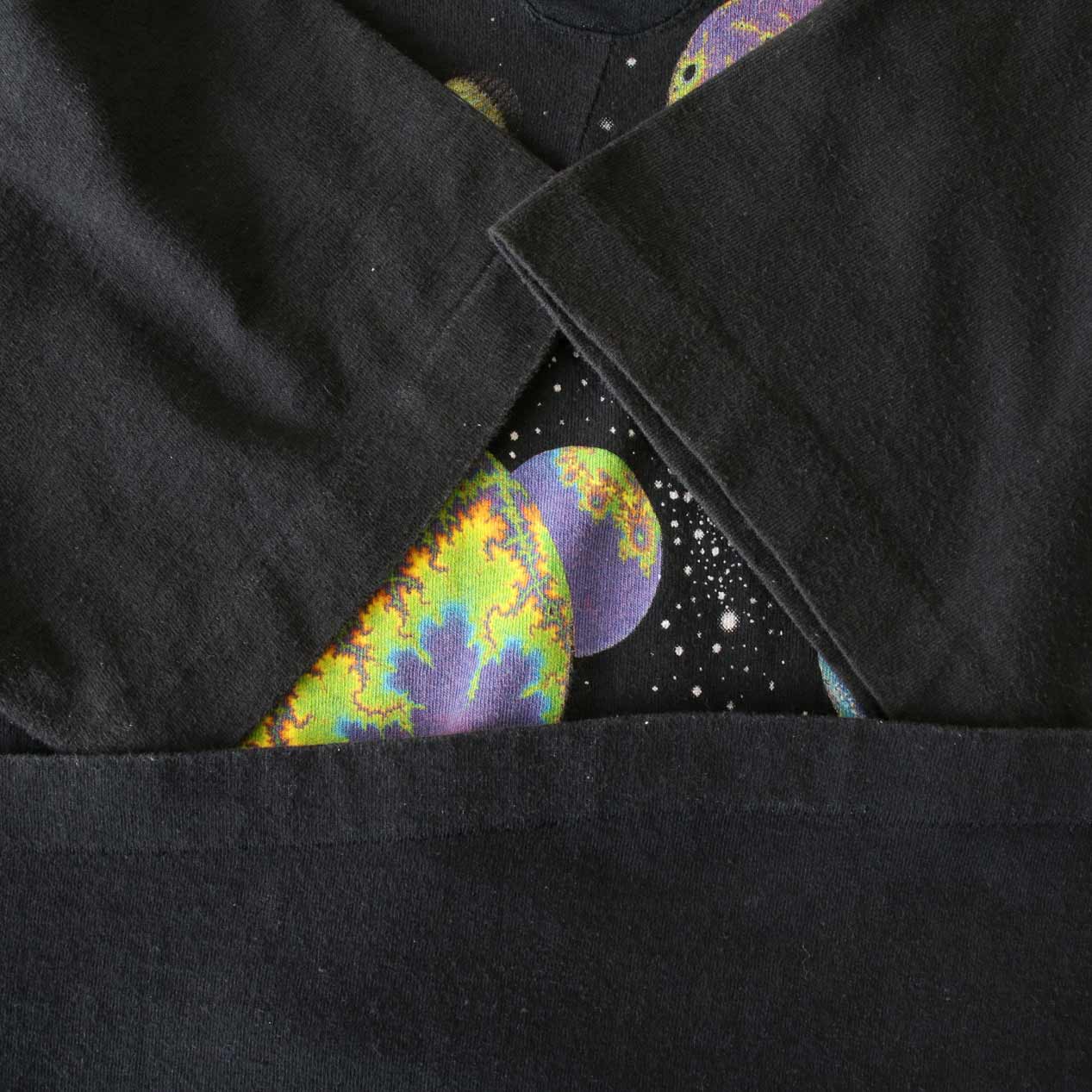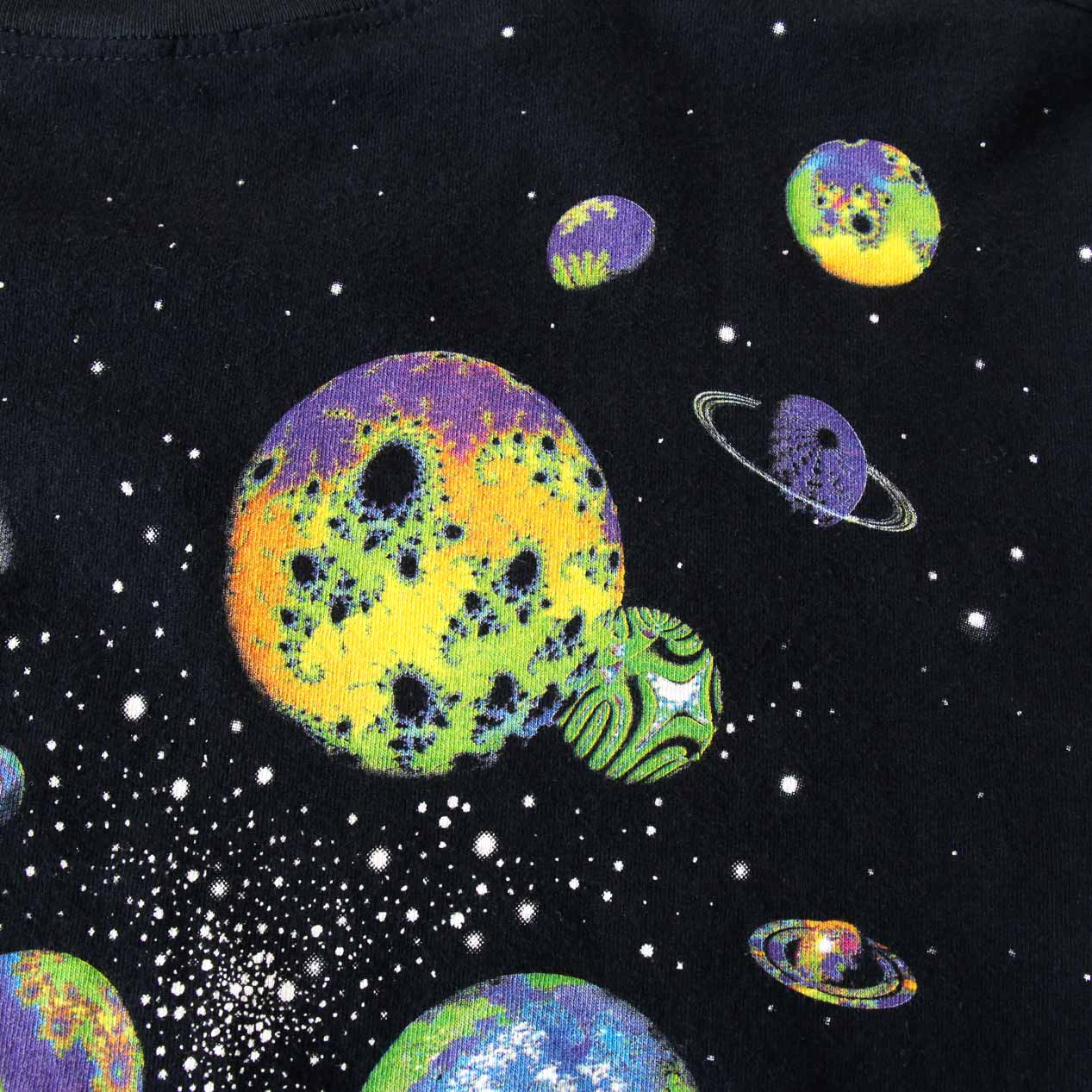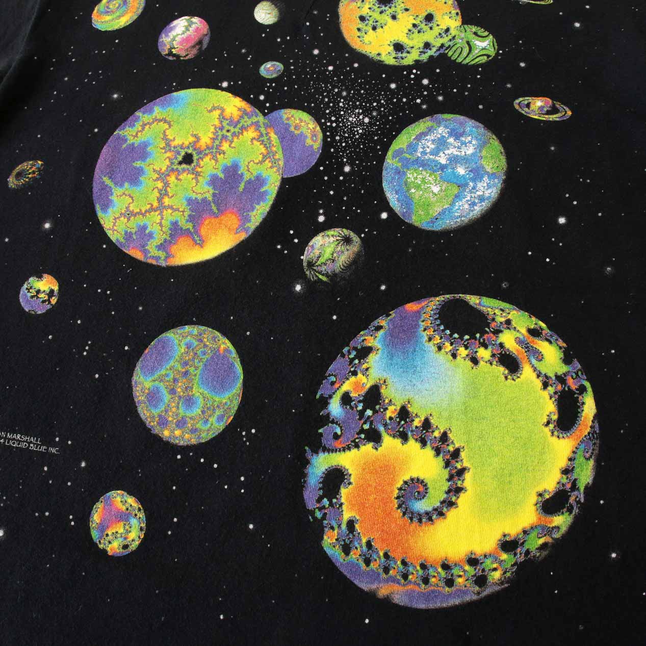MODEL: LIQUID BLUE Fractal Art T-Shirt MADE IN: --- AGE: 90's SIZE: --- (L相当) COLOR: ブラック MATERIAL: --- (おそらくコットン 100%) COMMENT: 90年代 リキッドブルー フラクタルアートプリント 袖/裾ともにシングルステッチ 襟タグ欠損 SIZE DETAILS Size Chart 身幅: 57cm 着丈: 71.5cm 肩幅: 52cm 袖丈: 20.5cm ※着用モデル(男性): 身長176cm / 体重54kg CONDITION Condition Chart 着用感があり、汚れ・ダメージ・色褪せが一部または全体にある状態(下記詳細) ・全体: 着用感 ・フロント: 襟下に天竺生地はめ込みリペア ※その他詳細や詳しい画像をご覧になりたい場合はContact Formからお気軽にお問い合わせ下さい。