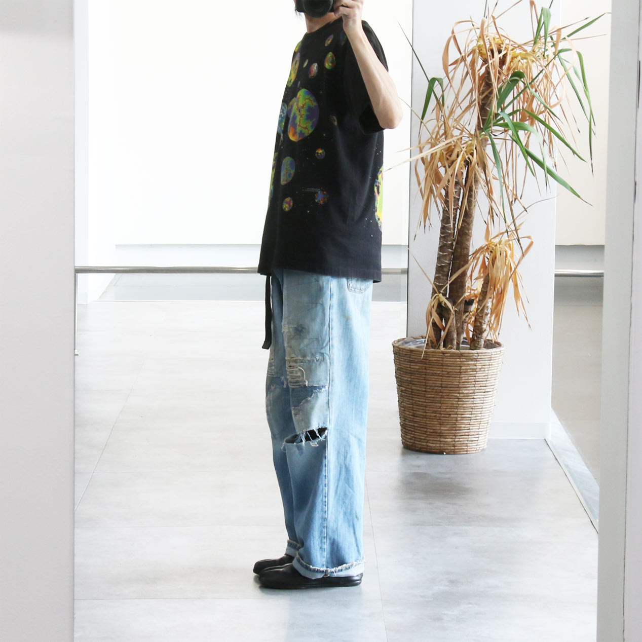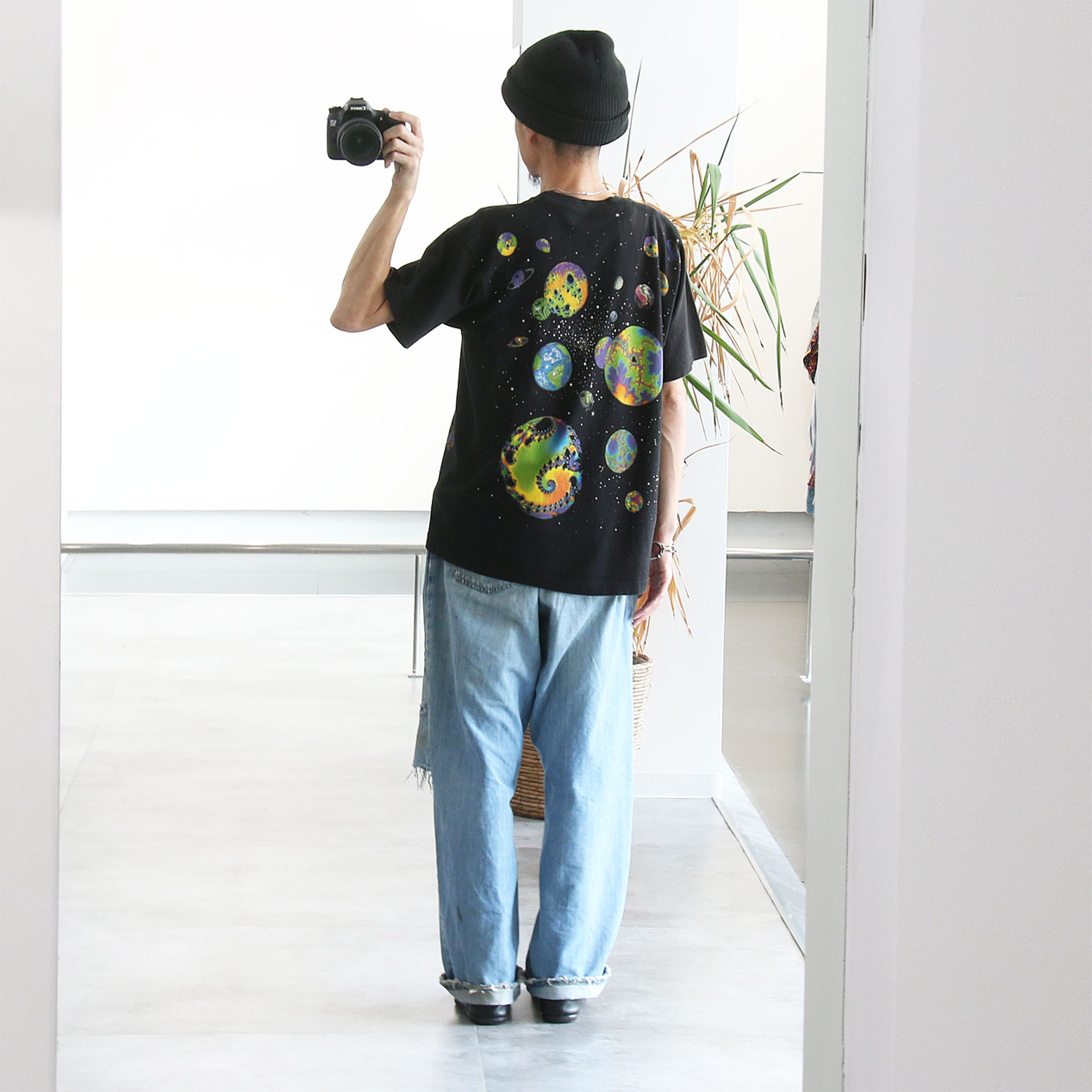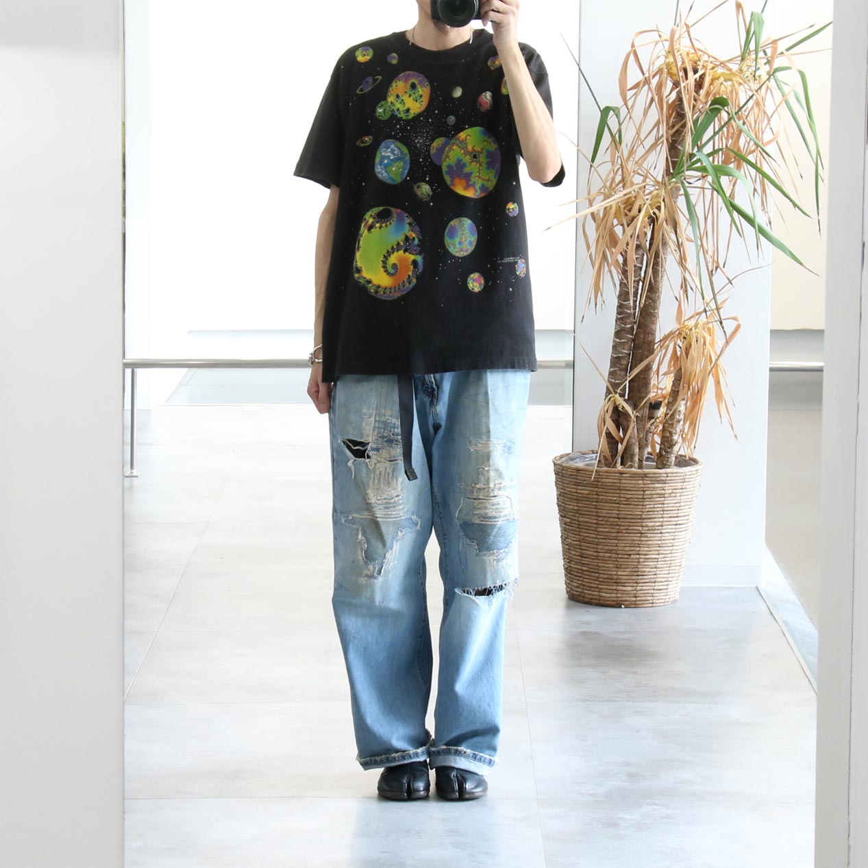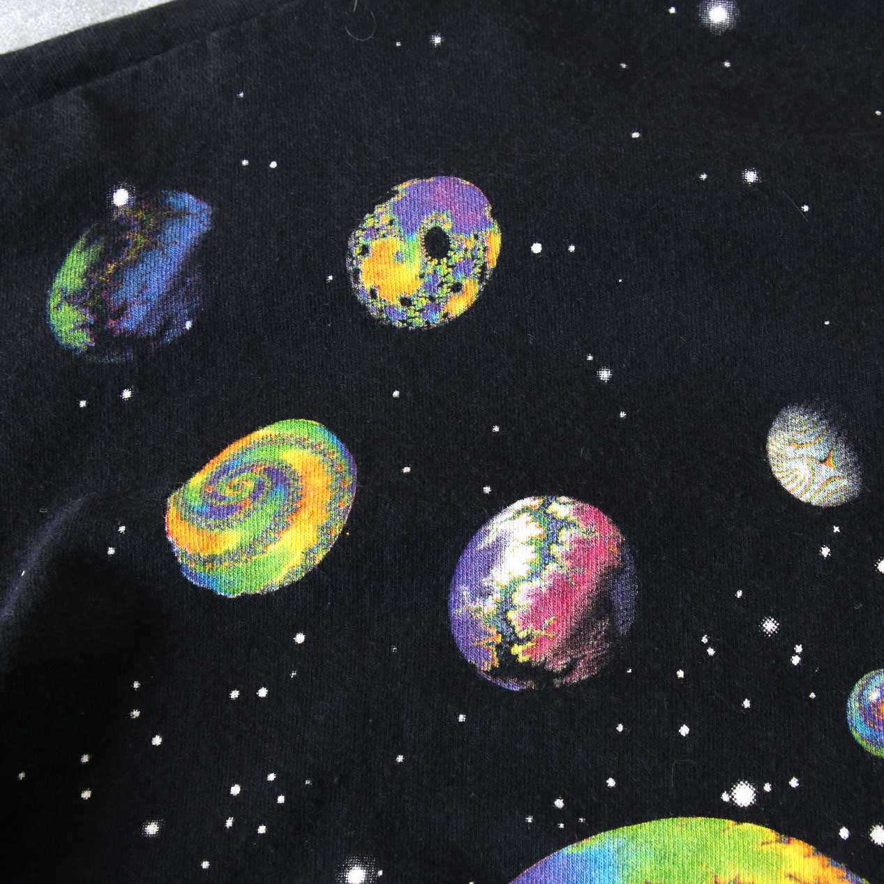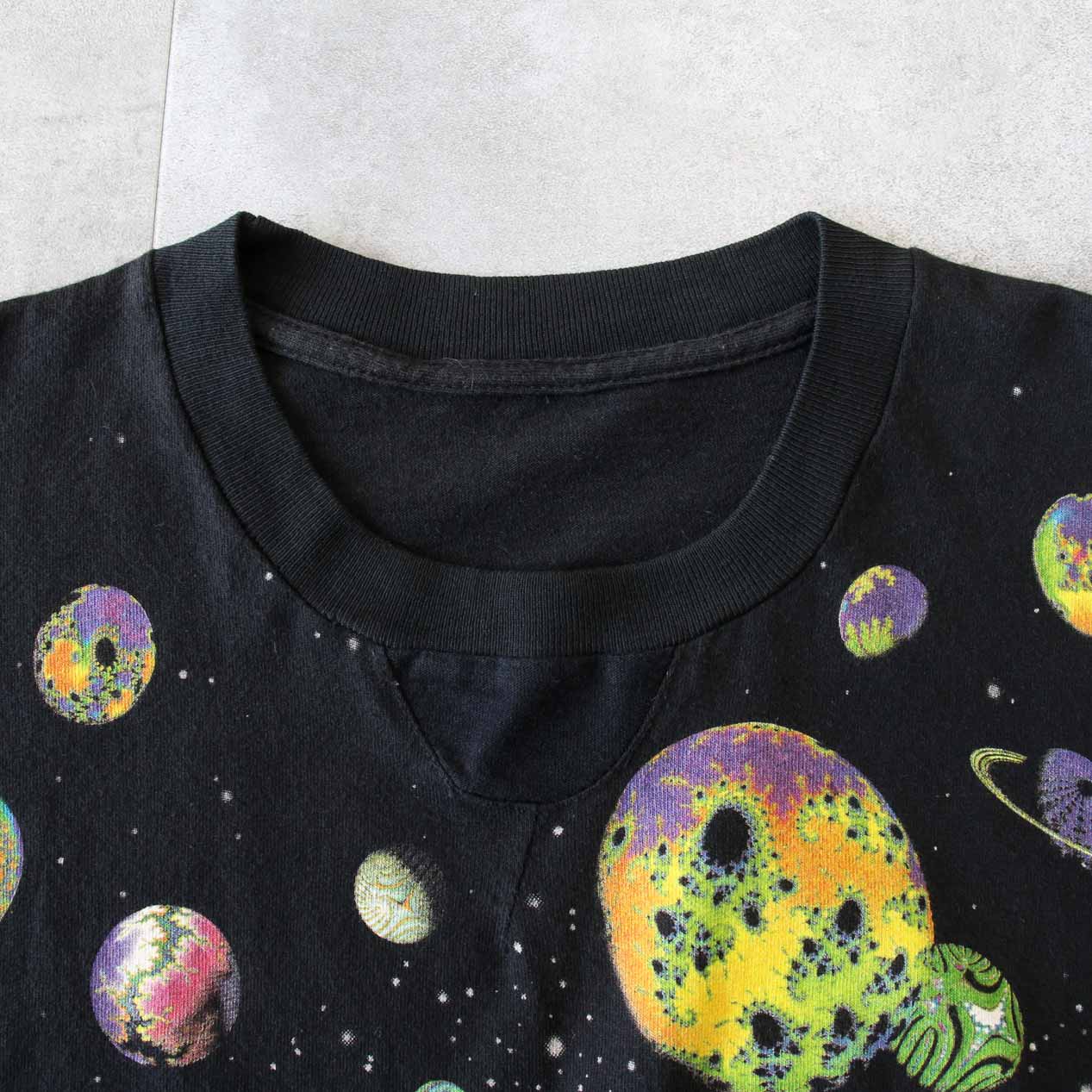 MODEL: LIQUID BLUE Fractal Art T-Shirt MADE IN: --- AGE: 90's SIZE: --- (L相当) COLOR: ブラック MATERIAL: --- (おそらくコットン 100%) COMMENT: 90年代 リキッドブルー フラクタルアートプリント 袖/裾ともにシングルステッチ 襟タグ欠損 SIZE DETAILS Size Chart 身幅: 57cm 着丈: 71.5cm 肩幅: 52cm 袖丈: 20.5cm ※着用モデル(男性): 身長176cm / 体重54kg CONDITION Condition Chart 着用感があり、汚れ・ダメージ・色褪せが一部または全体にある状態(下記詳細) ・全体: 着用感 ・フロント: 襟下に天竺生地はめ込みリペア ※その他詳細や詳しい画像をご覧になりたい場合はContact Formからお気軽にお問い合わせ下さい。