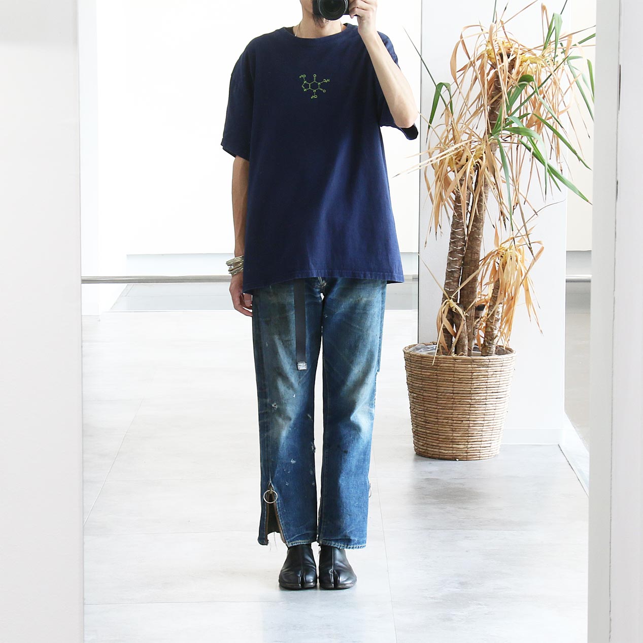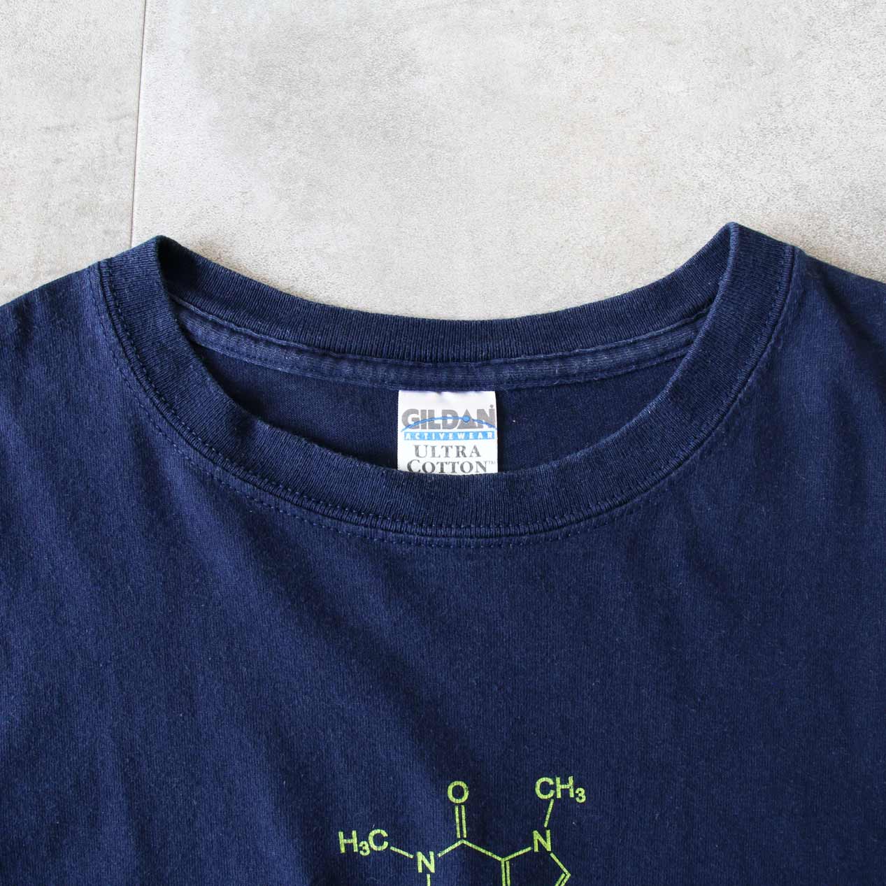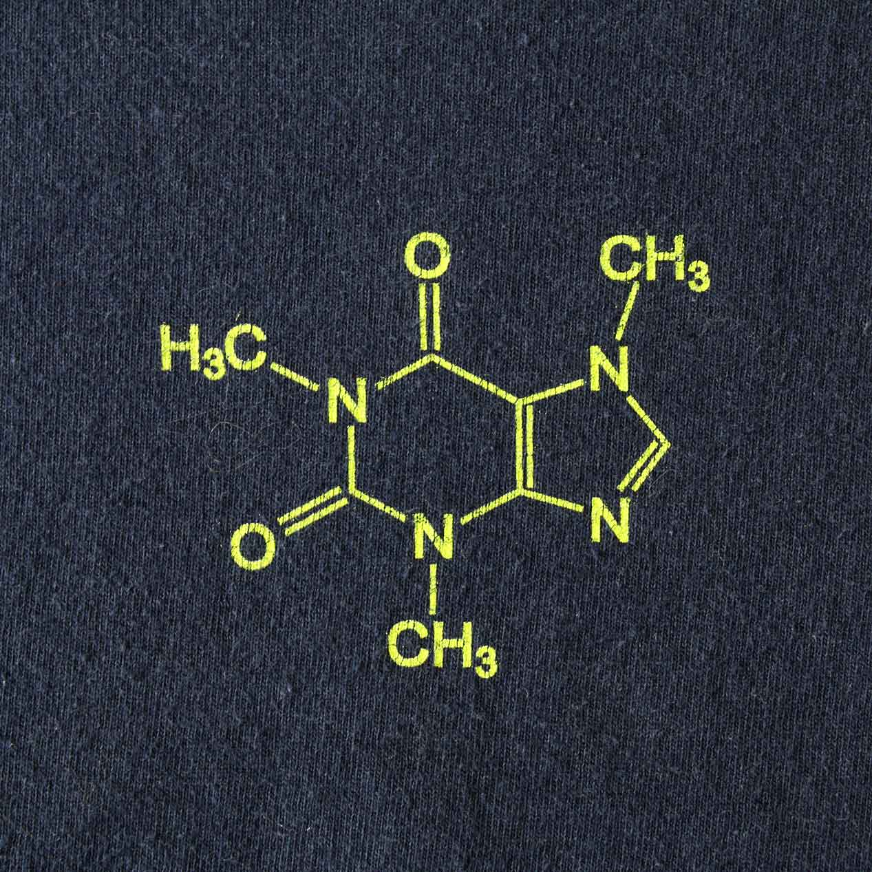 MODEL: CAFFEINE CHEMICAL FORMULA T-Shirt MADE IN: Haiti AGE: 00's SIZE: L COLOR: ネイビー MATERIAL: コットン 100% COMMENT: フロント ラバープリント レギュラーウェイト天竺 袖/裾ともにダブルステッチ SIZE DETAILS Size Chart 身幅: 57cm 着丈: 73cm 肩幅: 55cm 袖丈: 19.5cm ※着用モデル(男性): 身長176cm / 体重54kg CONDITION Condition Chart Rank "B" 着用感はあるが、汚れ・ダメージ・色褪せ等の無いまたは軽微な良好状態(下記詳細) ・全体: 着用感 ※その他詳細や詳しい画像をご覧になりたい場合はContact Formからお気軽にお問い合わせ下さい。