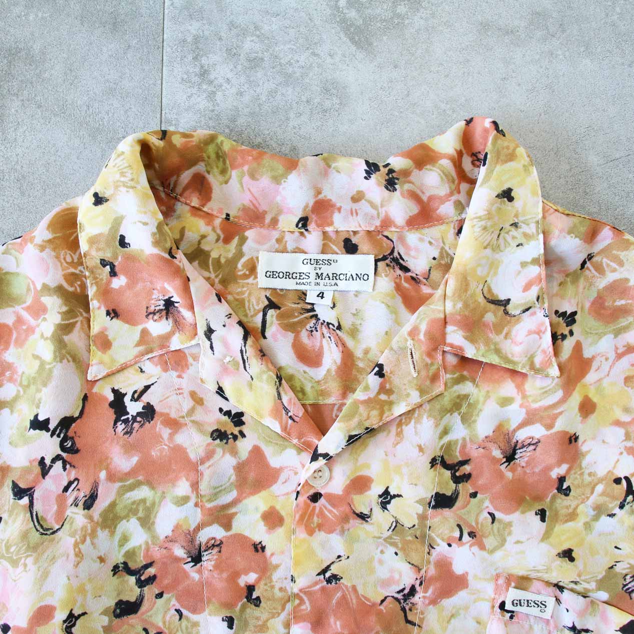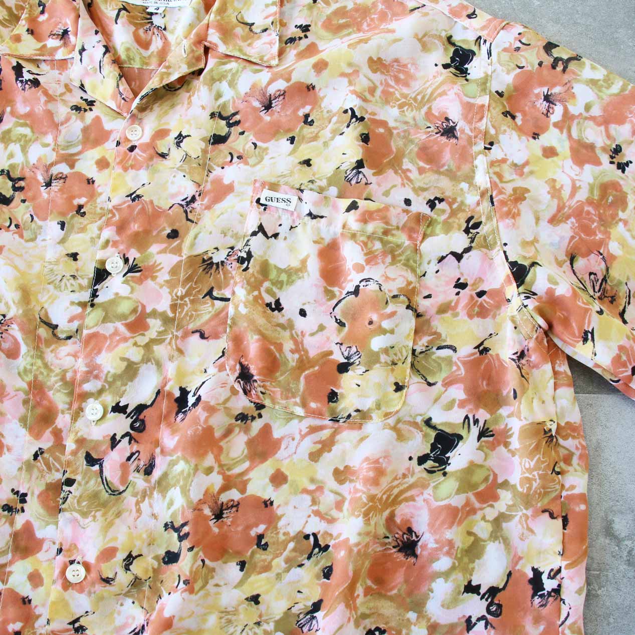 MODEL: GUESS Flower Patterned Georgette Open Collar Shirt MADE IN: U.S.A. AGE: 90's SIZE: 4 COLOR: ピンク系 MATERIAL: ポリエステル 100% COMMENT: 90年代 ゲス フラワープリントジョーゼット オープンカラー 左胸ポケット グッドコンディション ●BLOGでもご紹介しておりますので是非ご覧ください● SIZE DETAILS Size Chart 身幅: 65cm 着丈: 71cm 肩幅: 54cm 袖丈: 26cm ※着用モデル(男性): 身長176cm / 体重54kg CONDITION Condition Chart Rank "B" 着用感はあるが、汚れ・ダメージ・色褪せ等の無いまたは軽微な良好状態(下記詳細) ・全体: 軽微な着用感 ※その他詳細や詳しい画像をご覧になりたい場合はContact Formからお気軽にお問い合わせ下さい。