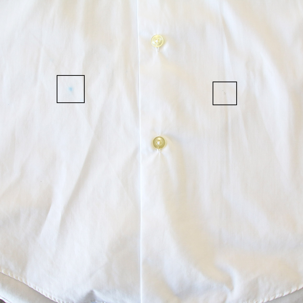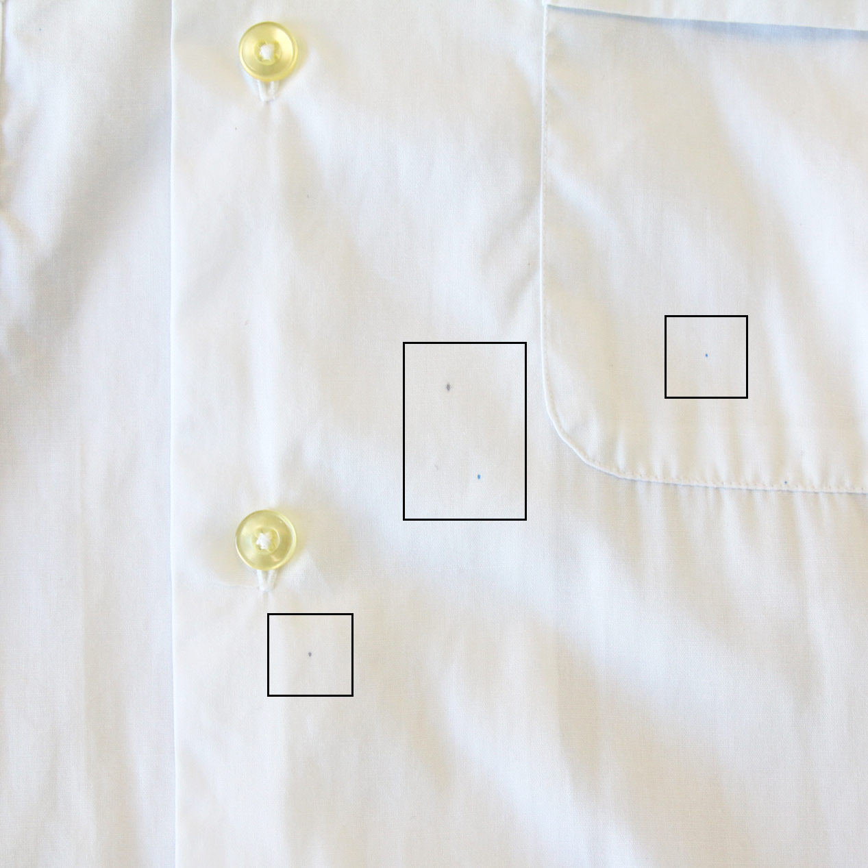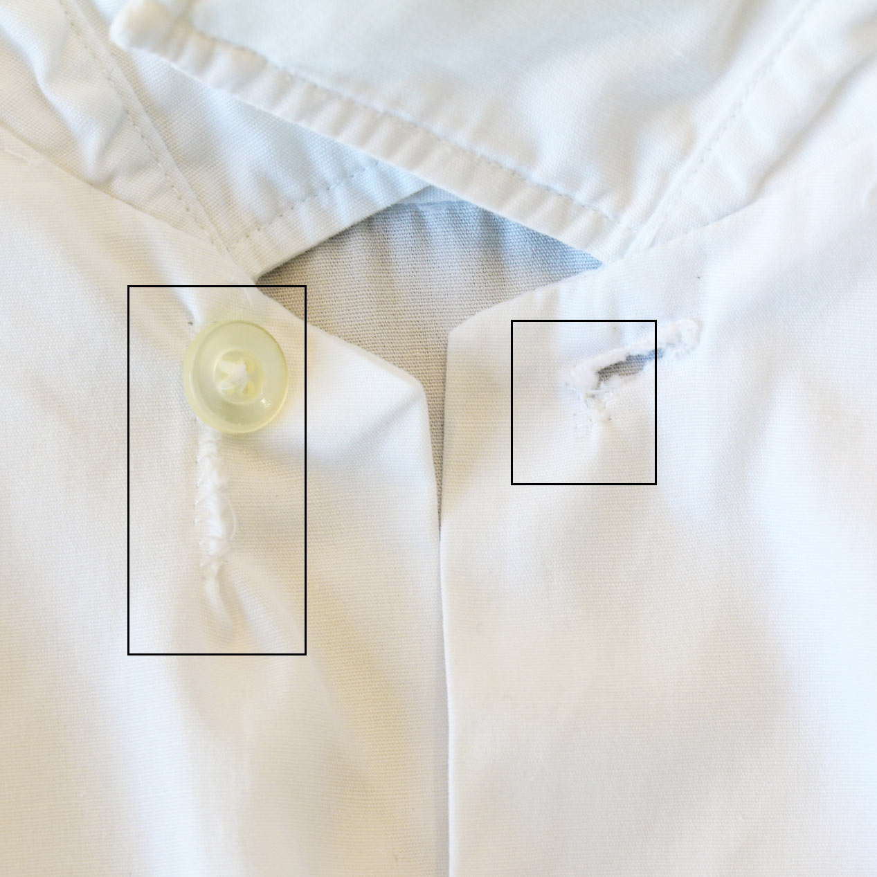 ・フロント: 第一ボタン付近/第一ボタンホールに手まつりリペア、胸部/腹部付近に汚れ
