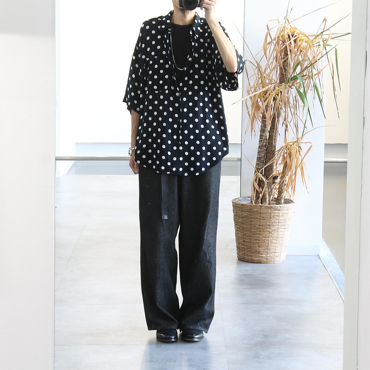 MODEL: GOOUCH Black x White Dot Patterned Rayon Shirt