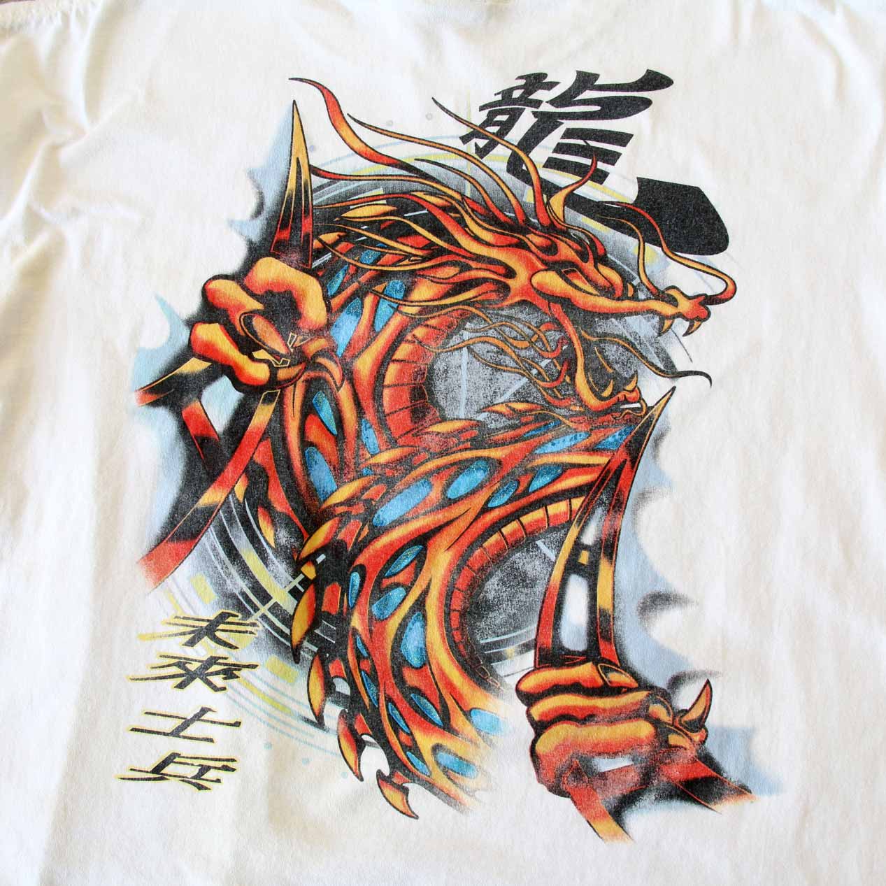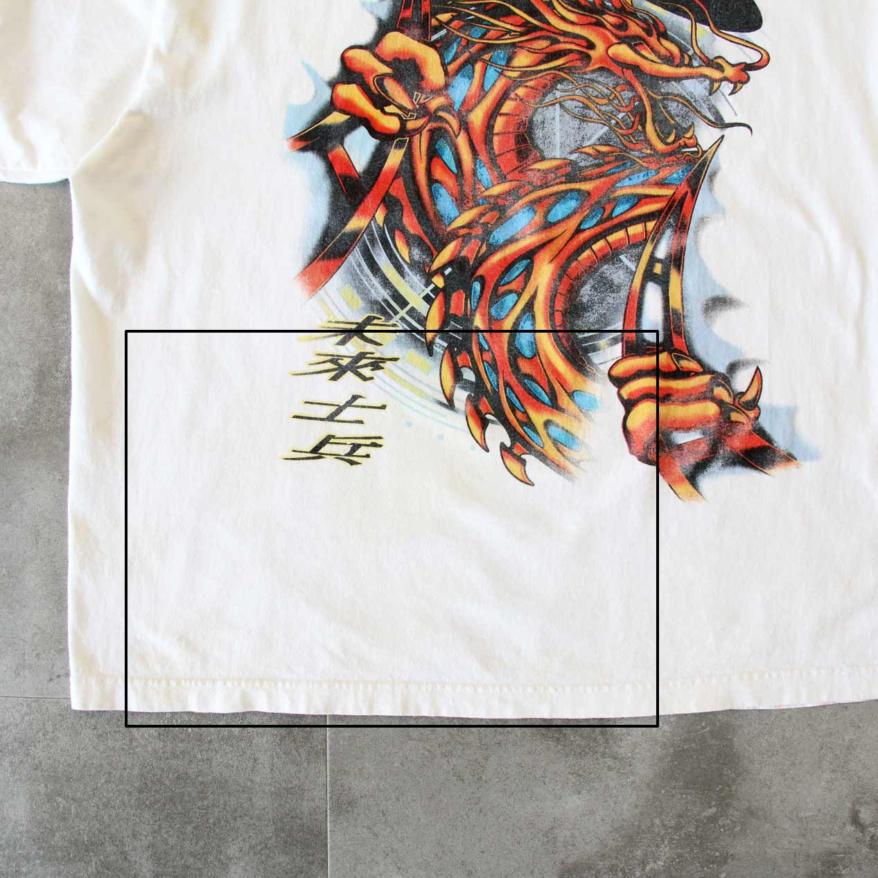MODEL: UTILITY 龍 Wide Shaped T-Shirt MADE IN: Haiti AGE: 90's~ SIZE: L COLOR: ホワイト MATERIAL: コットン 100% COMMENT: 90年代~ ユーティリティ Tシャツ フロント/バック ラバープリント(一部ラメプリント) レギュラーウェイト天竺 袖/裾ともにダブルステッチ ワイドシェイプ SIZE DETAILS Size Chart 身幅: 66cm 着丈: 67cm 肩幅: 56cm 袖丈: 24cm ※着用モデル(男性): 身長176cm / 体重54kg CONDITION Condition Chart Rank "C" 着用感があり、汚れ・ダメージ・色褪せが一部または全体にある状態(下記詳細) ・全体: 着用感 ・フロント/バック: ごく薄い汚れ ※その他詳細や詳しい画像をご覧になりたい場合はContact Formからお気軽にお問い合わせ下さい。