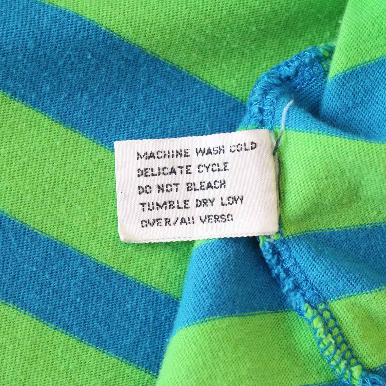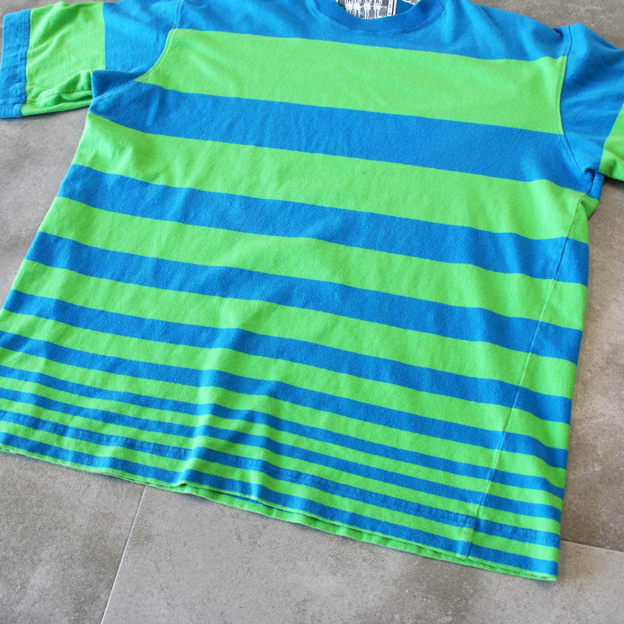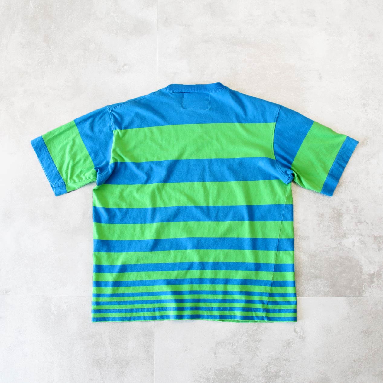 MODEL: 90’s CLAIBORNE WEAR Yarn Dyed Gradation Stripe T-Shirt [M] MADE IN: Taiwan AGE: 90's SIZE: M COLOR: ブルー/グリーン MATERIAL: コットン 100% COMMENT: 90年代 クレイボーンウェア Tシャツ 先染めグラデーションボーダーパターン レギュラーウェイト天竺 袖/裾ともにダブルステッチ SIZE DETAILS Size Chart 身幅: 57cm 着丈: 66cm 肩幅: 49cm 袖丈: 24cm ※着用モデル(男性): 身長176cm / 体重54kg CONDITION Condition Chart Rank "B" 着用感はあるが、汚れ・ダメージ・色褪せ等の無いまたは軽微な良好状態(下記詳細) ・全体: 着用感 ※その他詳細や詳しい画像をご覧になりたい場合はContact Formからお気軽にお問い合わせ下さい。