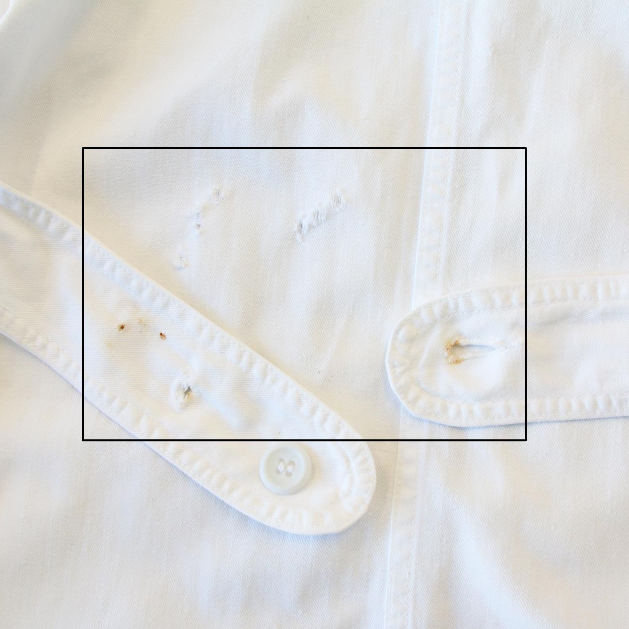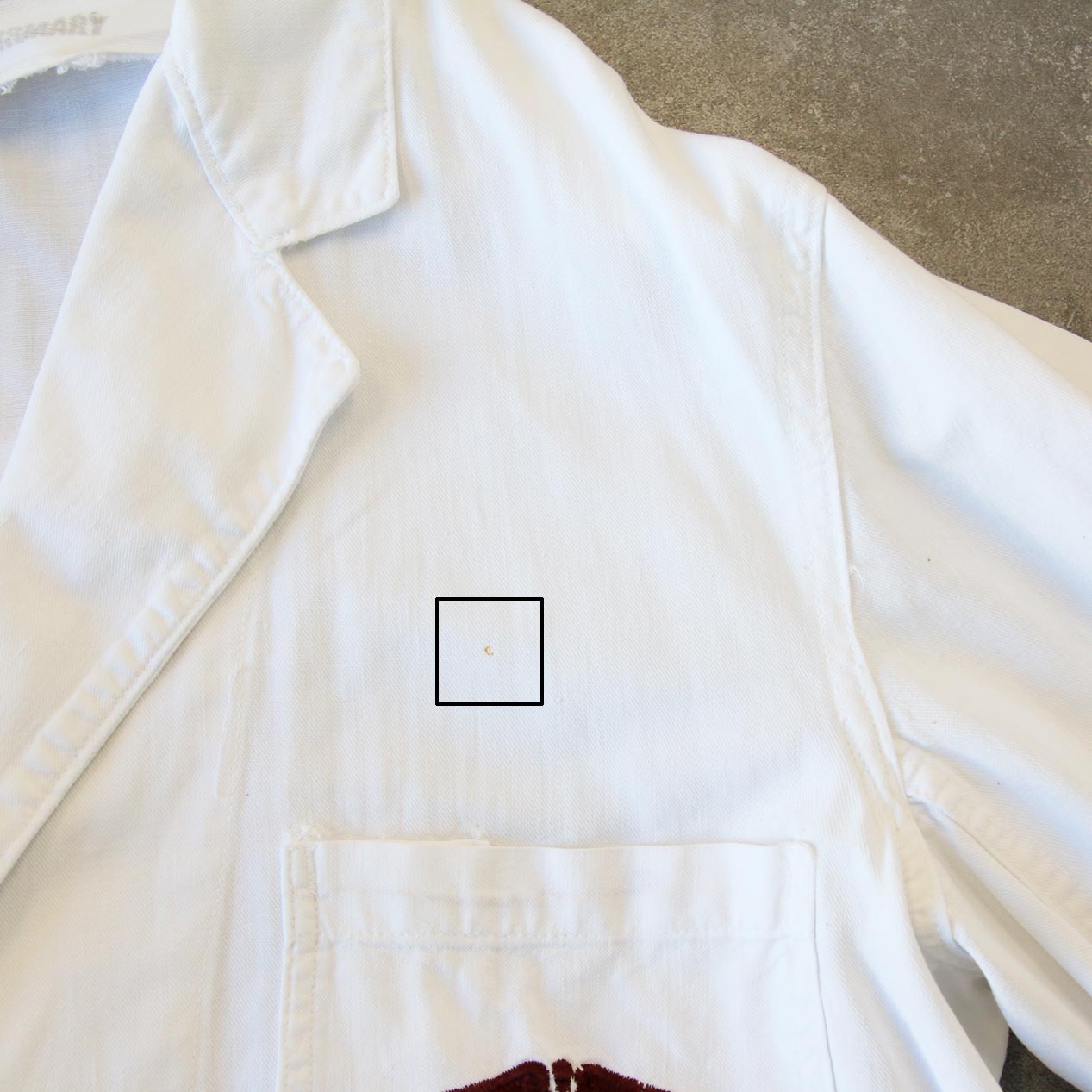 ・フロント: 左胸付近に軽微な汚れ、右ポケット付近にダメージ