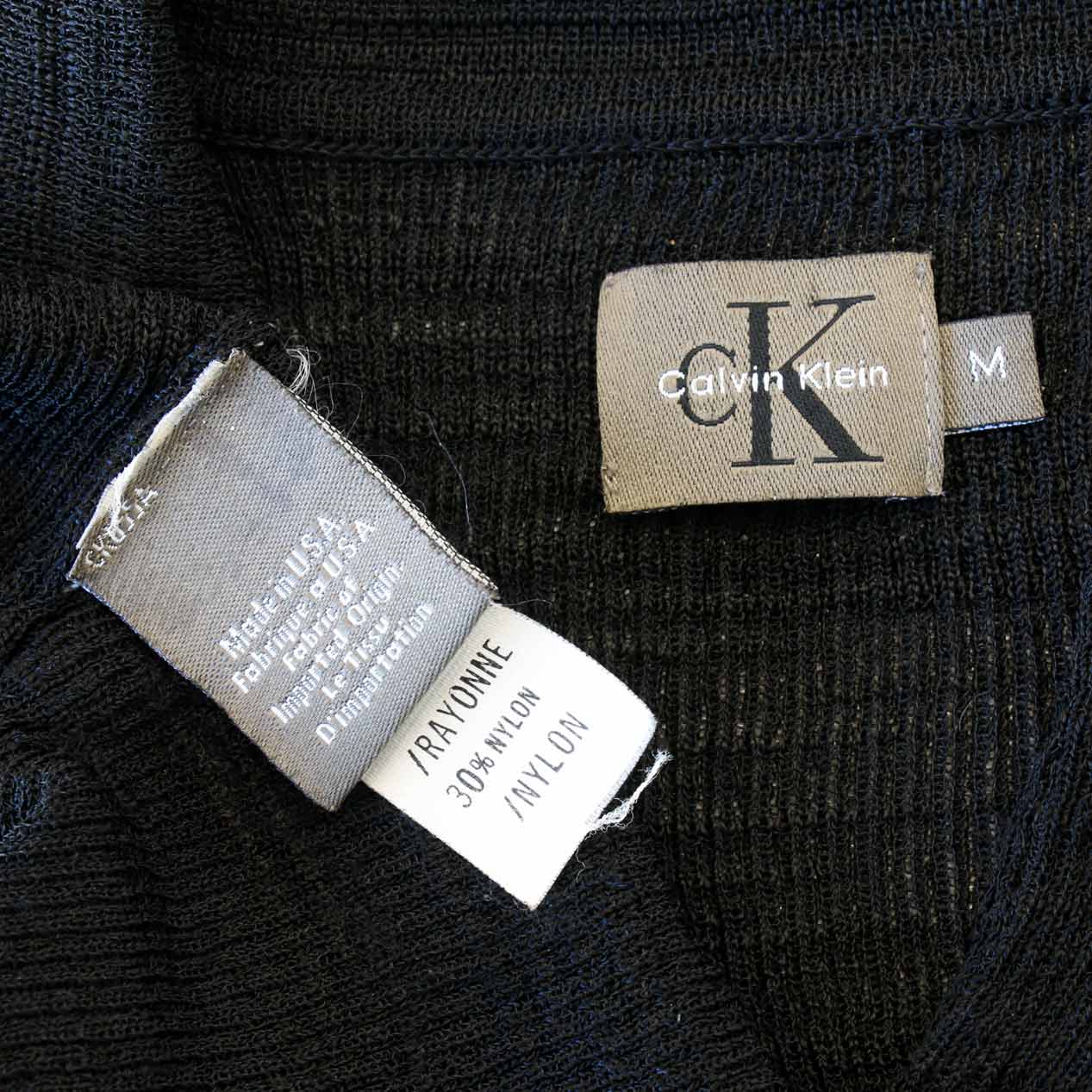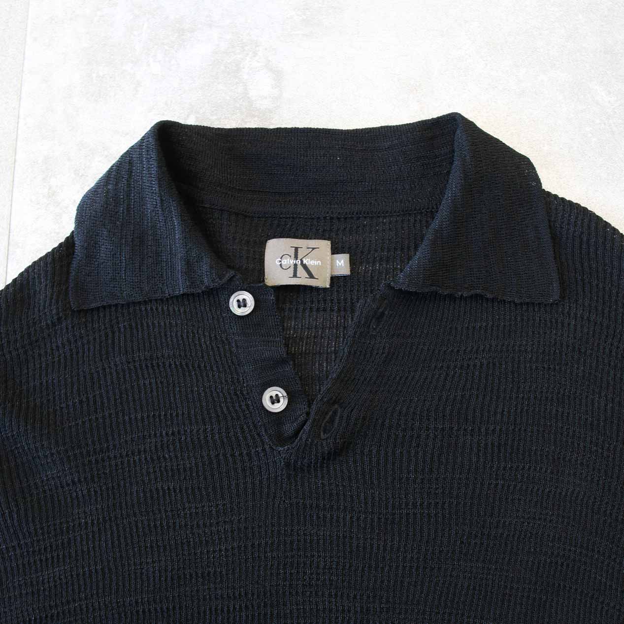 MODEL: CALVIN KLEIN Black Rayon / Nylon Polo Collared Knit Shirt MADE IN: U.S.A. AGE: 90's SIZE: M COLOR: ブラック MATERIAL: レーヨン 70% ナイロン 30% COMMENT: 90年代 カルバンクライン ニットシャツ