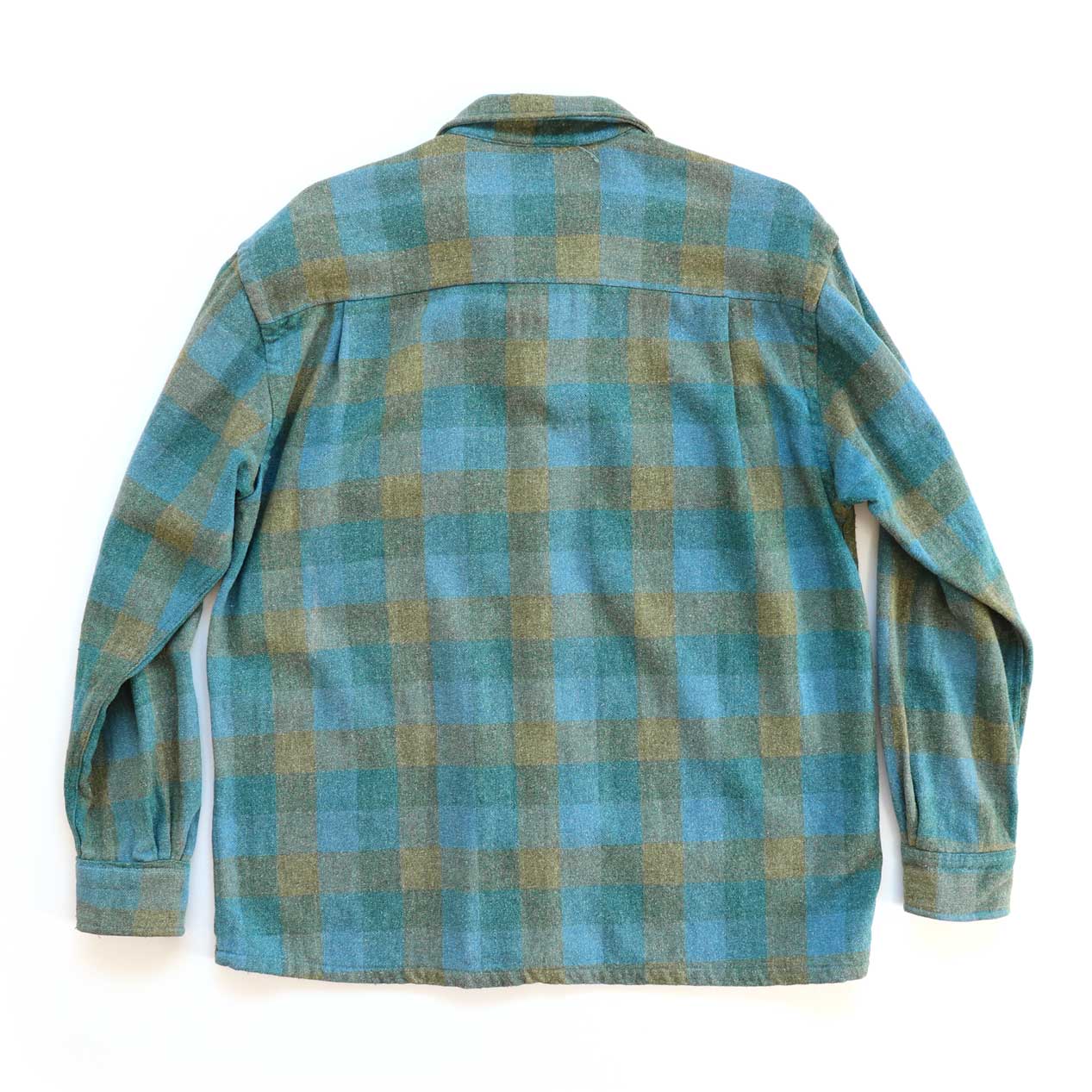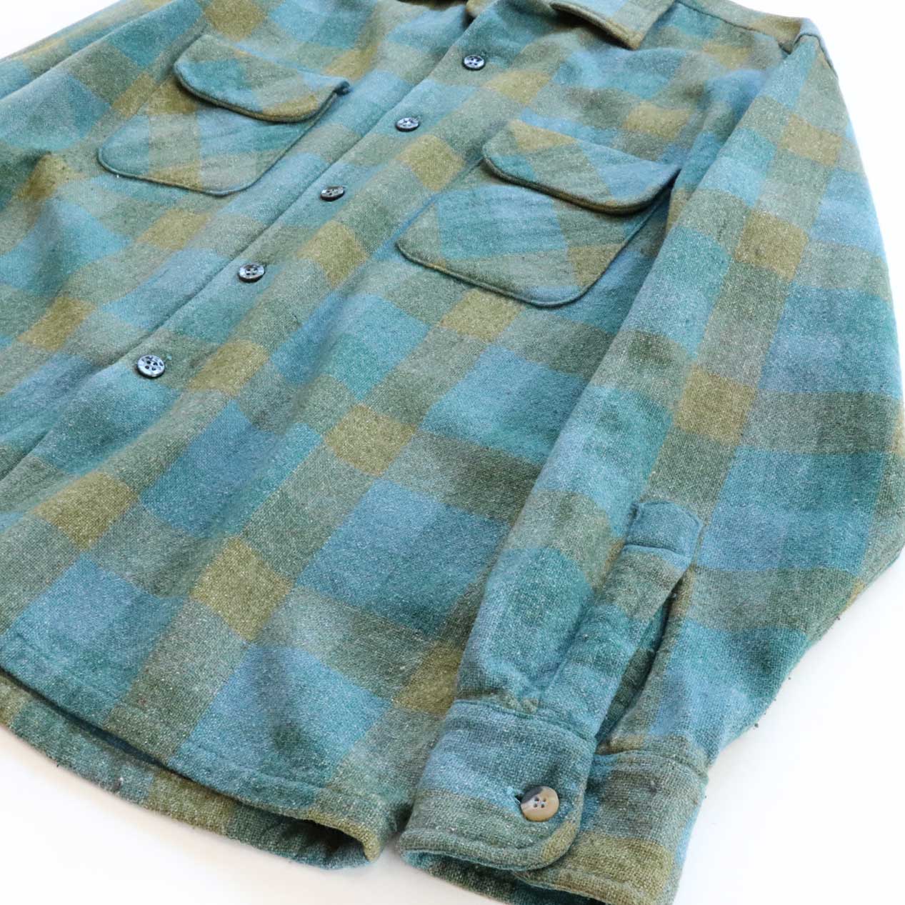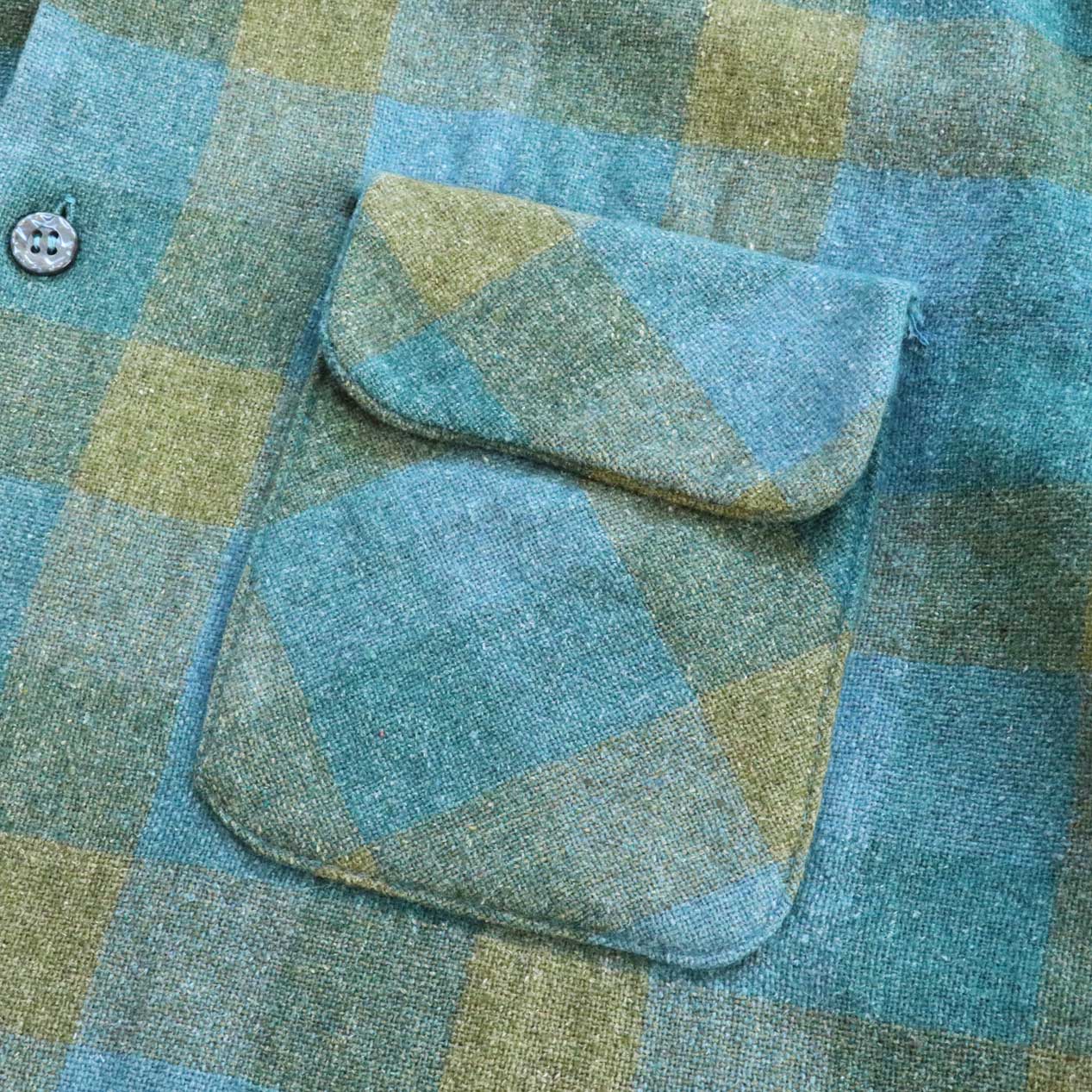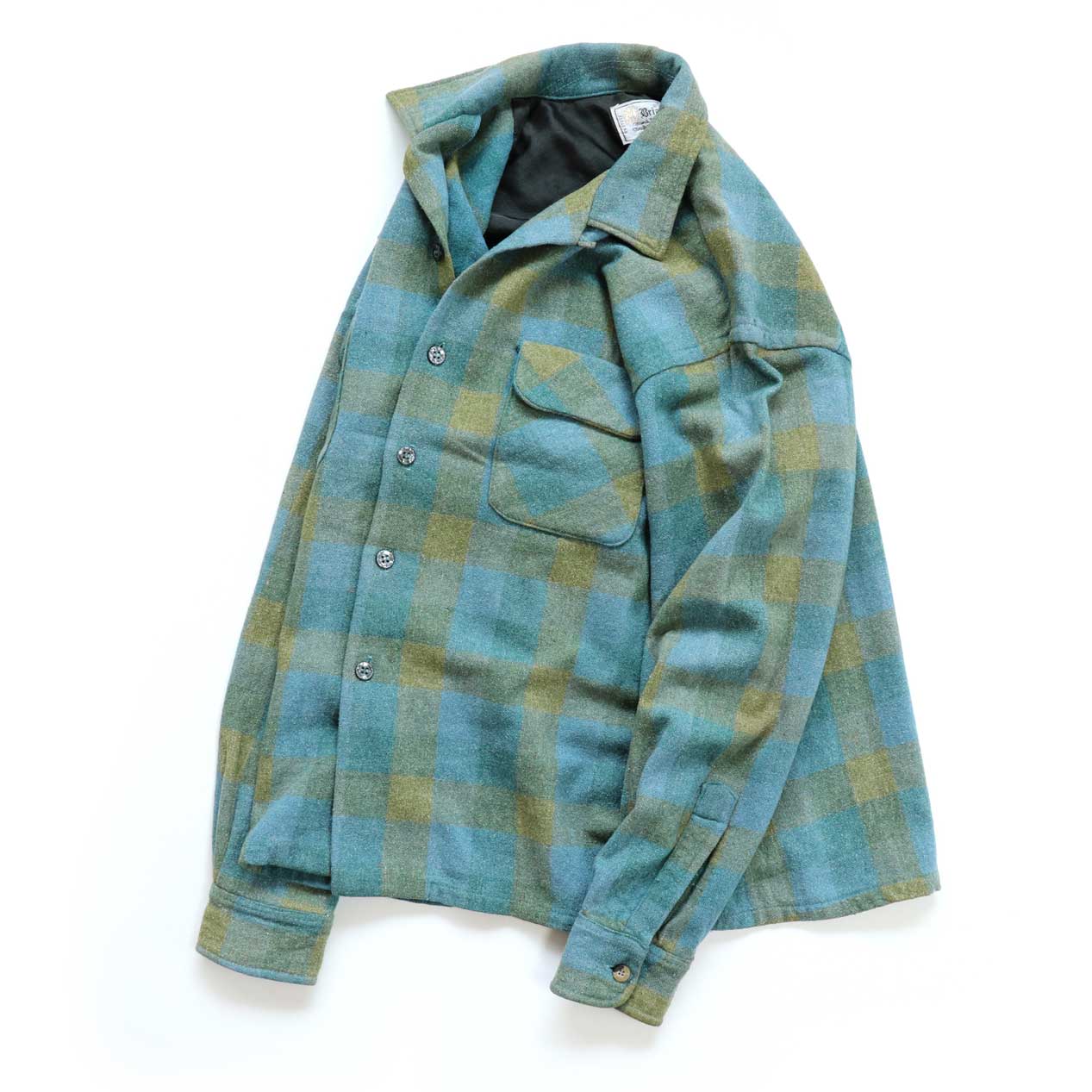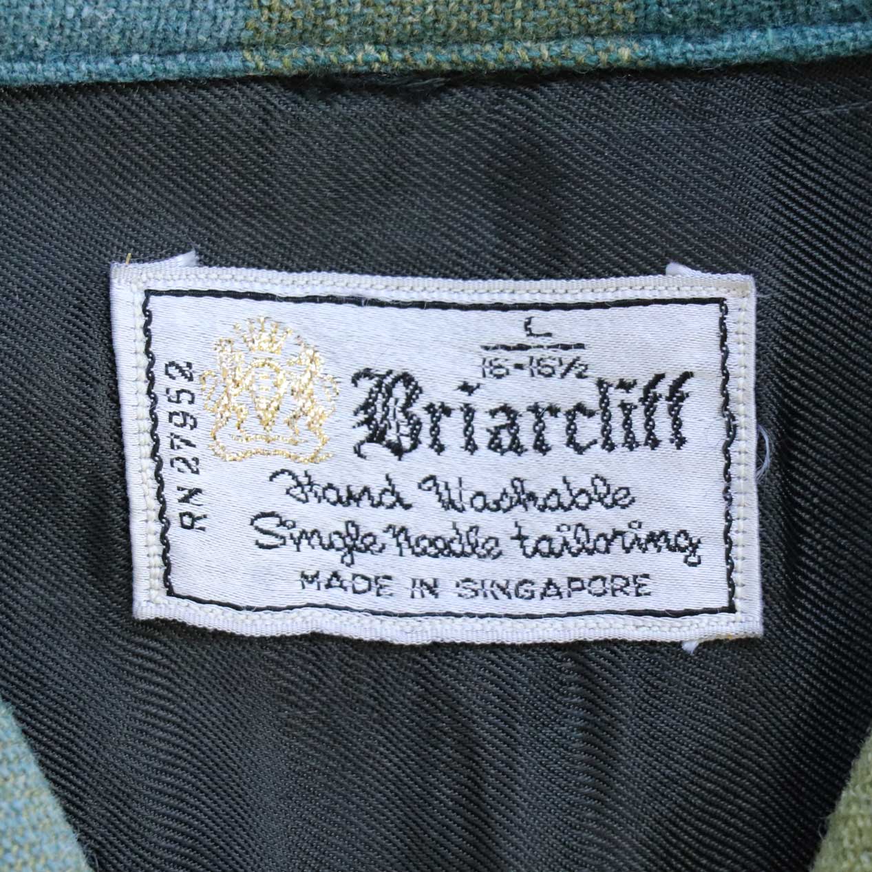 MODEL : BRIARCLIFF Open Collar Wool Shirt MANUFACTURE : Made In Singapore AGE : 70's SIZE : 16-1/2 L COLOR : ブルー×グリーン MATERIAL : --- (おそらくウール100%) COMMENT : 70年代、BRIARCLIFFのウールチェックシャツです。