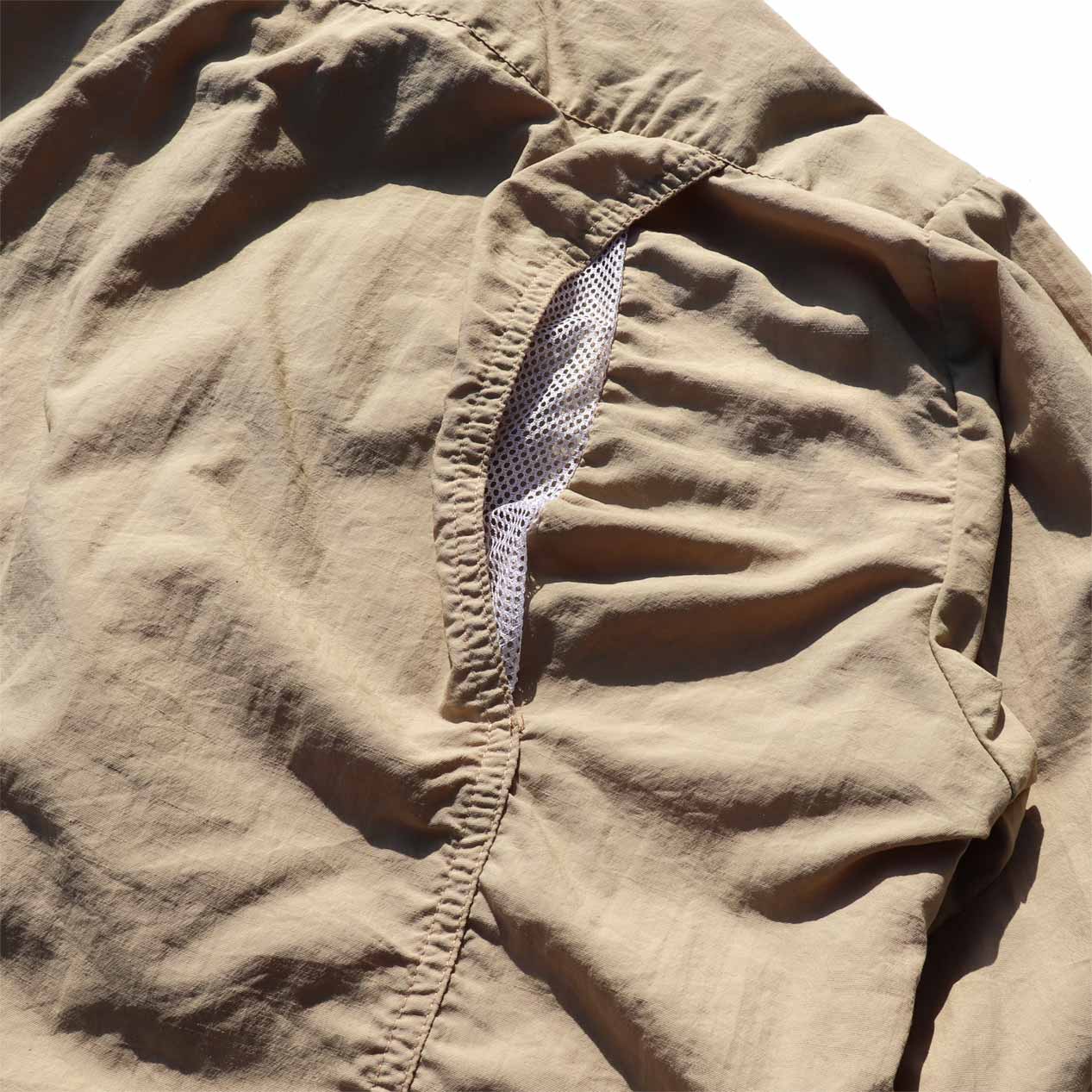 薄手ナイロン生地、サンドベージュ×蛍光ブルーの2トーンカラー。