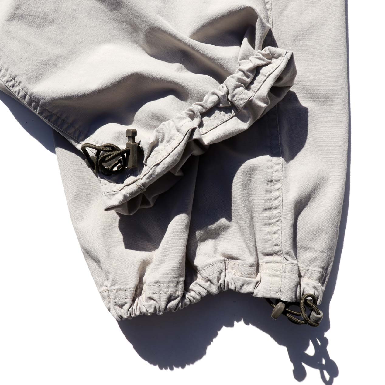 ウエストゴム+ドローコード、5ポケット、裾ゴム+ドローコード入り。