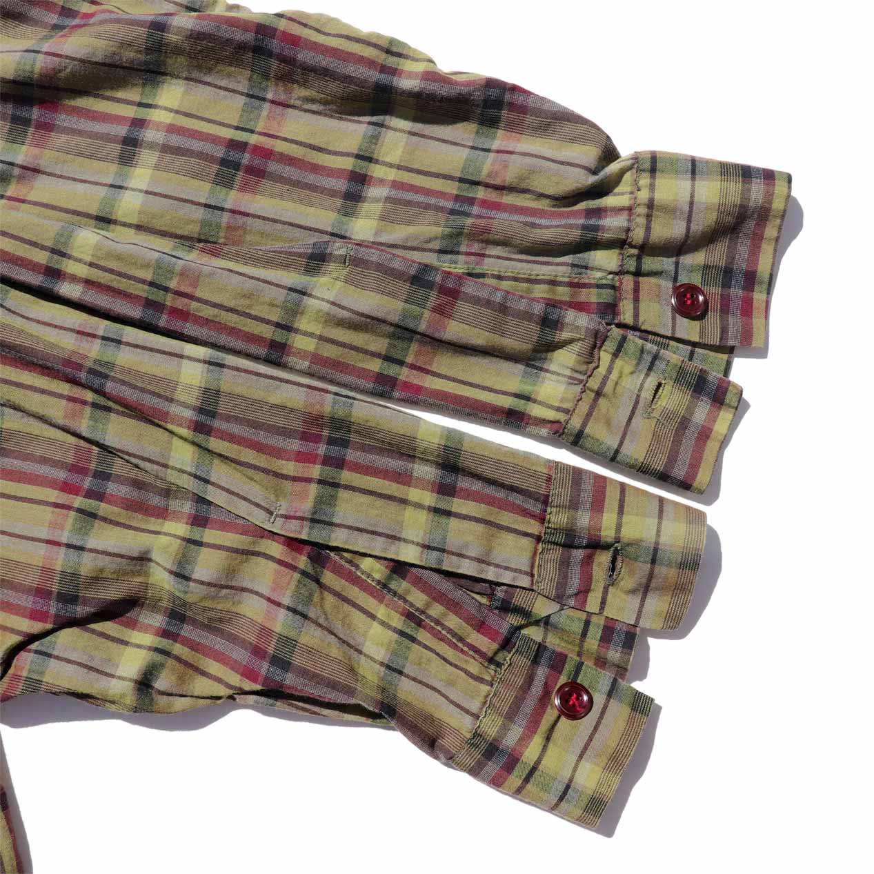 MODEL : PILGRIM Woven Plaid Open Collar Shirt MANUFACTURE : Made In U.S.A. AGE : 50's SIZE : 17-1/2 COLOR : オリーブ系 MATERIAL : --- (おそらくコットン 100%) COMMENT : 50年代、ピルグリムのL/Sシャツです。 先染めチェック生地、左胸にポケット付き。 オープンカラー、ボックスシルエット。 全体的に着用感はありますが特筆するダメージや汚れはありません。 枯れたような渋めの色合いが魅力のPILGRIMオープンカラーシャツ。 17-1/2のグッドサイズです。 コンディションも良くおすすめの一品です。 ●BLOGでもご紹介しておりますので是非ご覧ください● SIZE DETAILS Size Chart 身幅 : 62cm 着丈 : 71.5cm 肩幅 : 49cm 袖丈 : 61cm ※着用モデル(男性):身長176cm / 体重54kg CONDITION Condition Chart Rank "B" 着用感はあるが、汚れ・ダメージ・色褪せ等の無いまたは軽微な良好状態(下記詳細) ・全体 : 着用感 ※その他詳細や詳しい画像をご覧になりたい場合はContact Formからお気軽にお問い合わせ下さい。