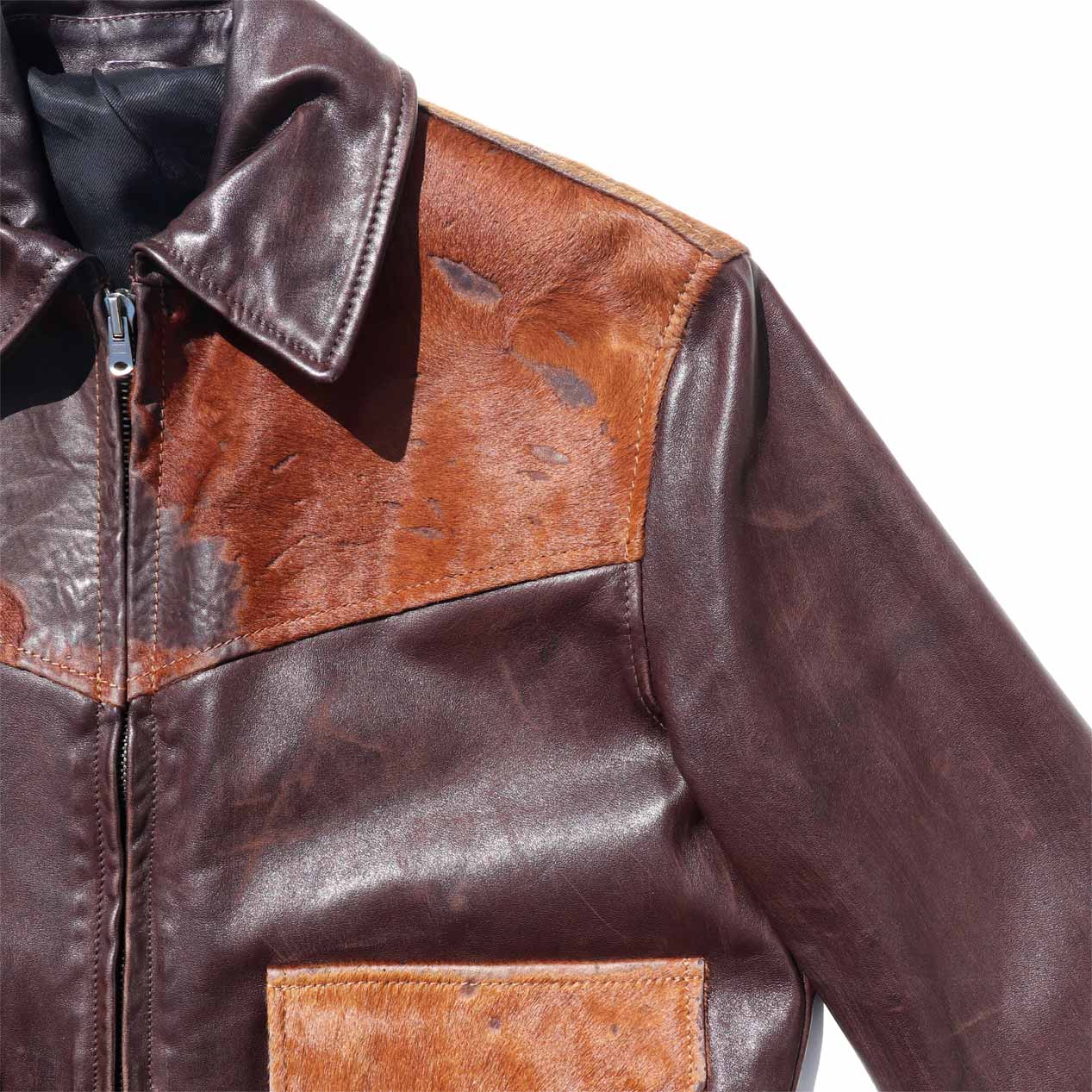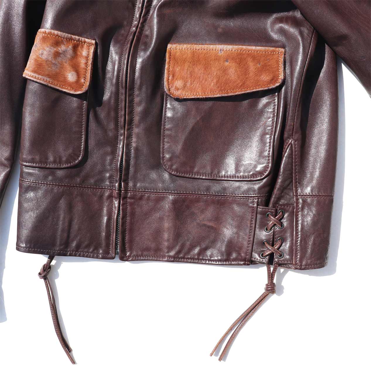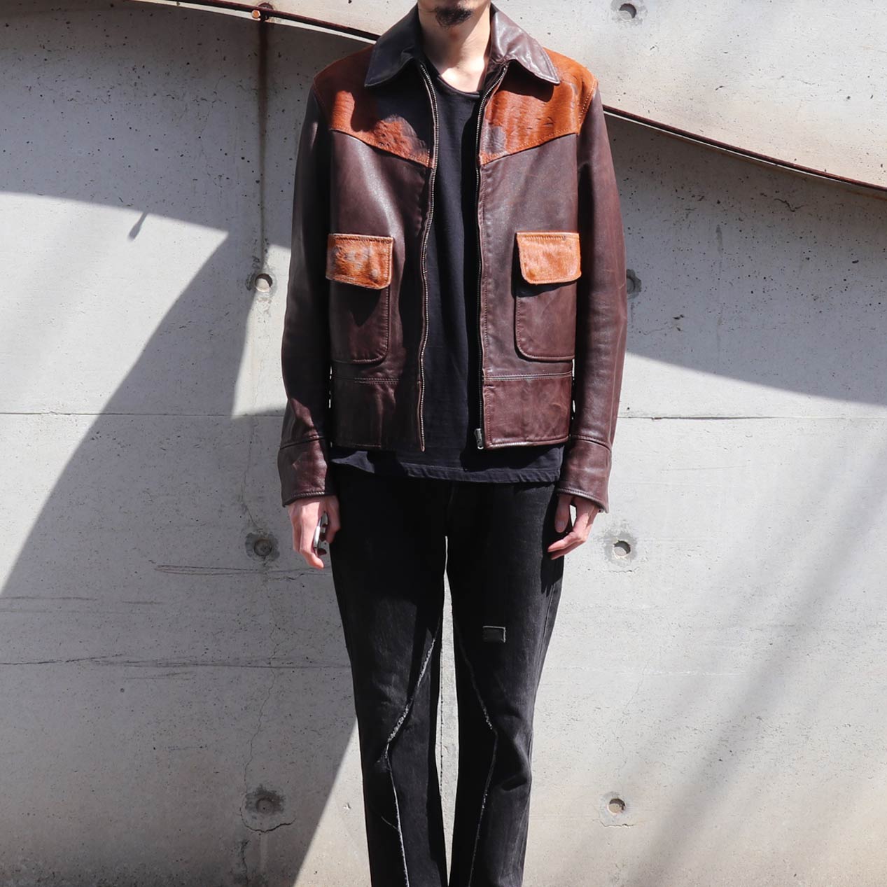 2006年AWモデル、レザー+ハラコ切替、レザー部分全体に傷加工、フロントririジップ、2ポケット、サイドレースアップ、袖先ドットボタン留め。