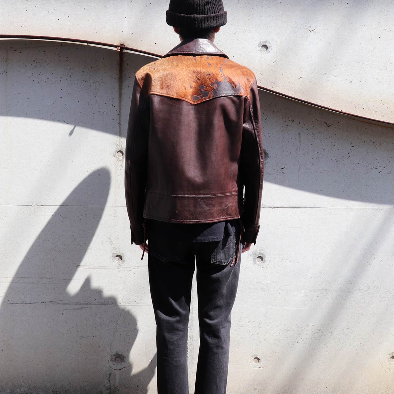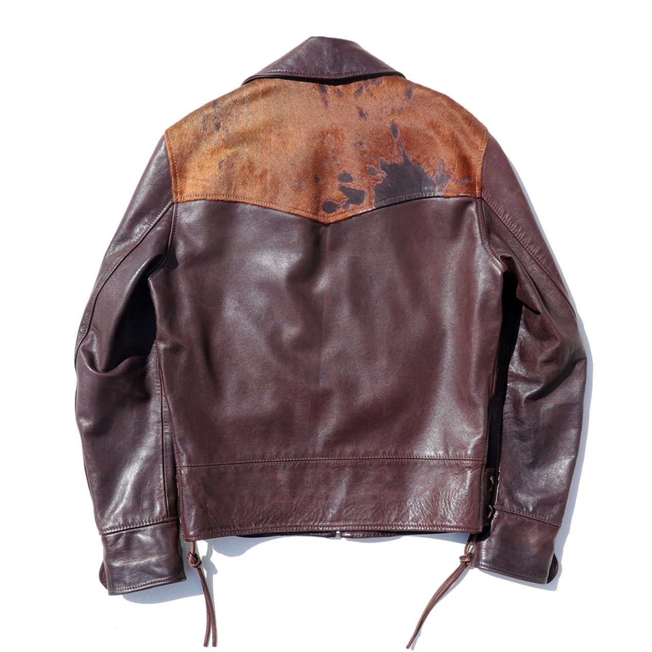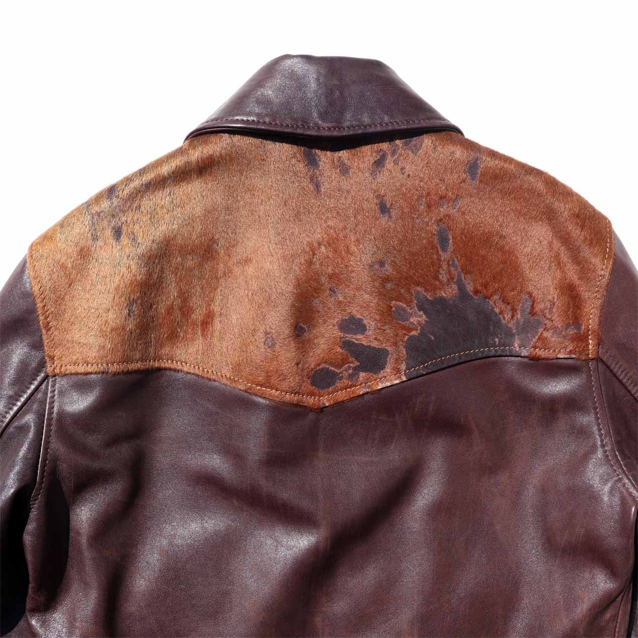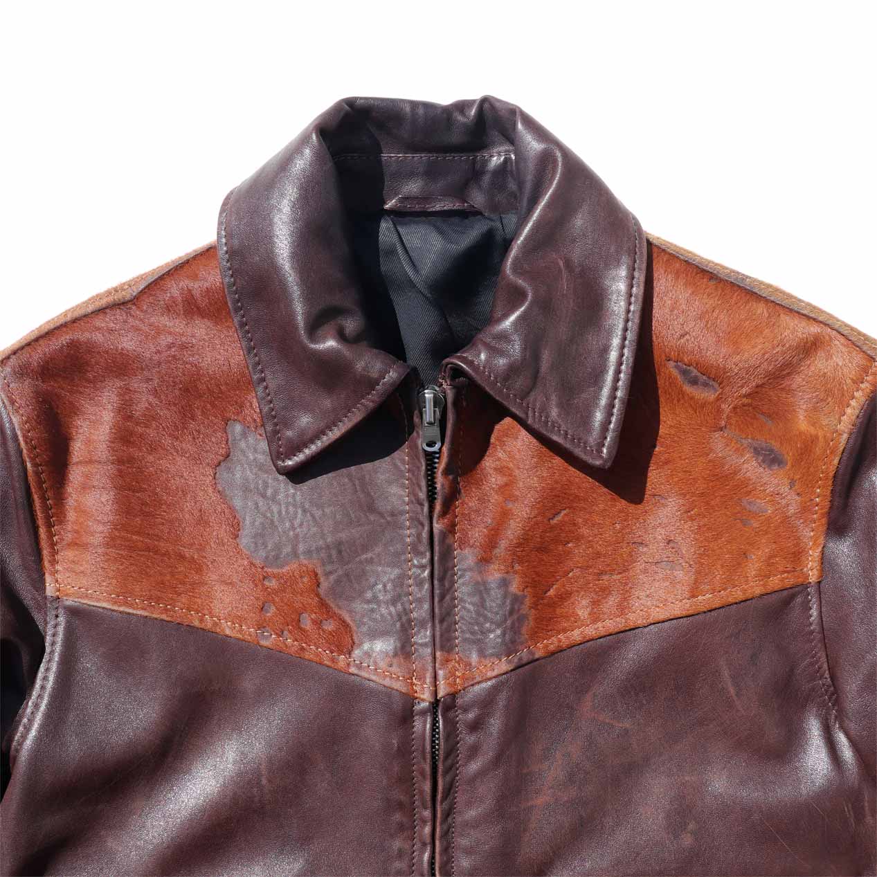 2006年AWモデル、レザー+ハラコ切替、レザー部分全体に傷加工、フロントririジップ、2ポケット、サイドレースアップ、袖先ドットボタン留め。