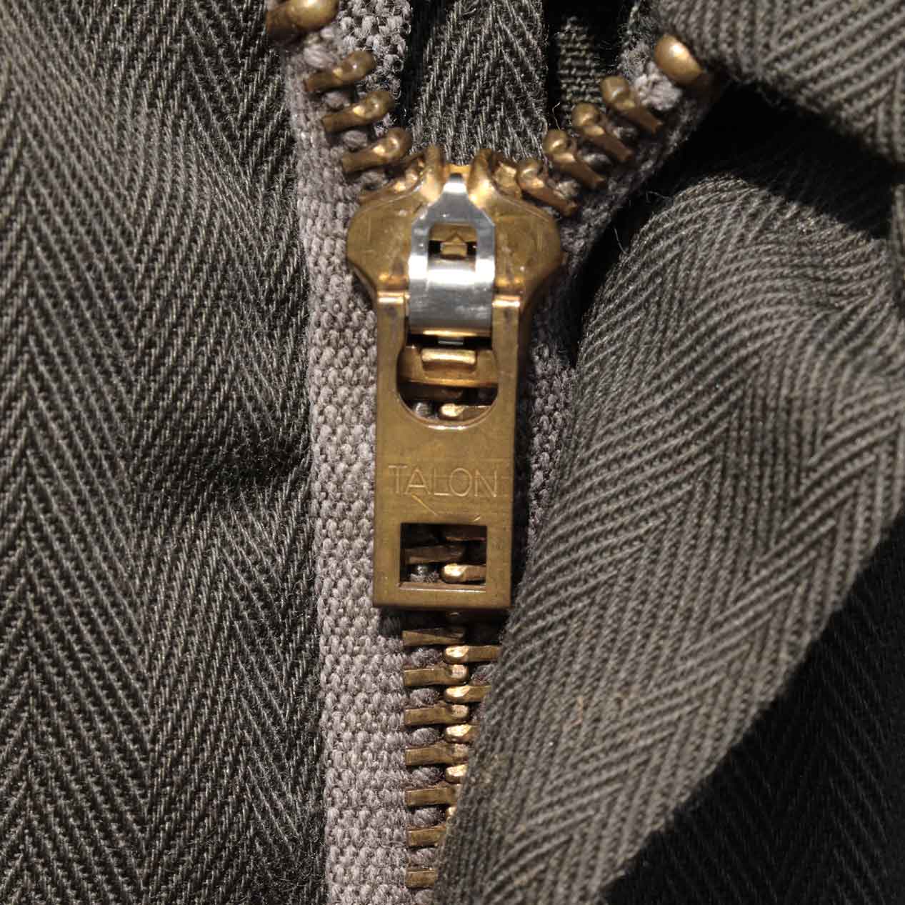 生地はドレープの綺麗なコットン/ポリのヘリンボーンツイル、フロントジップはTALON、袖先はドットボタン仕様です。