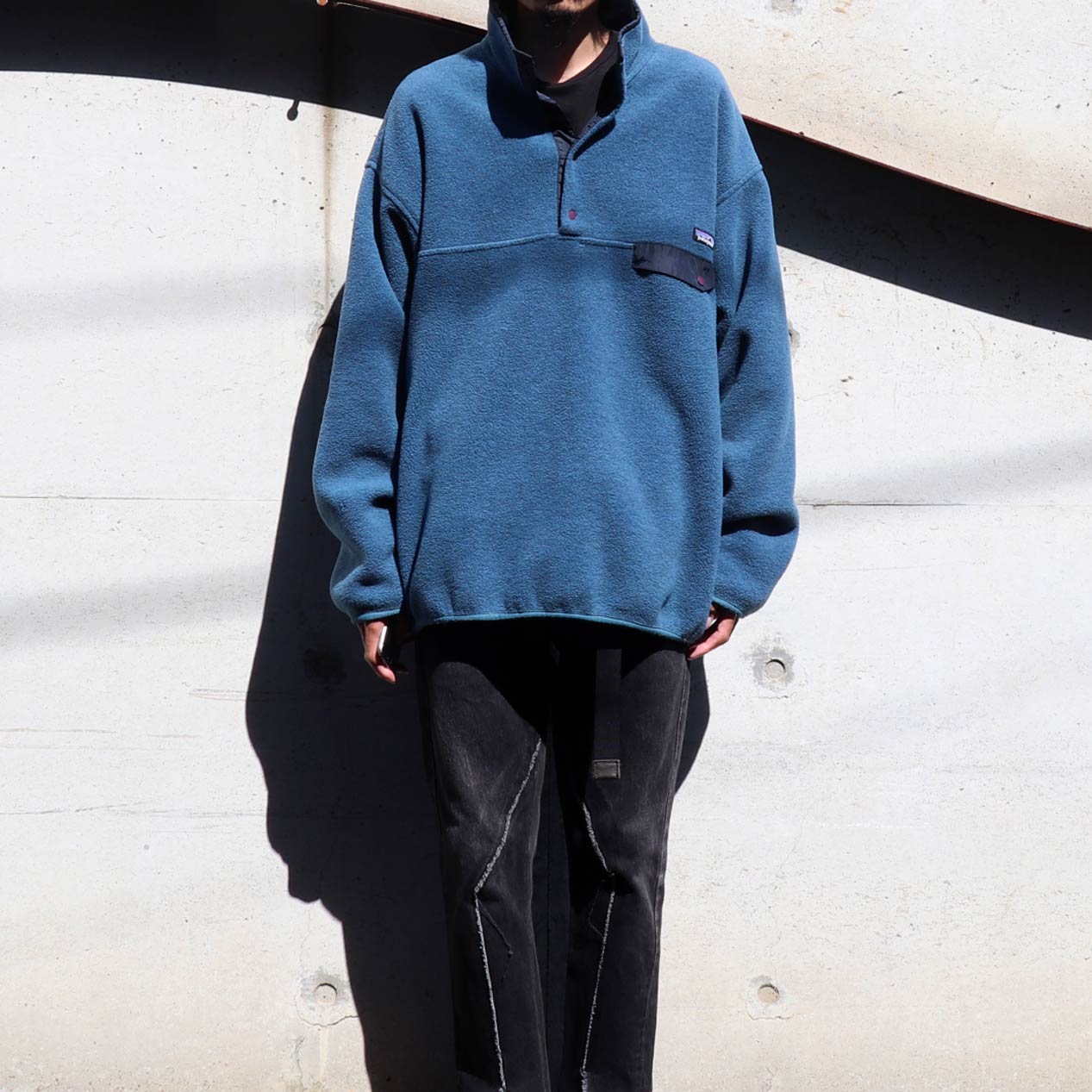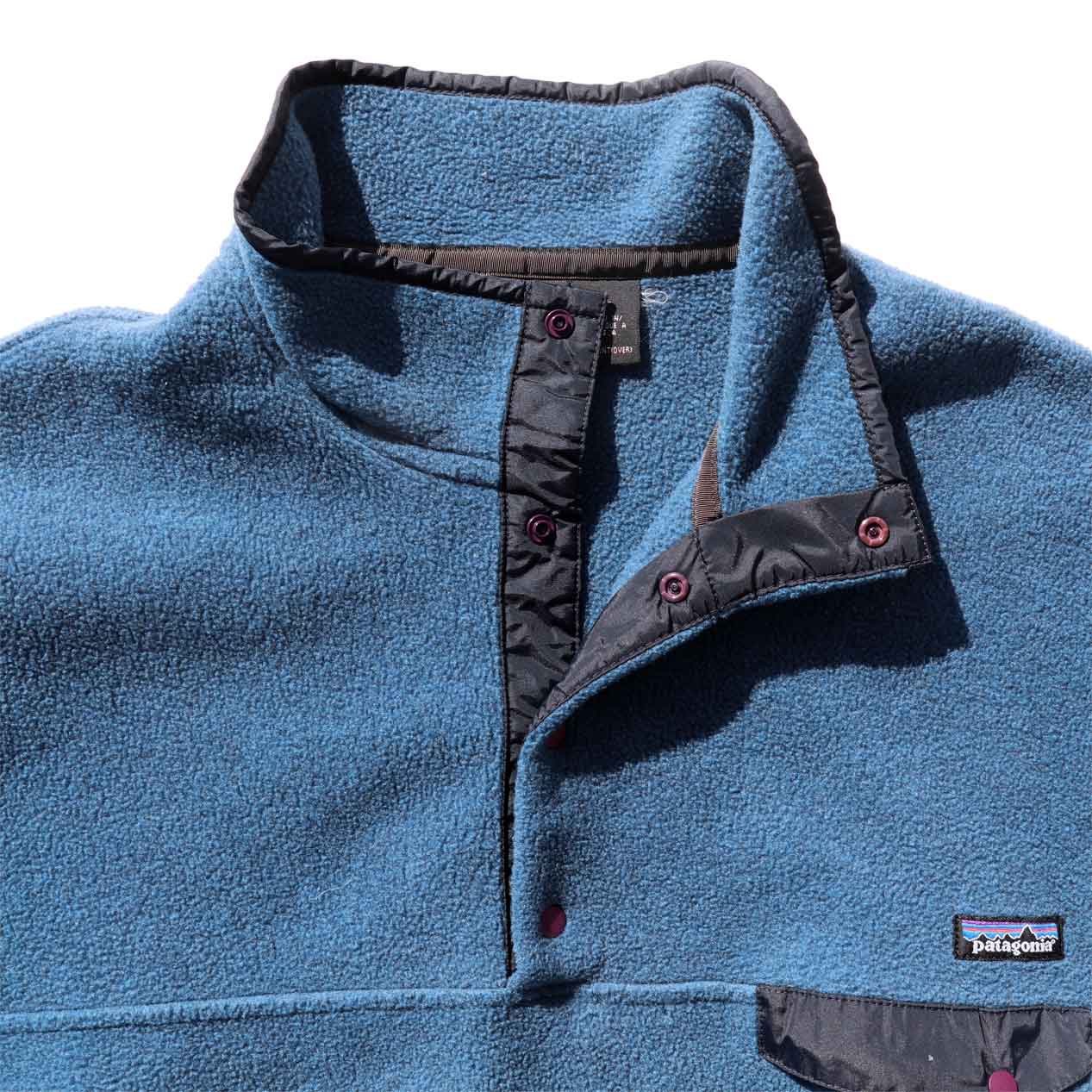 MODEL : PATAGONIA Synchilla Snap-T MADE IN : U.S.A. AGE : 00's SIZE : XL COLOR : グレイッシュブルー/ダークネイビー MATERIAL : ポリエステル 100% COMMENT : 2001年(FA01) パタゴニア シンチラスナップT