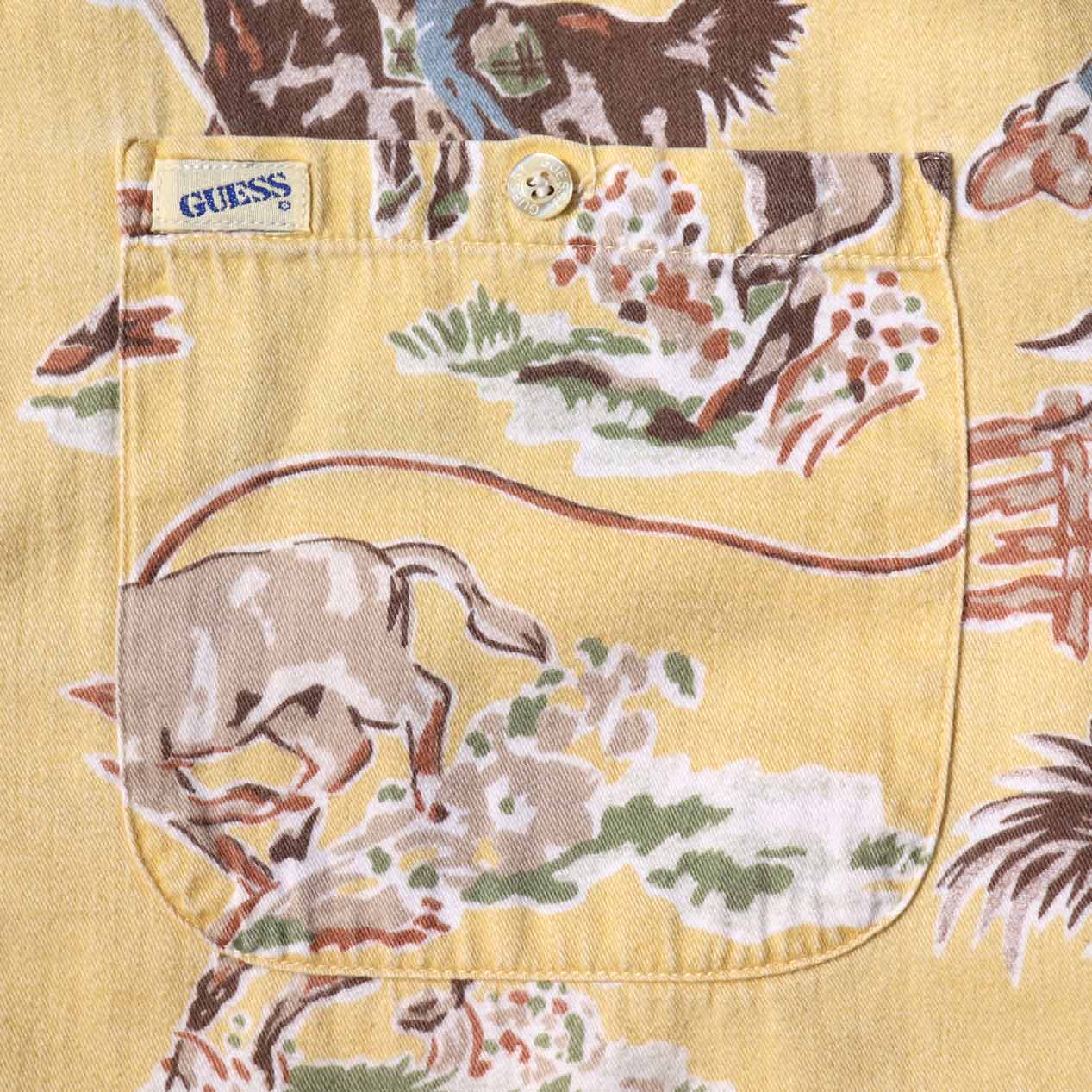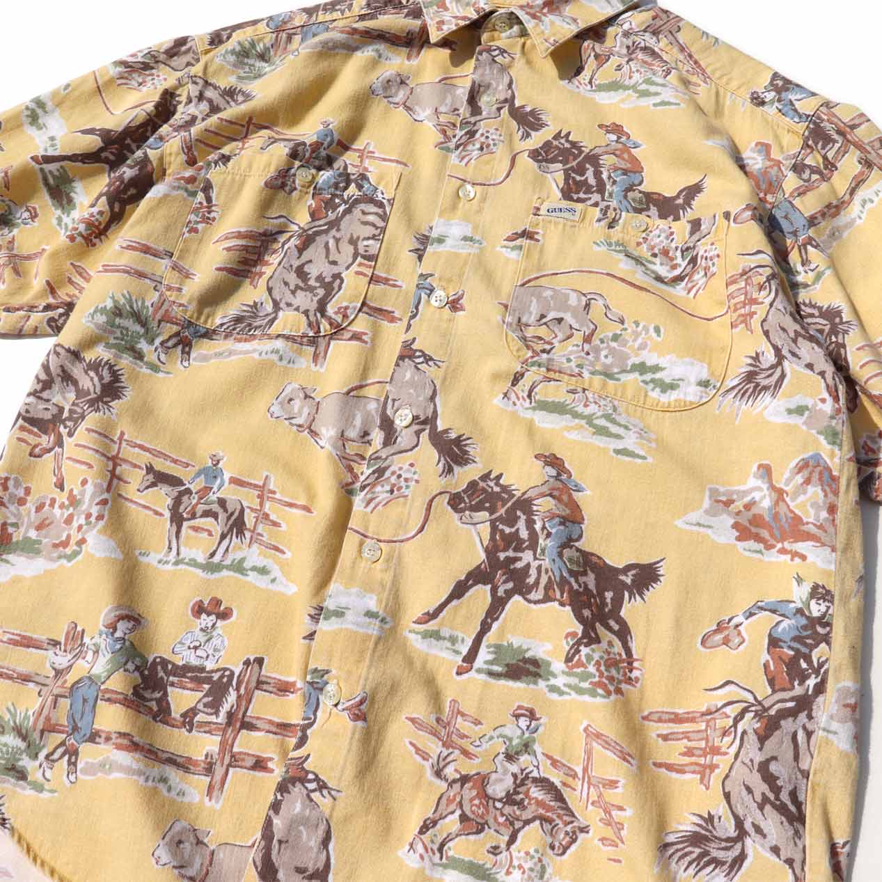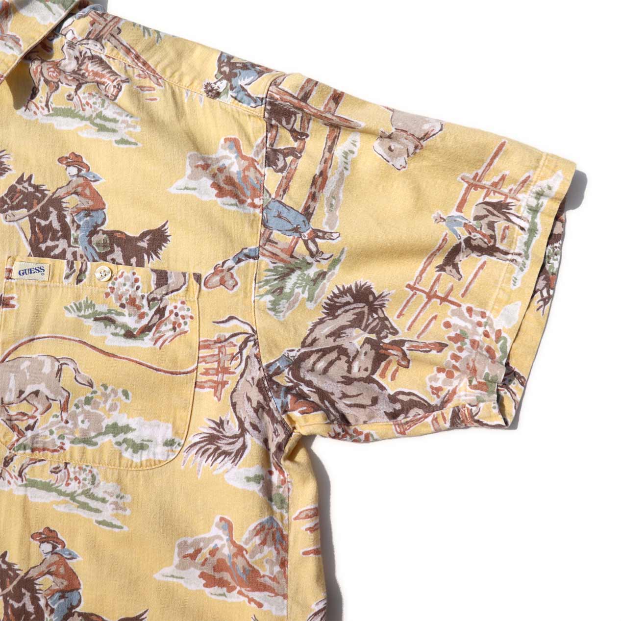 MODEL : GUESS カウボーイ柄 フランネルシャツ MANUFACTURE : Made In U.S.A. AGE : 90's SIZE : S COLOR : ライトイエロー MATERIAL : コットン 100& COMMENT : 90年代、ゲスのフランネルシャツです。