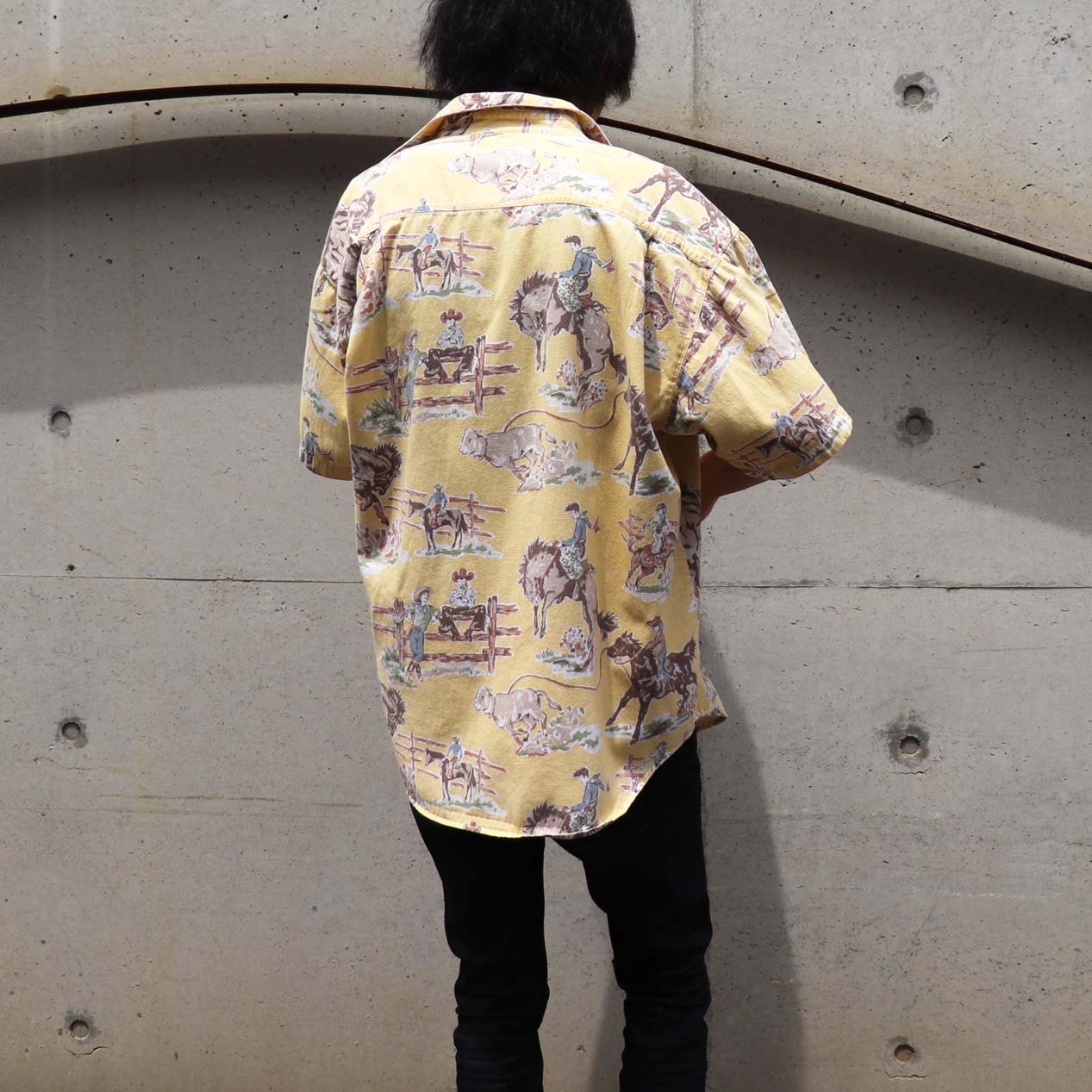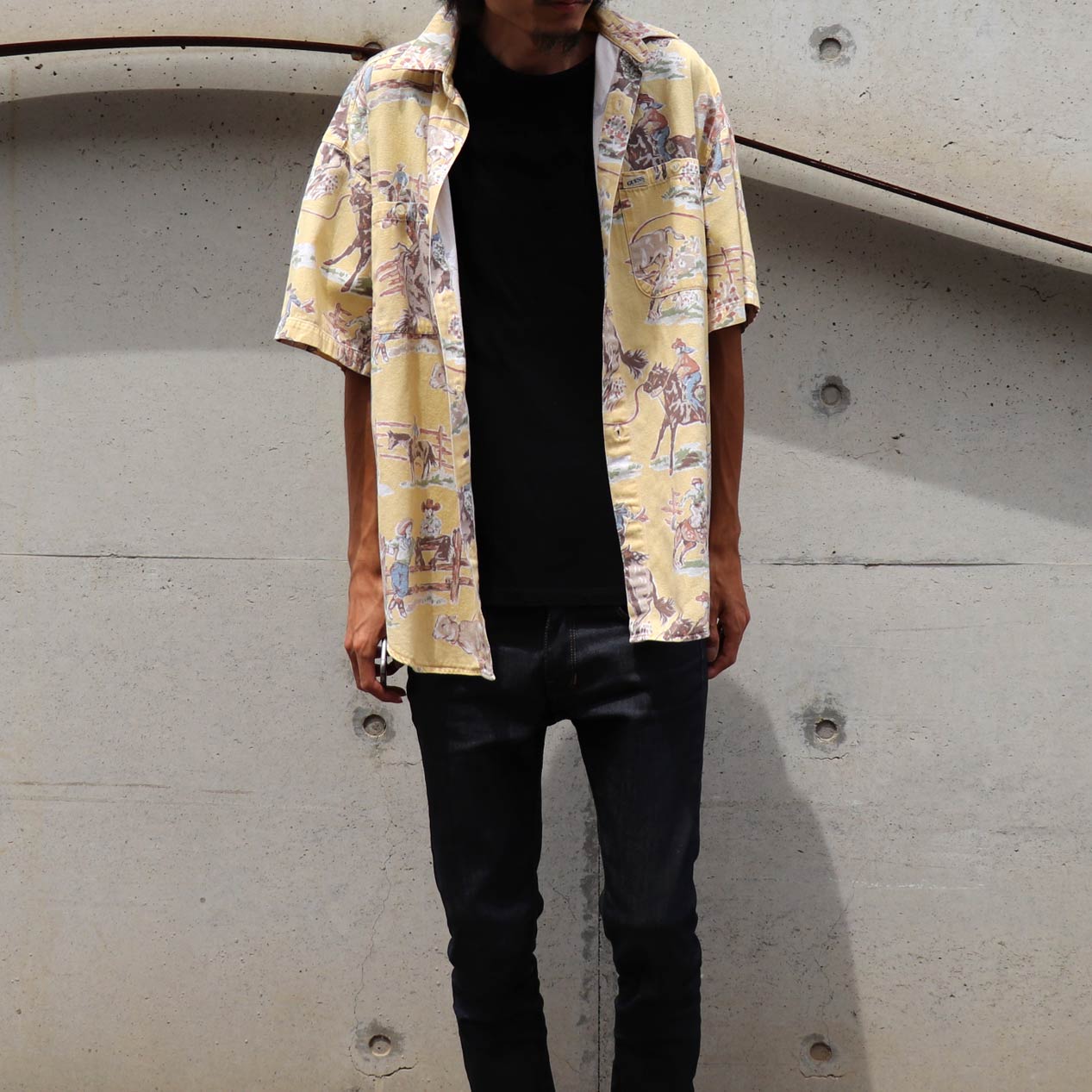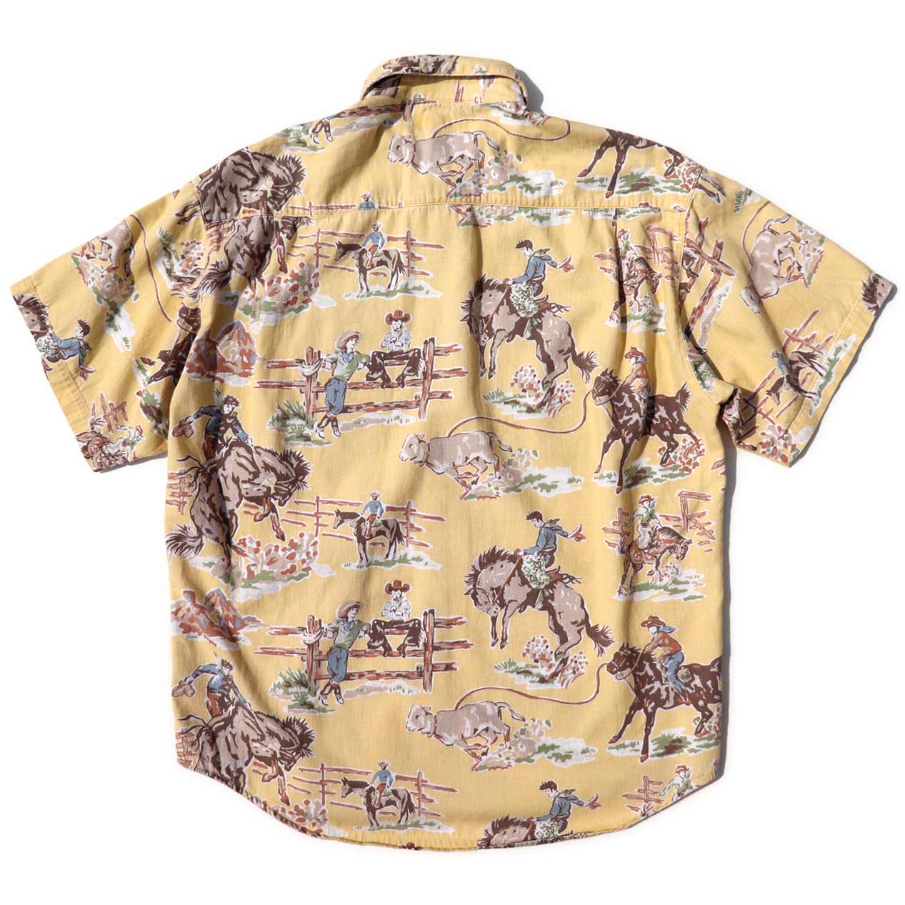 MODEL : GUESS カウボーイ柄 フランネルシャツ MANUFACTURE : Made In U.S.A. AGE : 90's SIZE : S COLOR : ライトイエロー MATERIAL : コットン 100& COMMENT : 90年代、ゲスのフランネルシャツです。