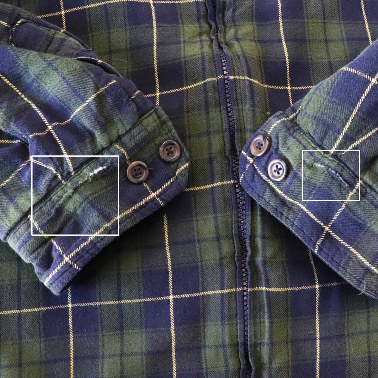 ・袖: 両袖カフスに破れ手縫いリペア跡