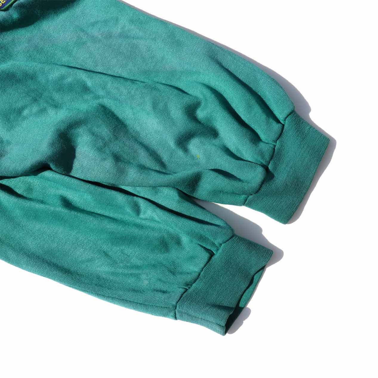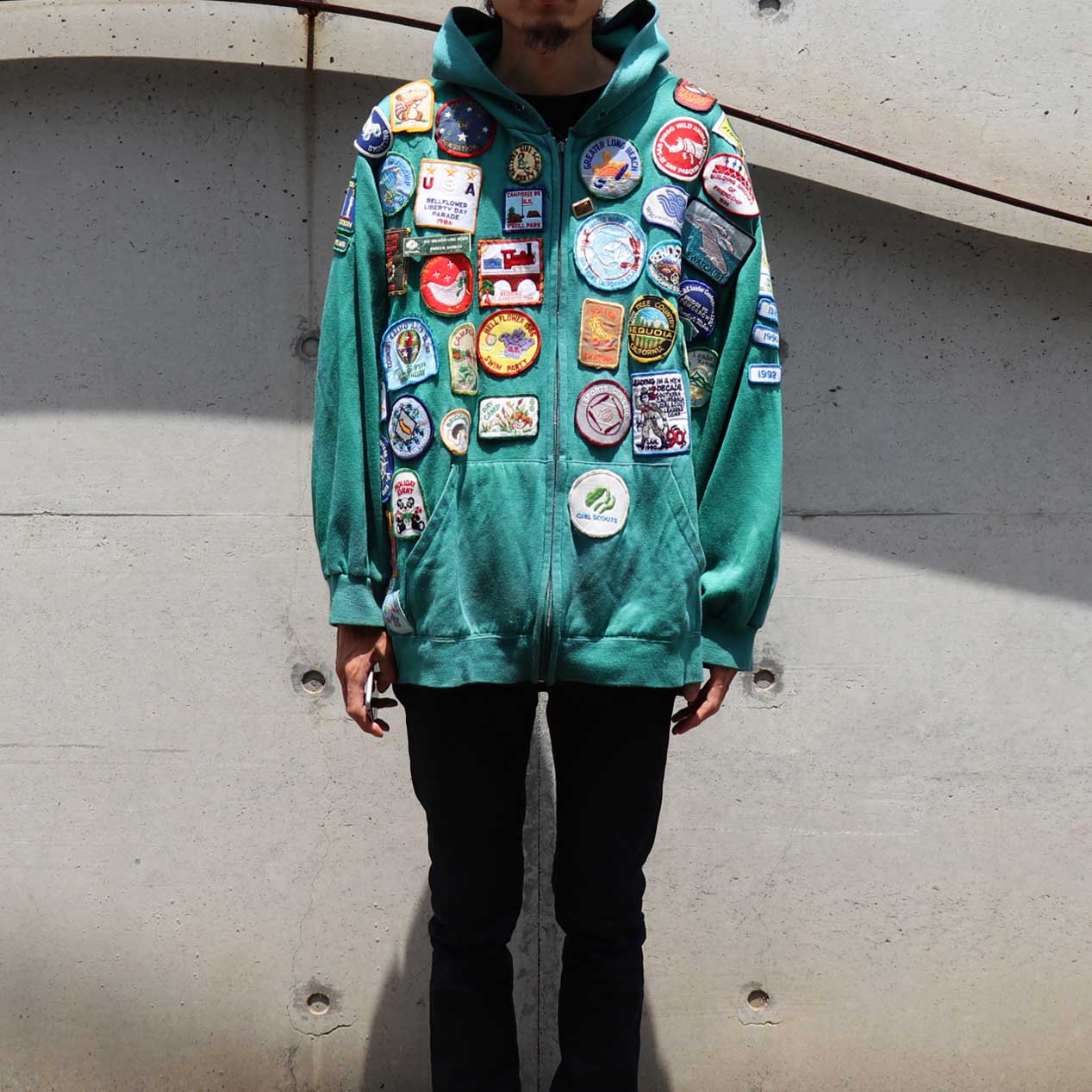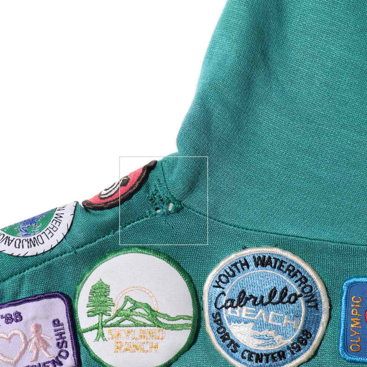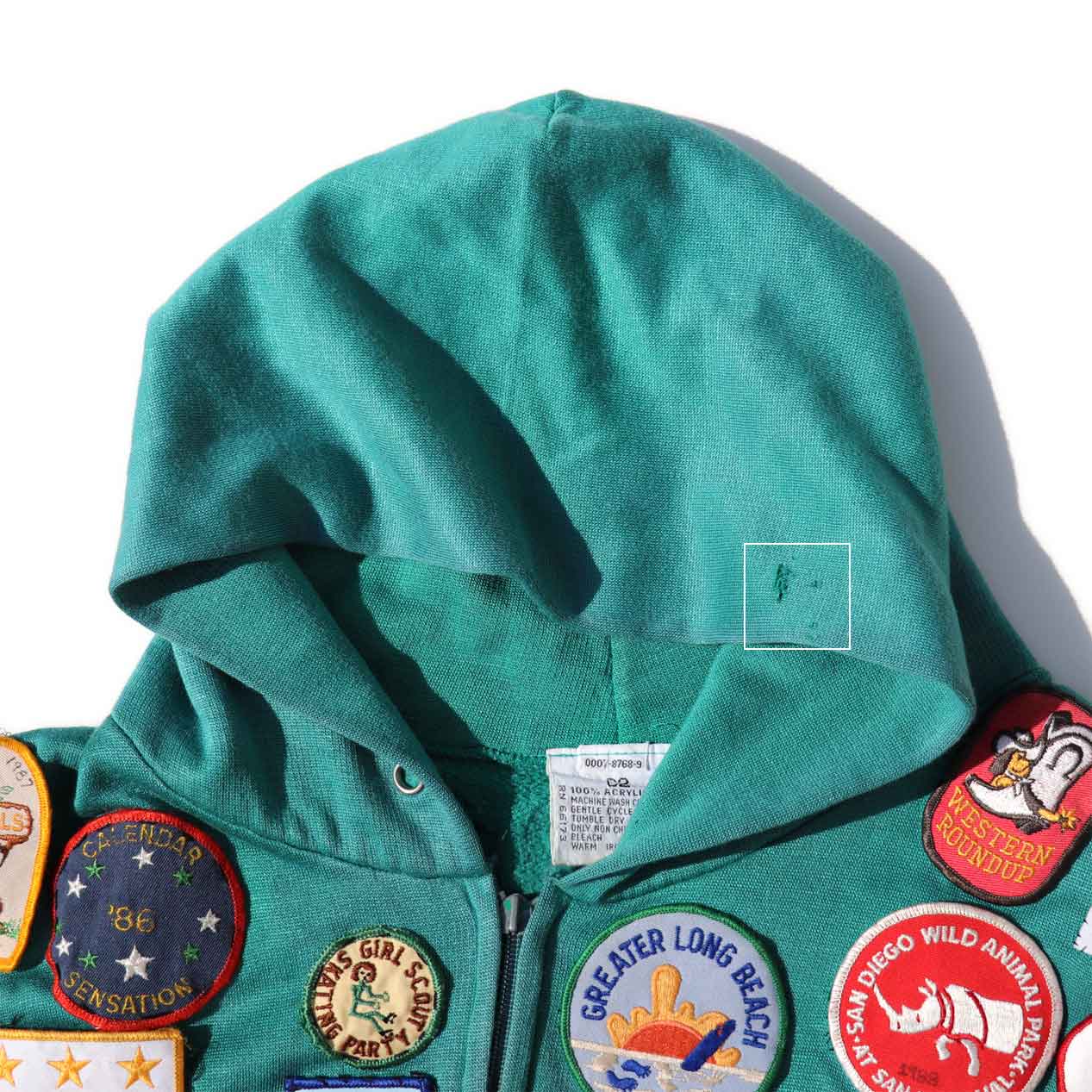 MODEL : UNKNOWN ワッペンカスタム ジップパーカ MANUFACTURE : Made In Hong Kong AGE : 80's SIZE : --- (XL~XXL相当) COLOR : エメラルドグリーン MATERIAL : アクリル 100% COMMENT : 80年代、ブランド不明のジップアップパーカです。