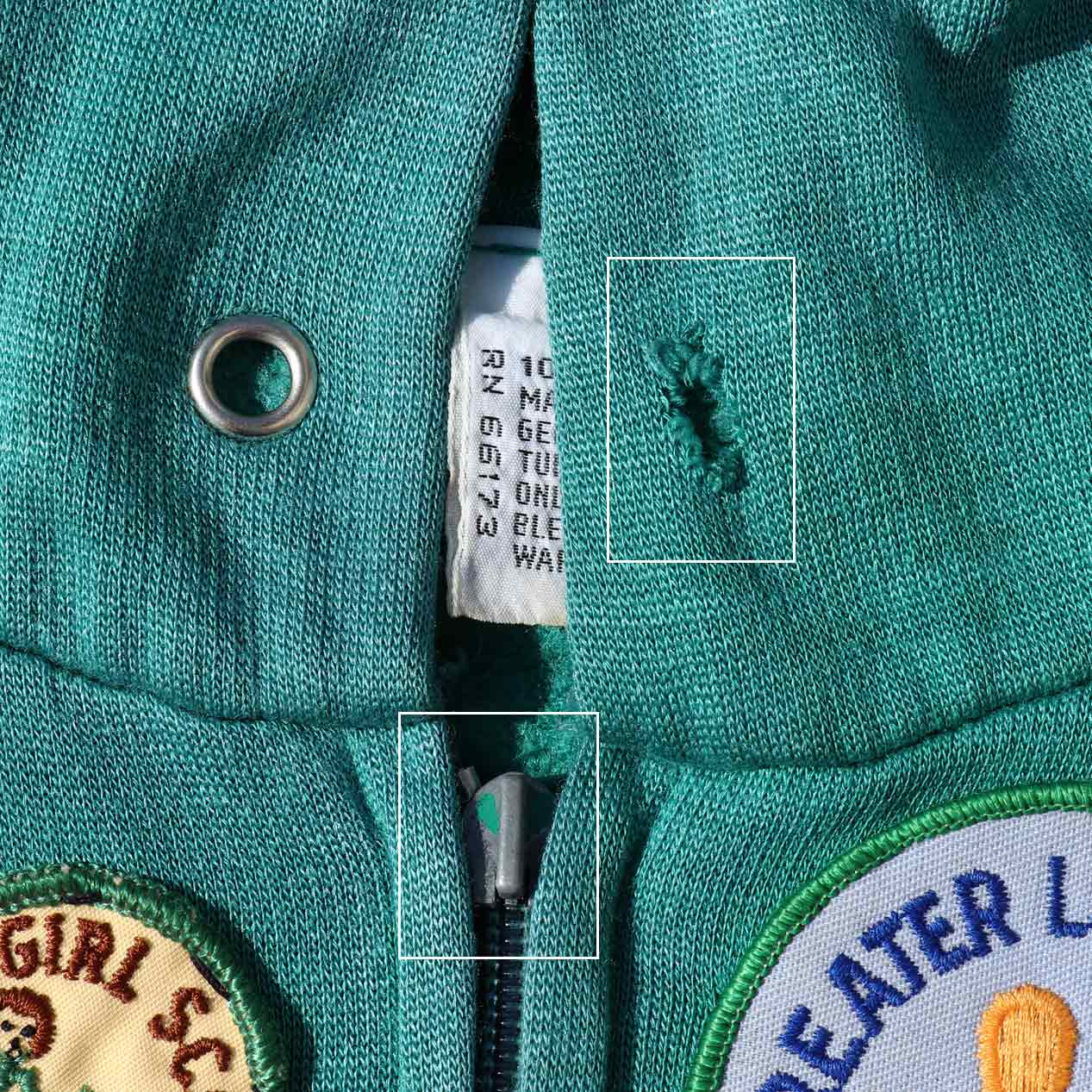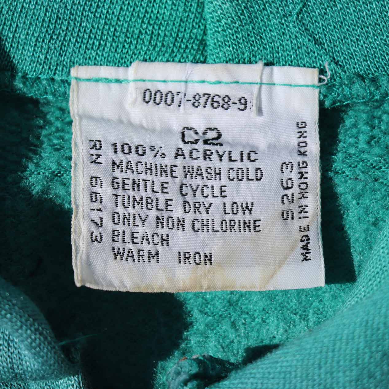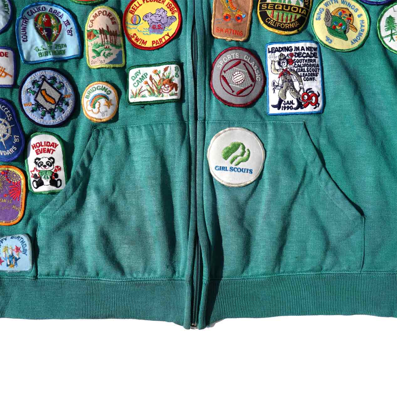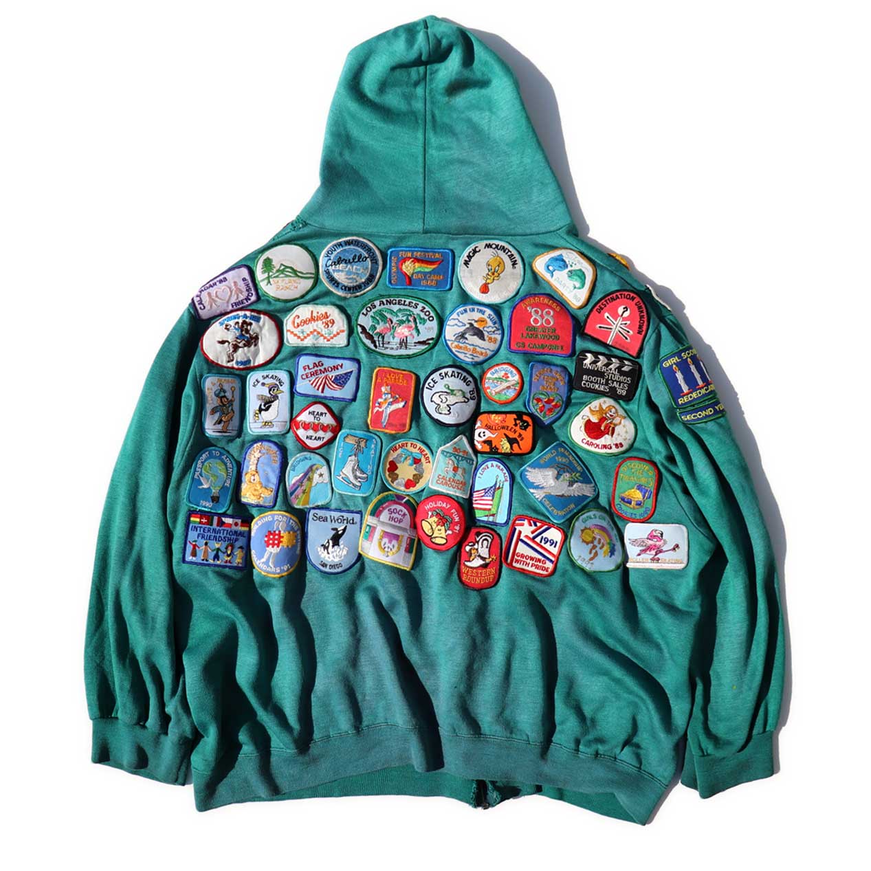 MODEL : UNKNOWN ワッペンカスタム ジップパーカ MANUFACTURE : Made In Hong Kong AGE : 80's SIZE : --- (XL~XXL相当) COLOR : エメラルドグリーン MATERIAL : アクリル 100% COMMENT : 80年代、ブランド不明のジップアップパーカです。