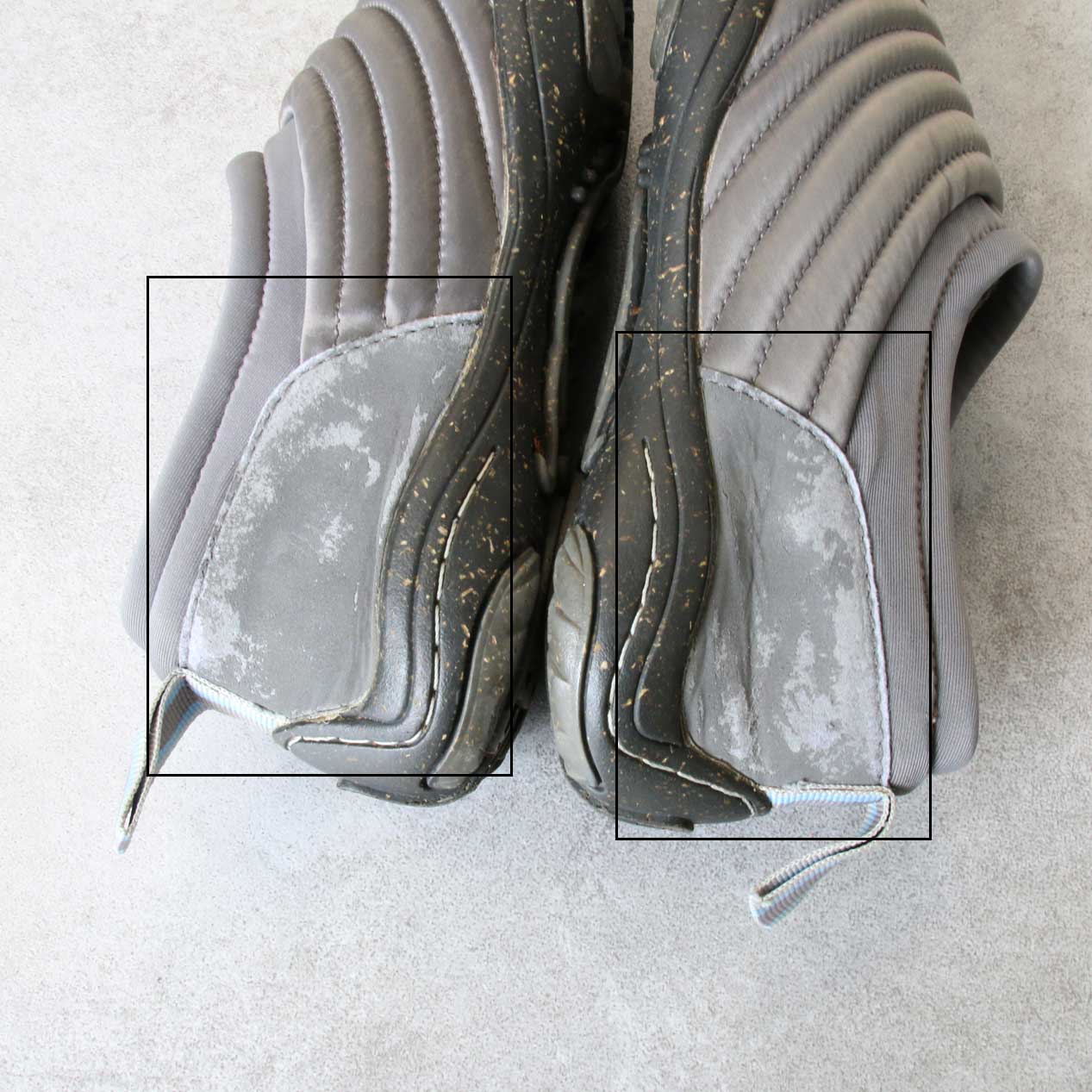 ・全体: 着用感、両足バックサイド生地剥離