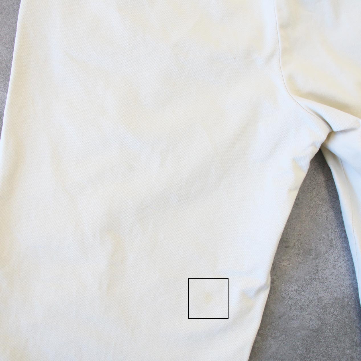 ・バック: 左膝裏付近にごく薄い汚れ、左脚裾に軽微な汚れ、右脚裾に軽微なスレ