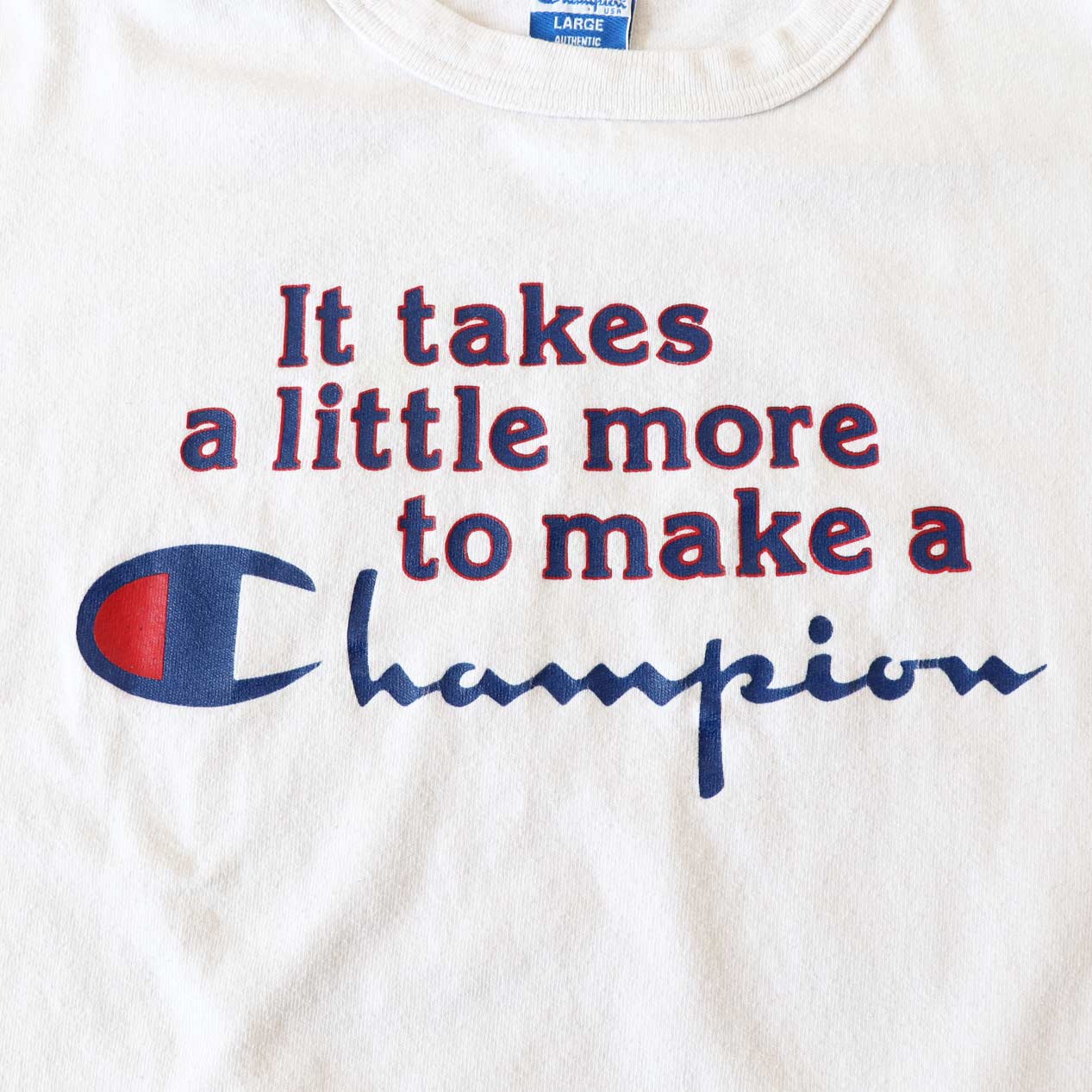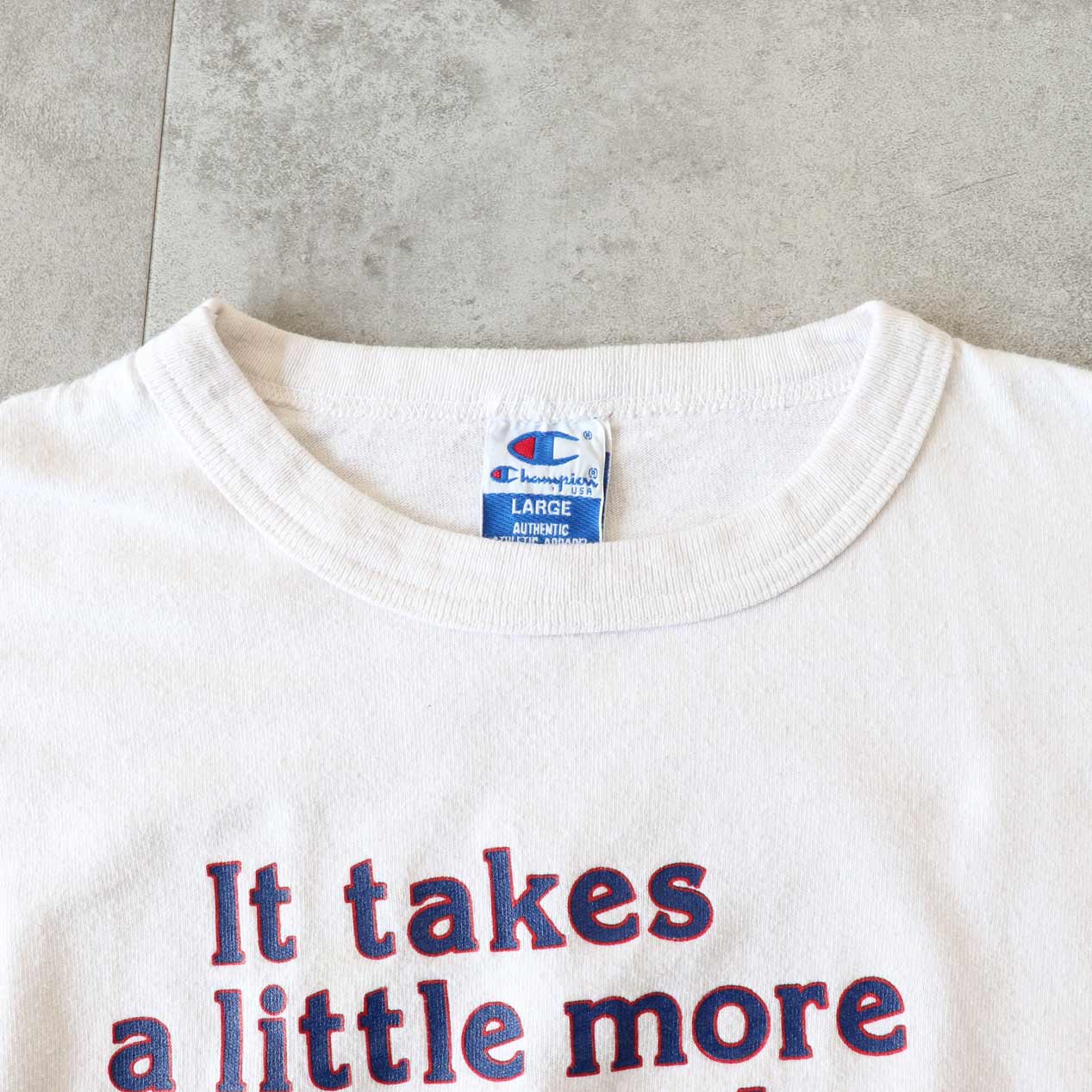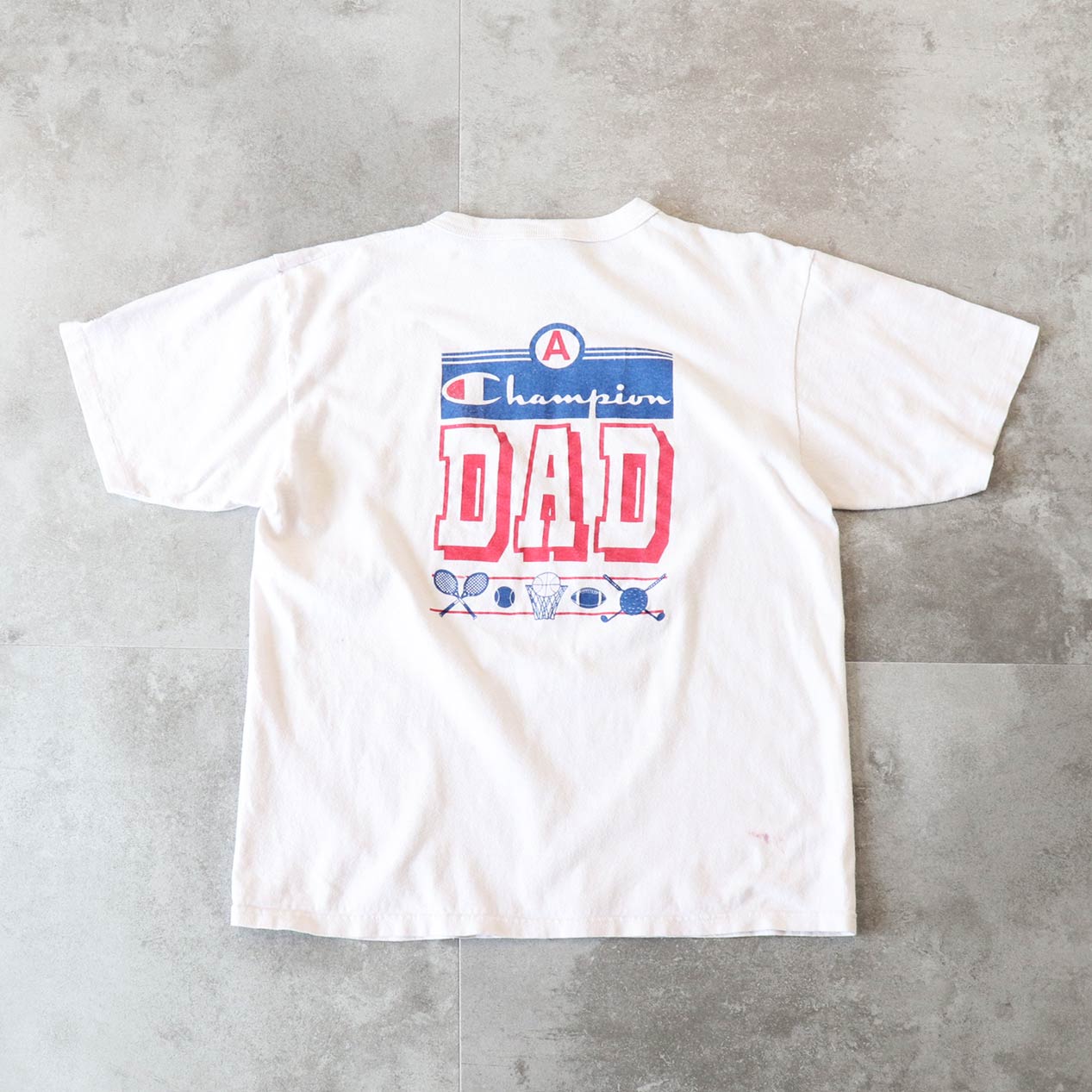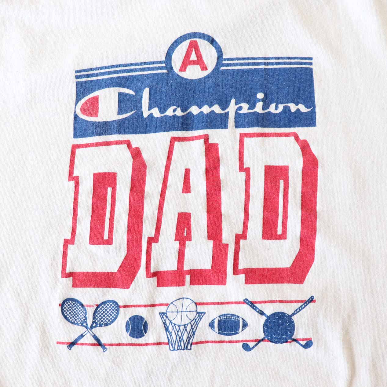 MODEL: CHAMPION “IT TAKES A LITTLE MORE TO MAKE A CHAMPION / DAD” T-Shirt MADE IN: U.S.A. AGE: 90's SIZE: L COLOR: ホワイト MATERIAL: コットン 100% COMMENT: 90年代 チャンピオン