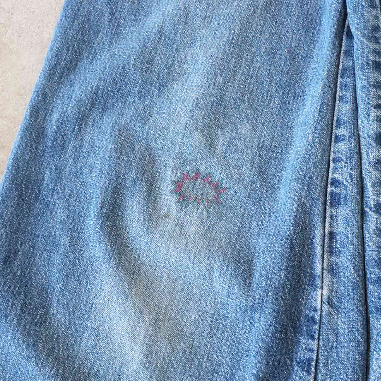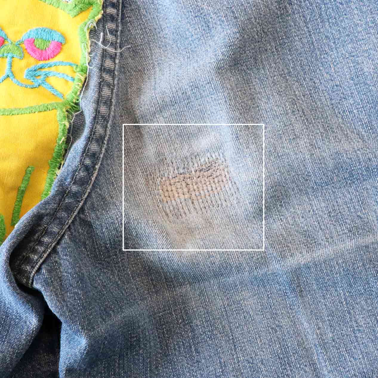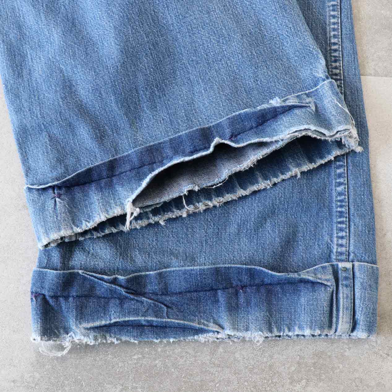 ・全体: 着用感、色褪せ、ウエスト両脇・右ヒップにミシンリペア跡、両脚裾に破れ