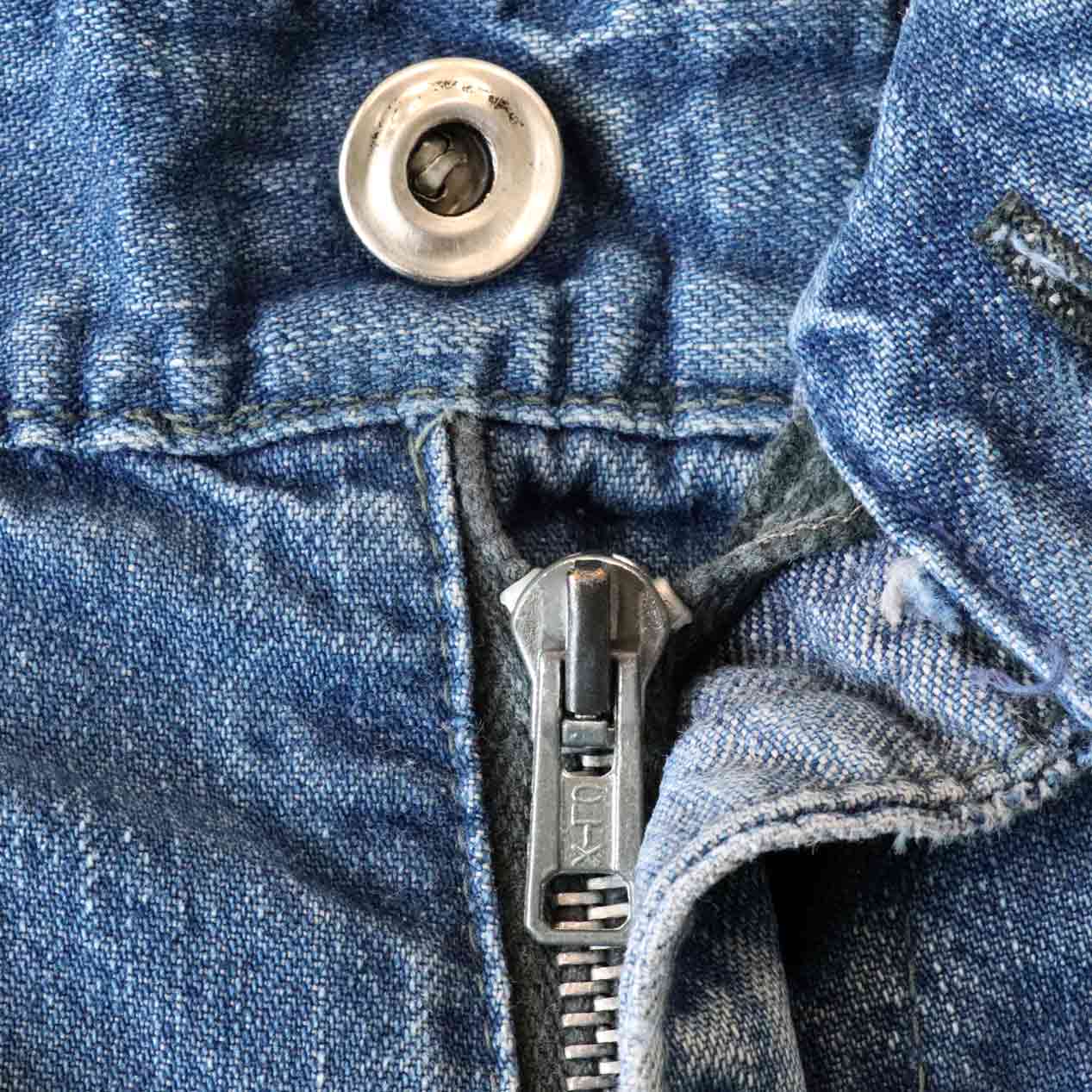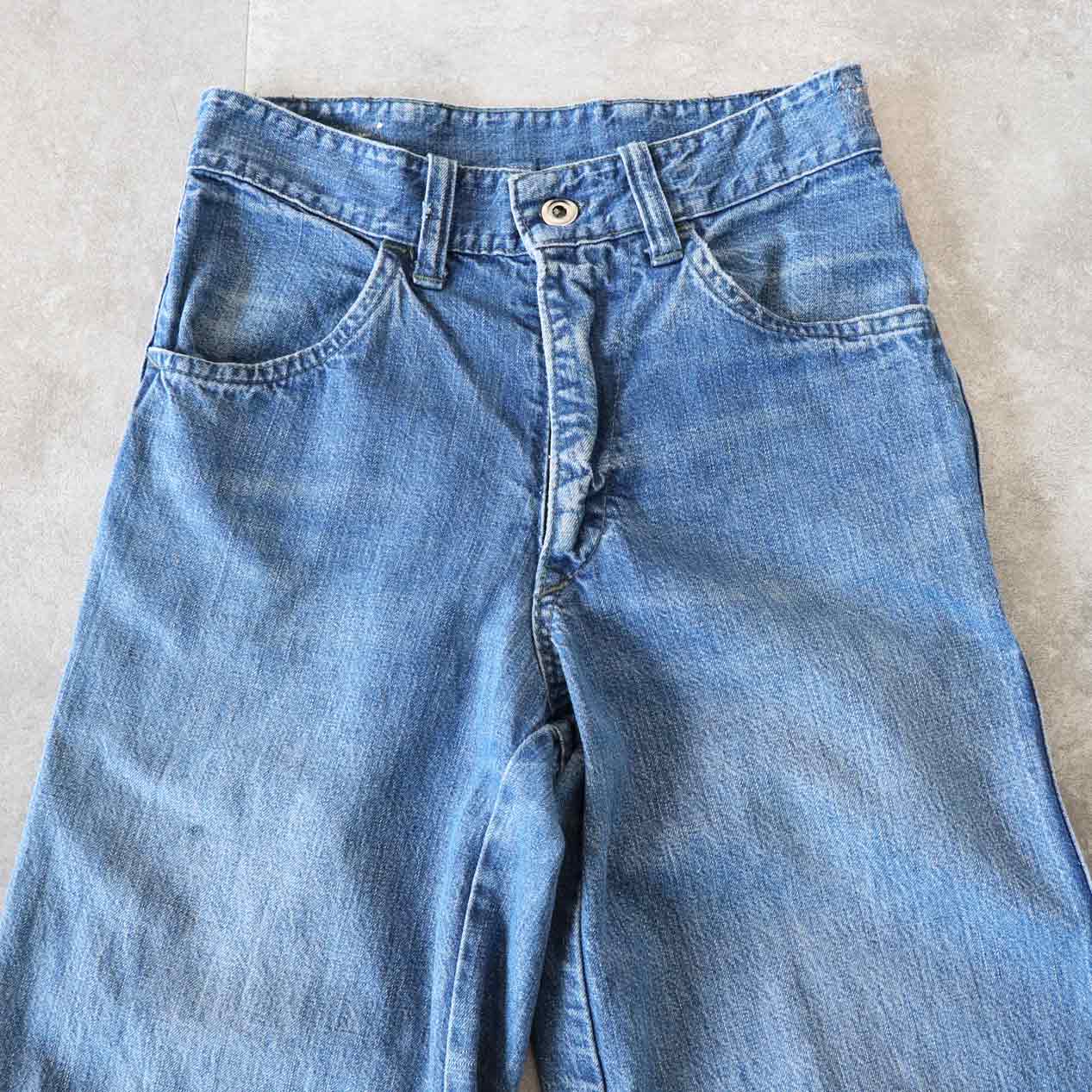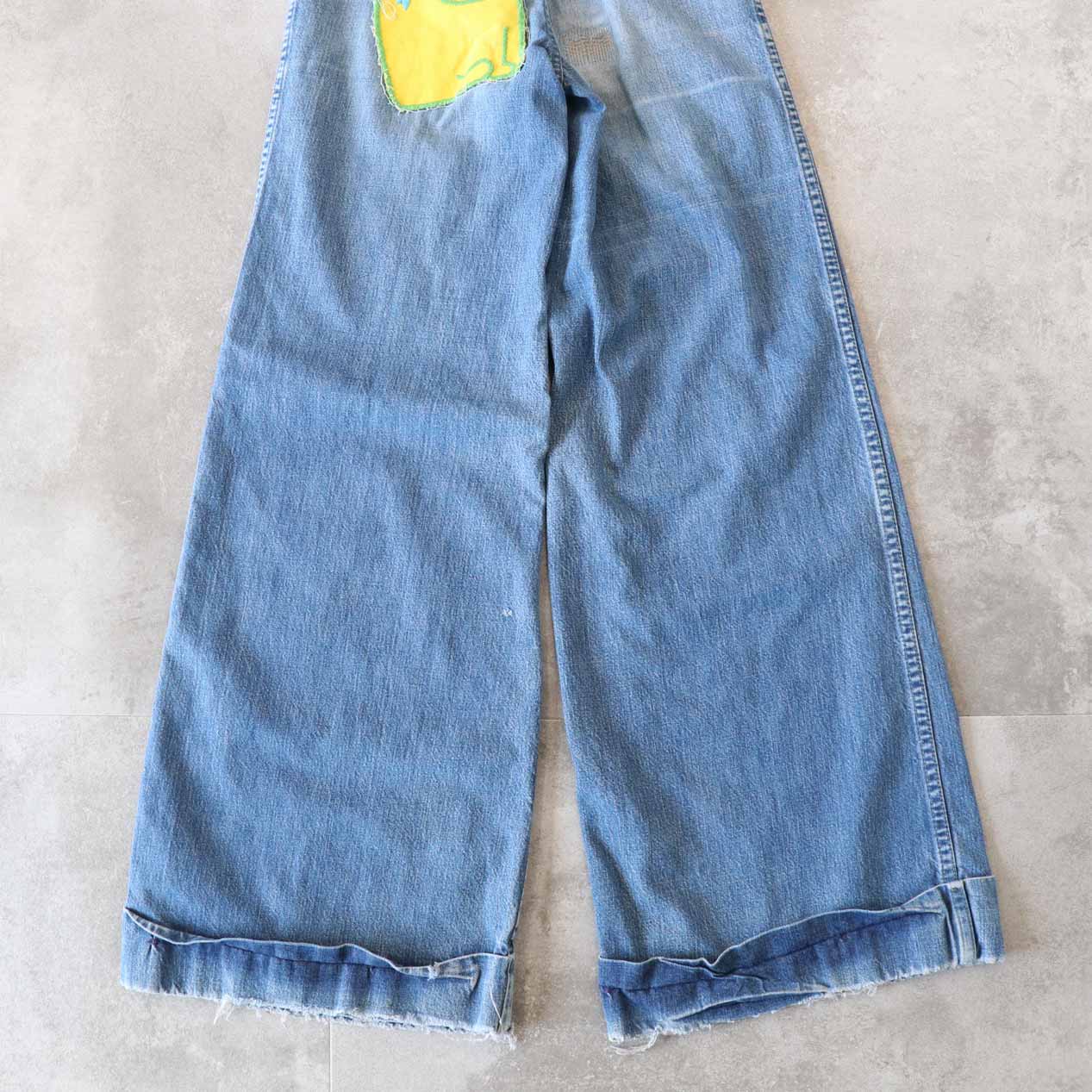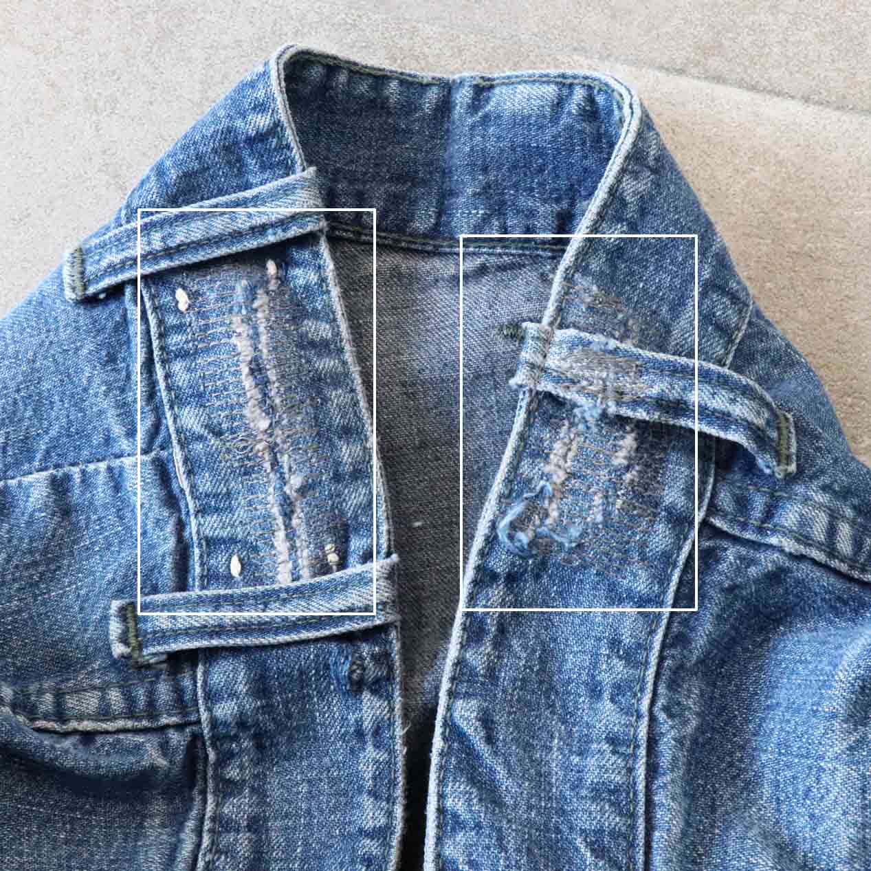 ・全体: 着用感、色褪せ、ウエスト両脇・右ヒップにミシンリペア跡、両脚裾に破れ