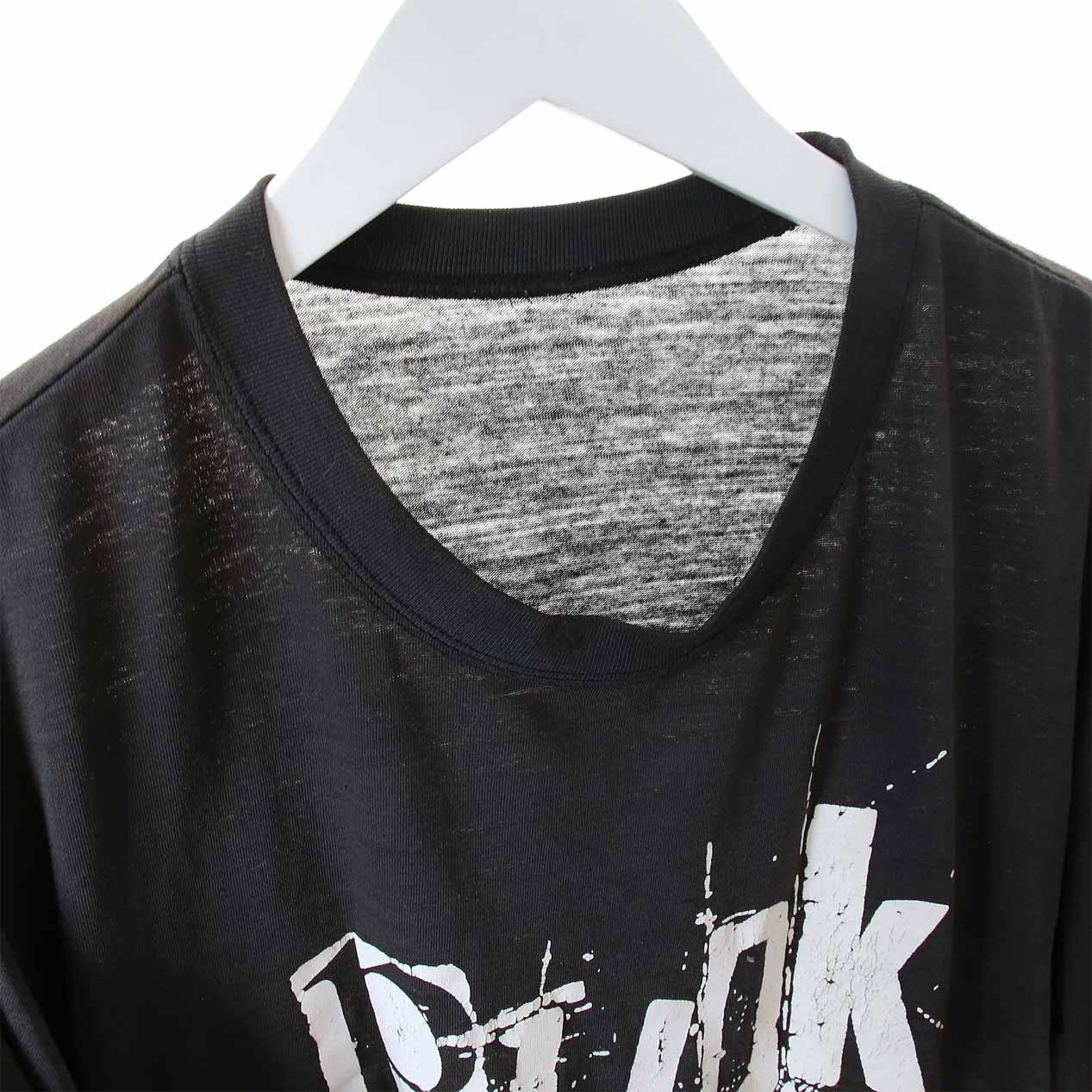 ・フロント: 一部襟ぐりステッチ切れ、胸部付近に小穴