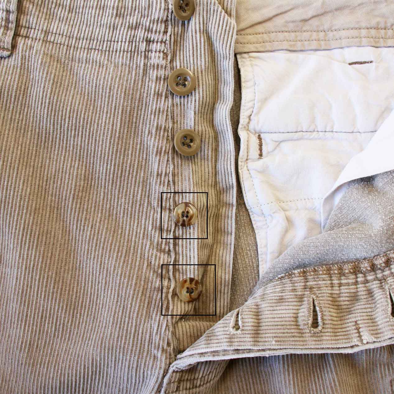 ・フロント、バック: フロントボタン替え(下部2個)、左ハンドポケット口下部/右ヒップポケット横にステッチリペア