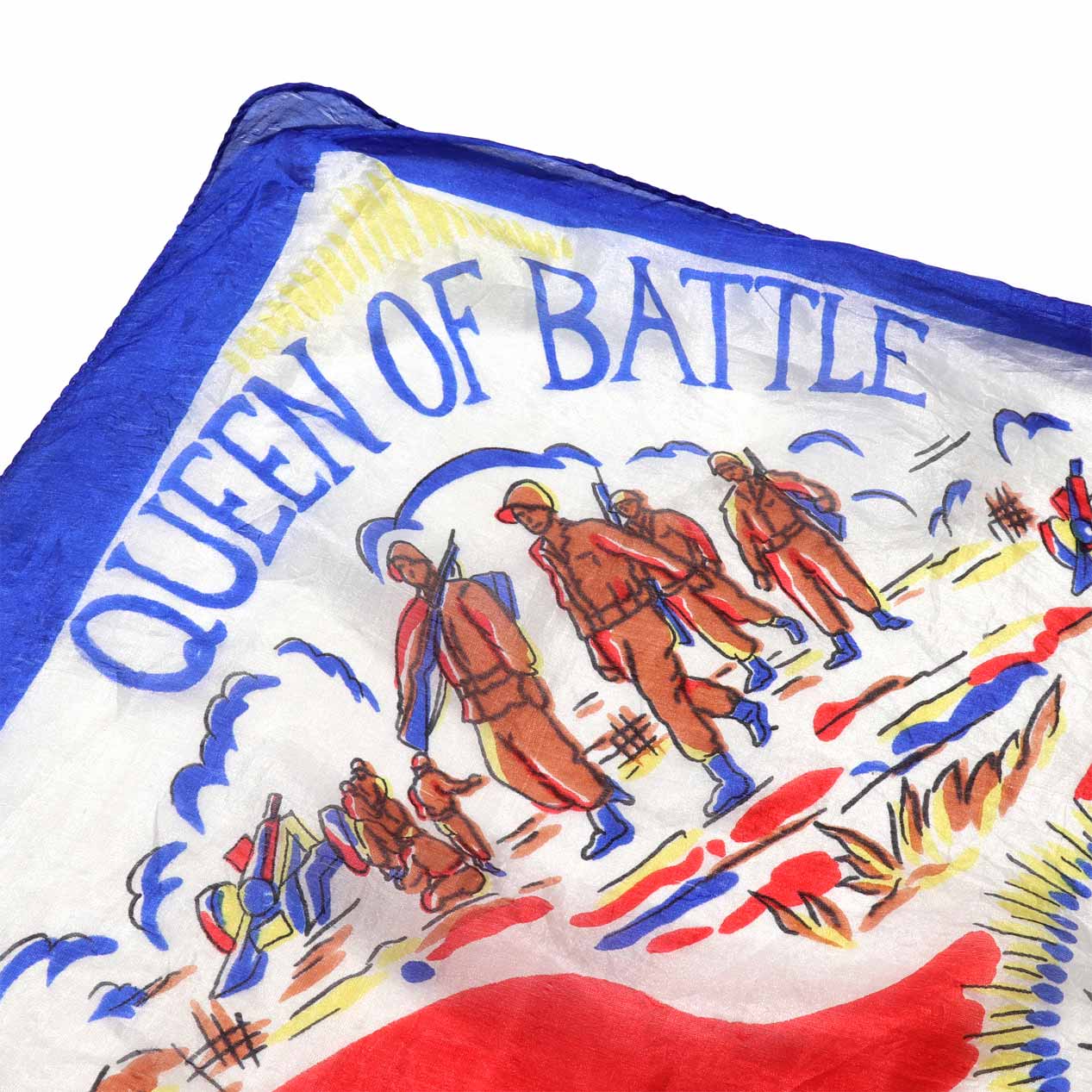MODEL : U.S. ARMY QUEEN OF BATTLE シルクスカーフ MANUFACTURE : --- AGE : --- SIZE : --- COLOR : ホワイトベース MATERIAL : --- (おそらくシルク 100%) COMMENT : 年代不明、U.S. ARMYのシルクスカーフです。