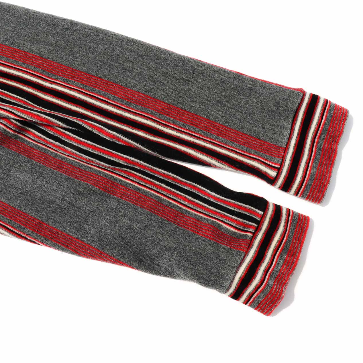 カラーはグレーベースにレッド×ブラック×ホワイトのマルチストライプ柄。