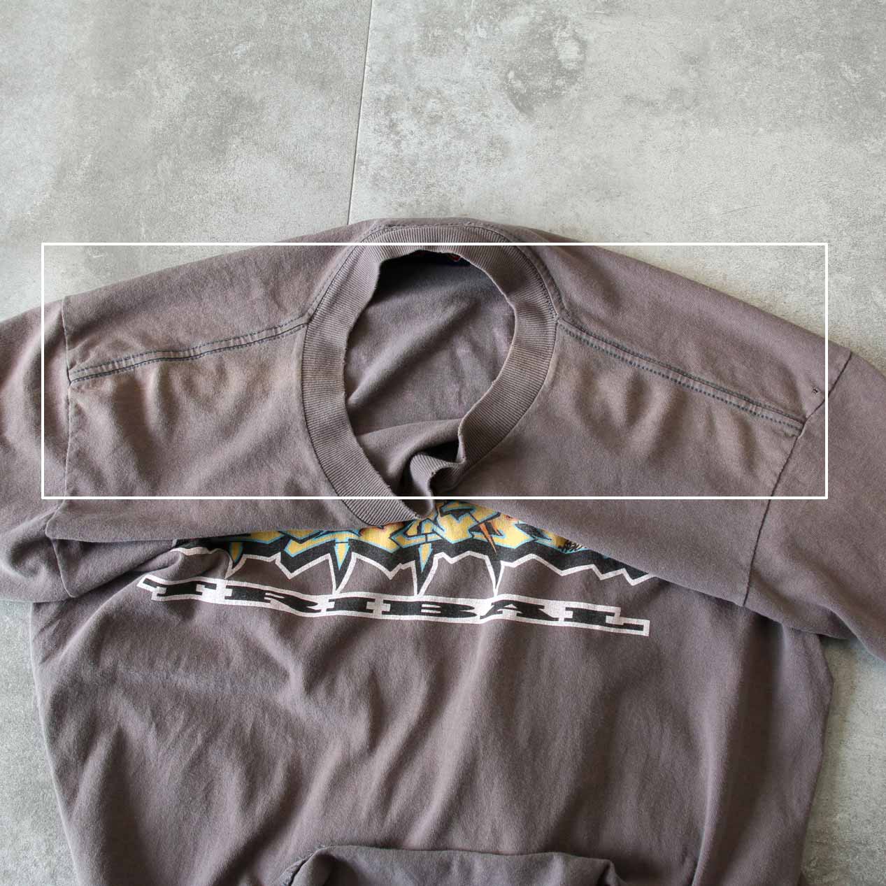 ・全体: 着用感、襟リブ端周囲に小穴、身頃裾ステッチ切れ