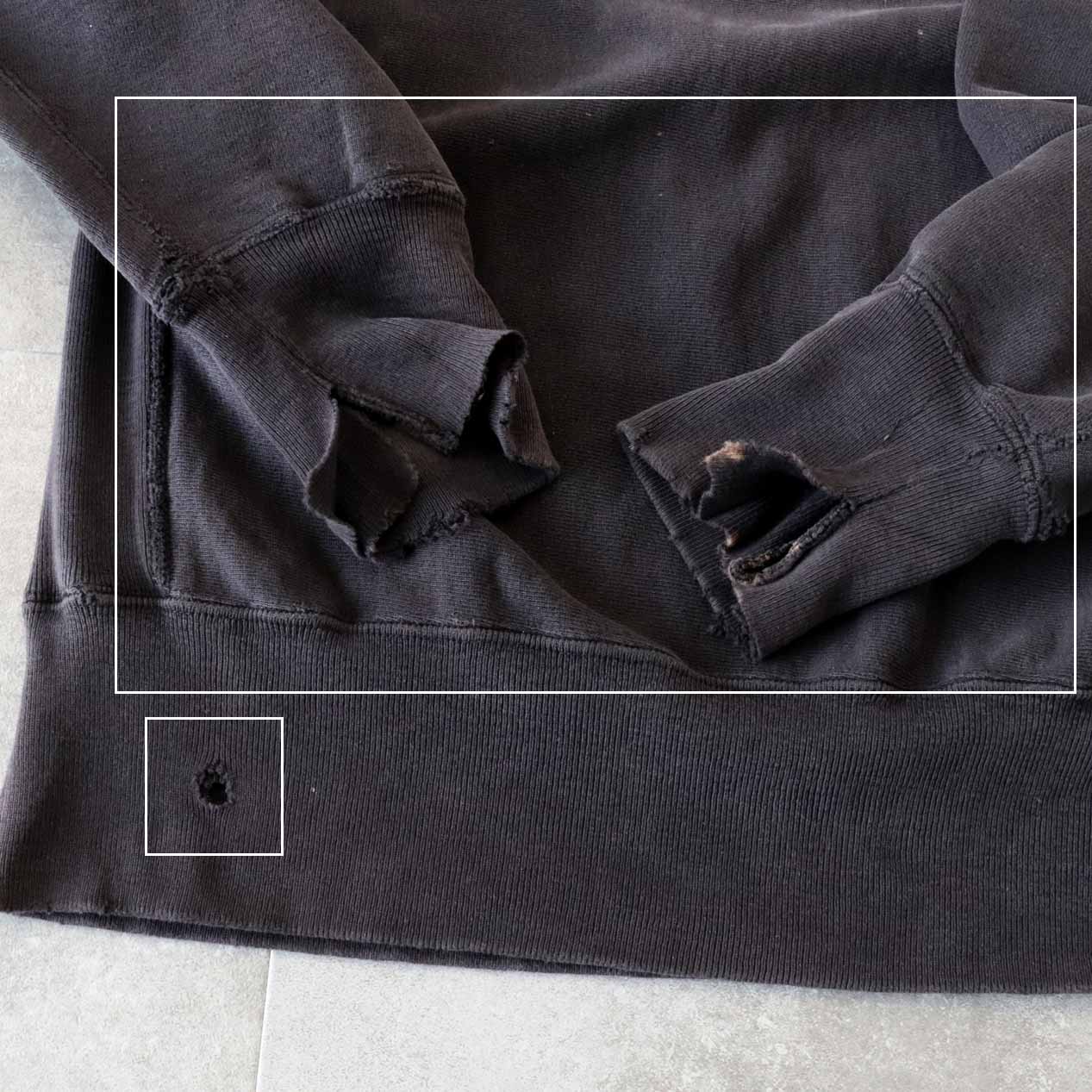 ・袖: 両袖先リブにダメージ、右袖にブリーチ跡