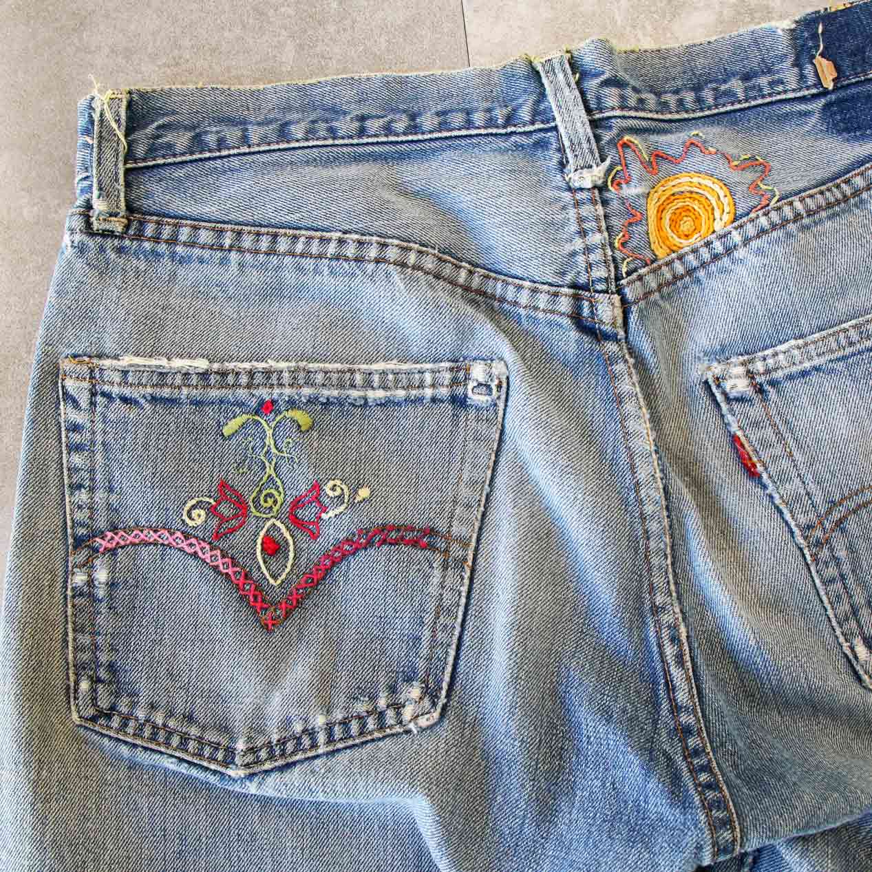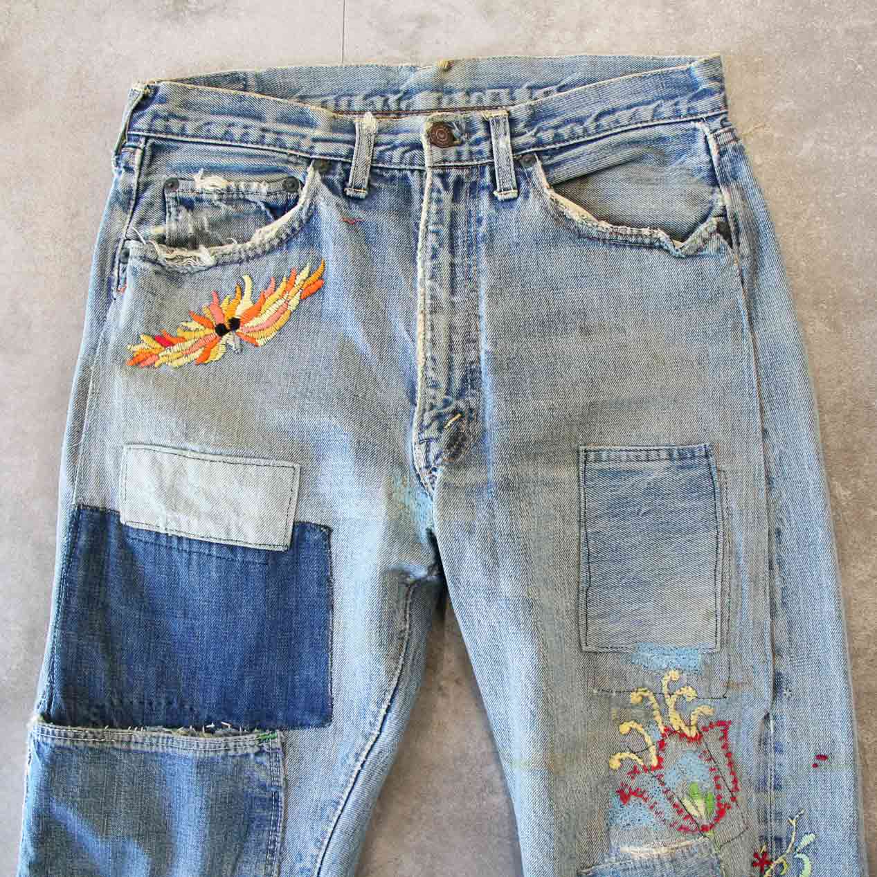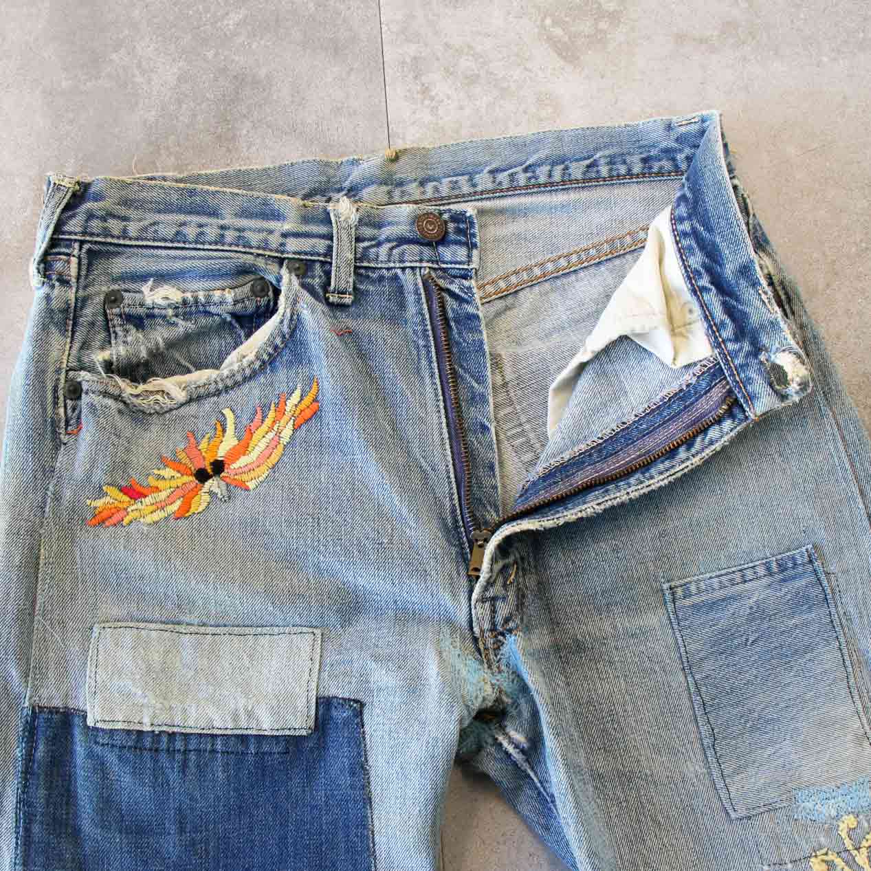 60’s LEVI’S 505 BIG-E Embroidered & Repaired Denim Pants With Red Line [About W32.5 /L30]