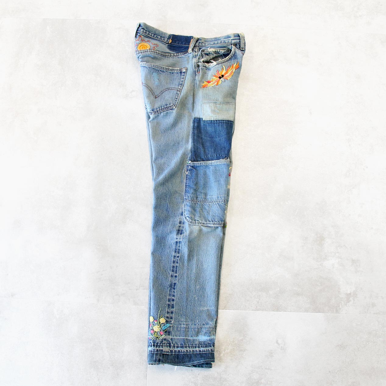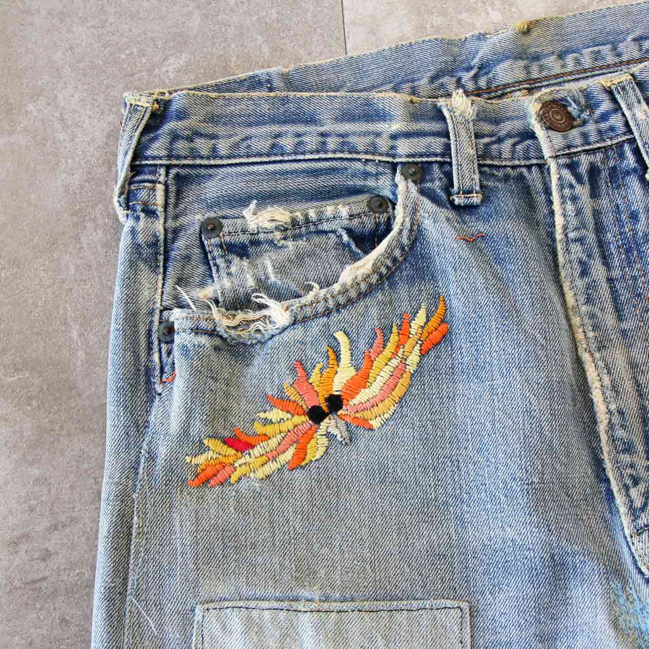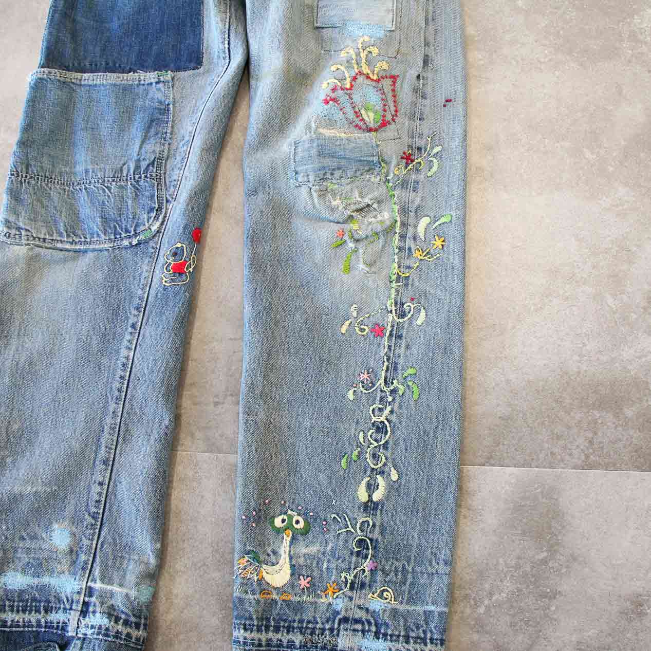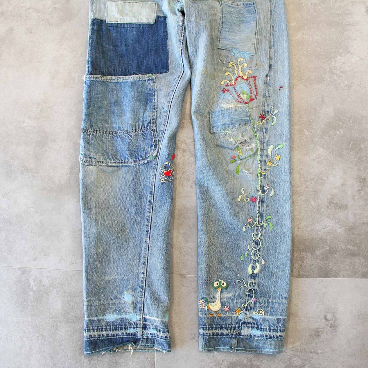 60’s LEVI’S 505 BIG-E Embroidered & Repaired Denim Pants With Red Line [About W32.5 /L30]