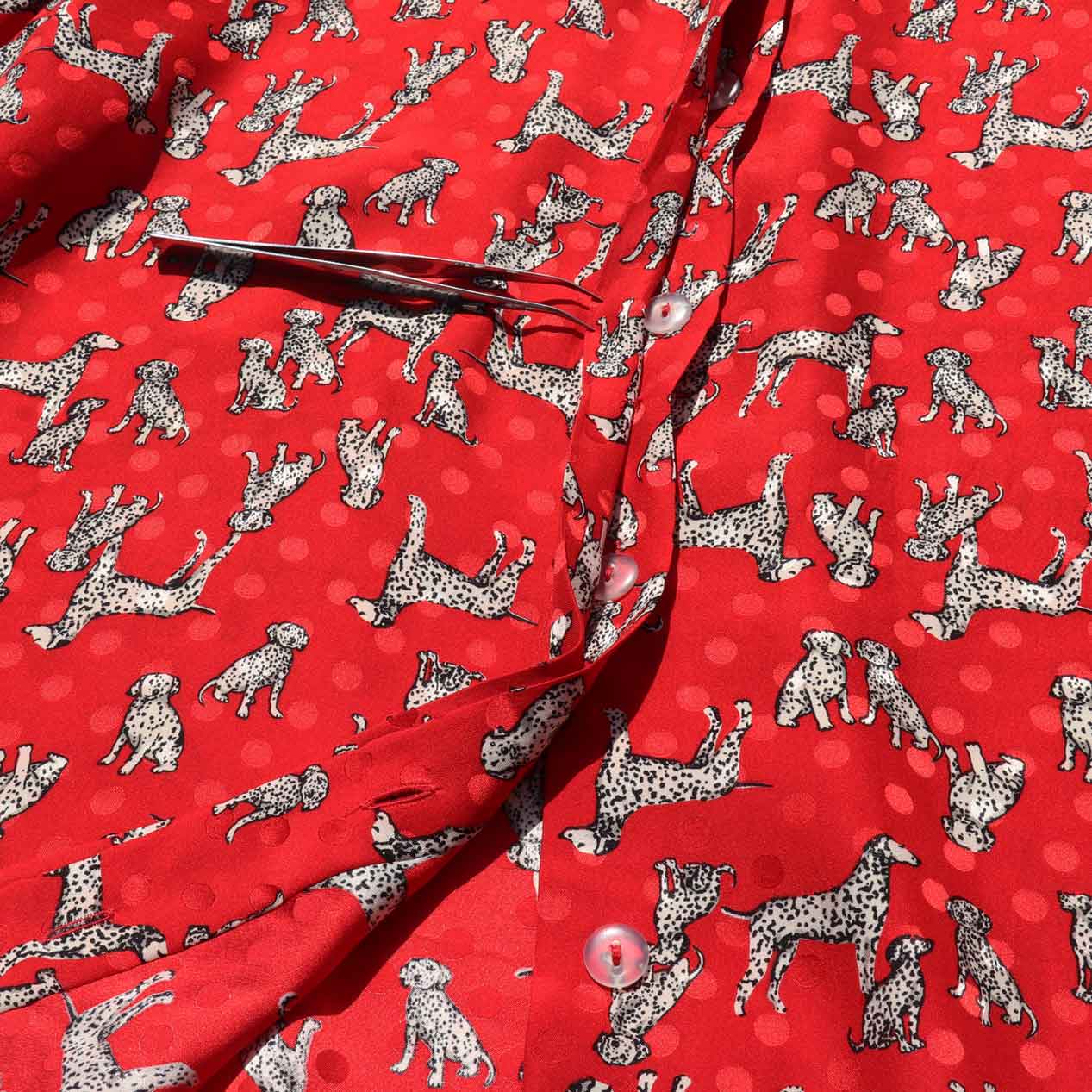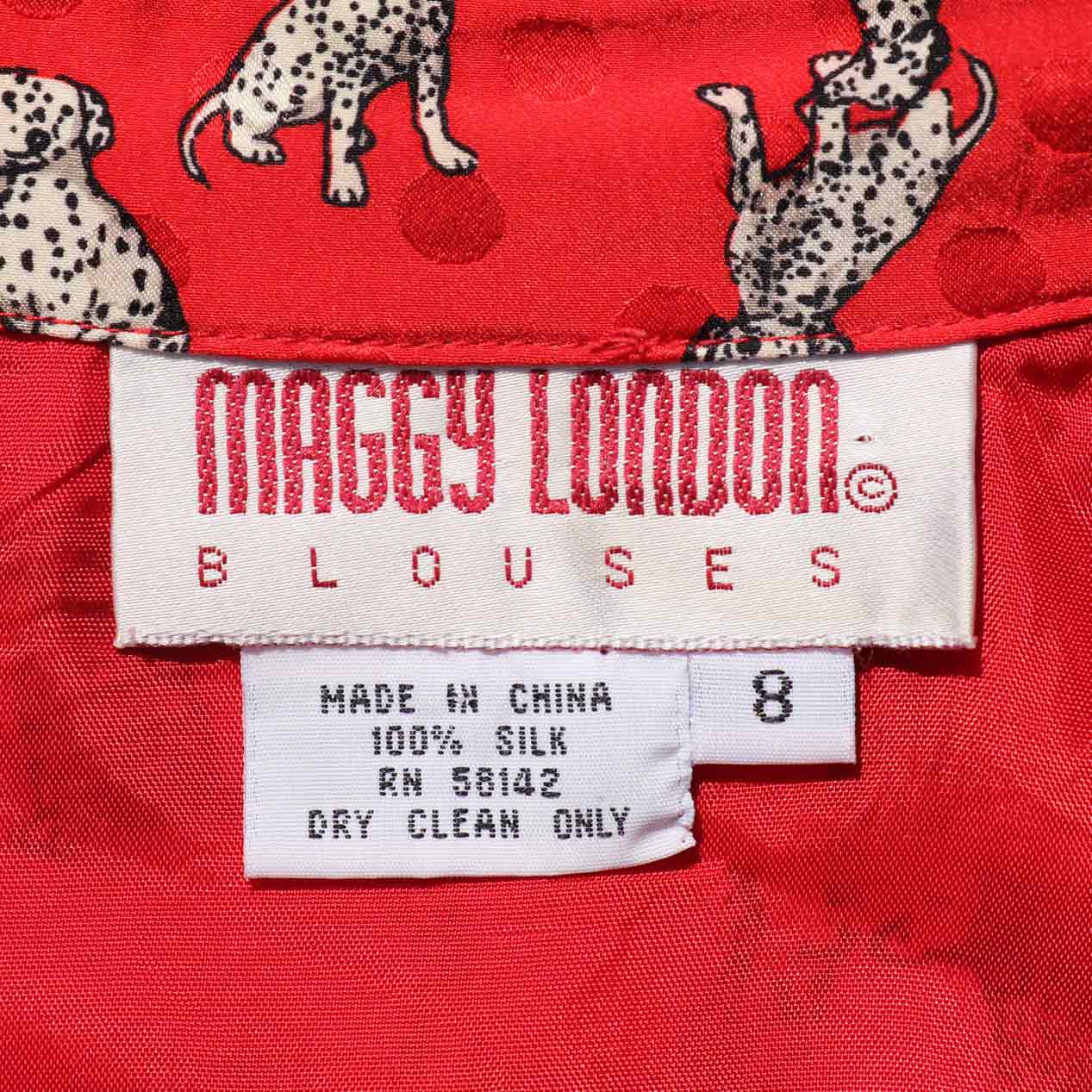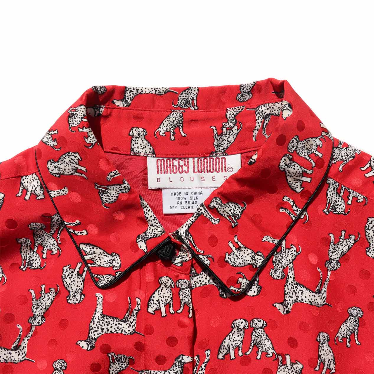MODEL : MAGGY LONDON ダルメシアン柄 シルクシャツ MANUFACTURE : Made In China AGE : 90’s SIZE : 8 COLOR : レッド MATERIAL : シルク 100% COMMENT : 90年代、MAGGY LONDONのシルクシャツです。