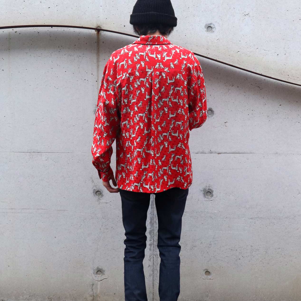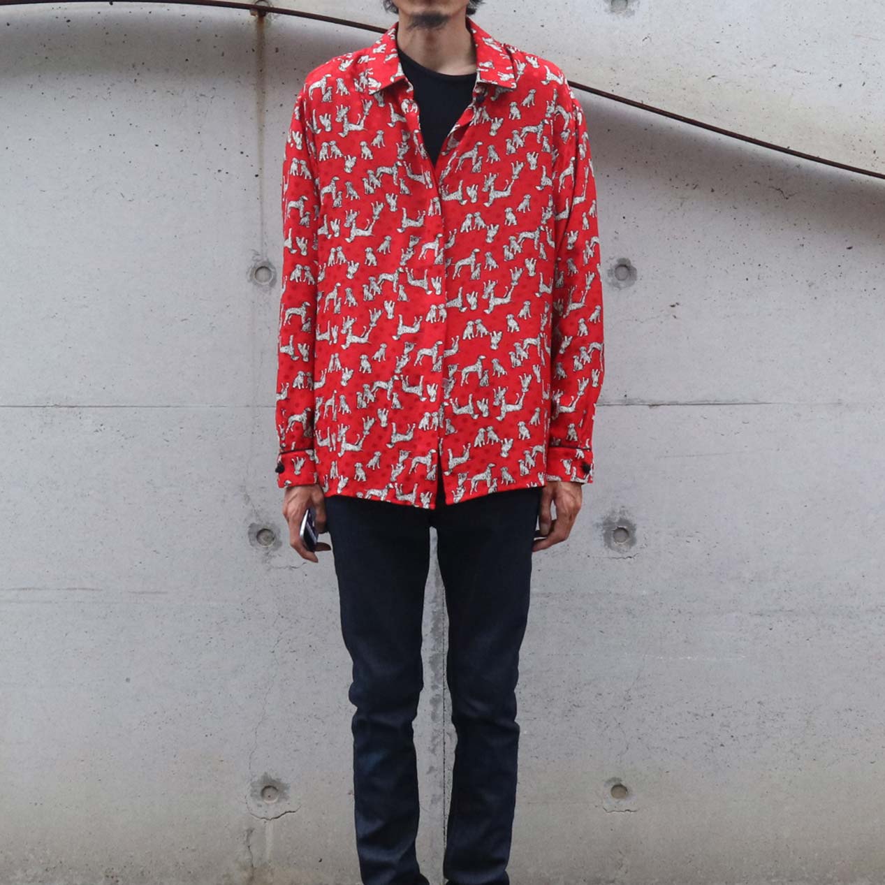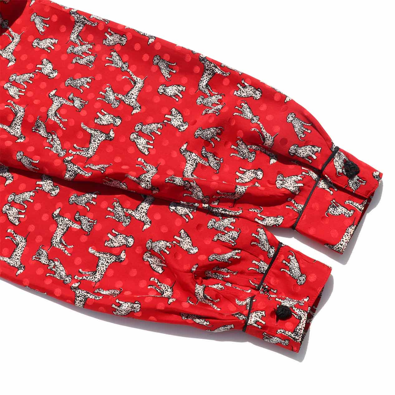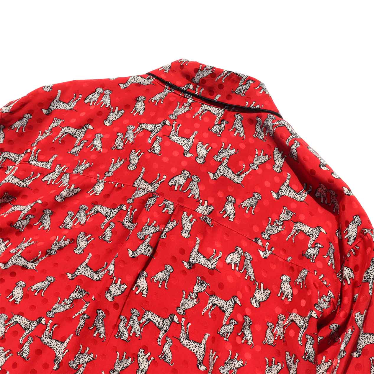 MODEL : MAGGY LONDON ダルメシアン柄 シルクシャツ MANUFACTURE : Made In China AGE : 90’s SIZE : 8 COLOR : レッド MATERIAL : シルク 100% COMMENT : 90年代、MAGGY LONDONのシルクシャツです。