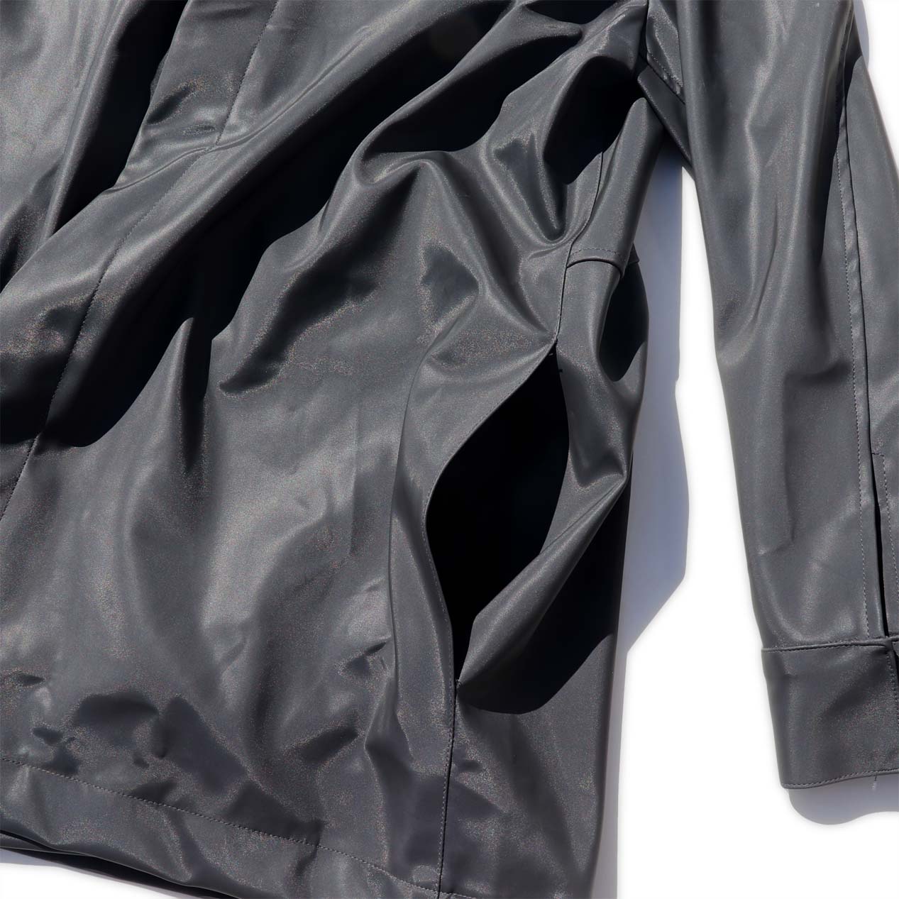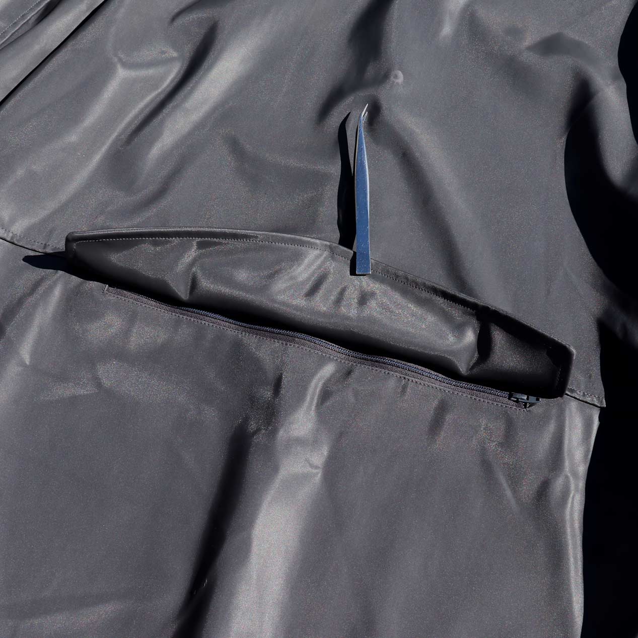 脇縫い目にスラッシュポケット、バックにフラップ付きのジップポケット。