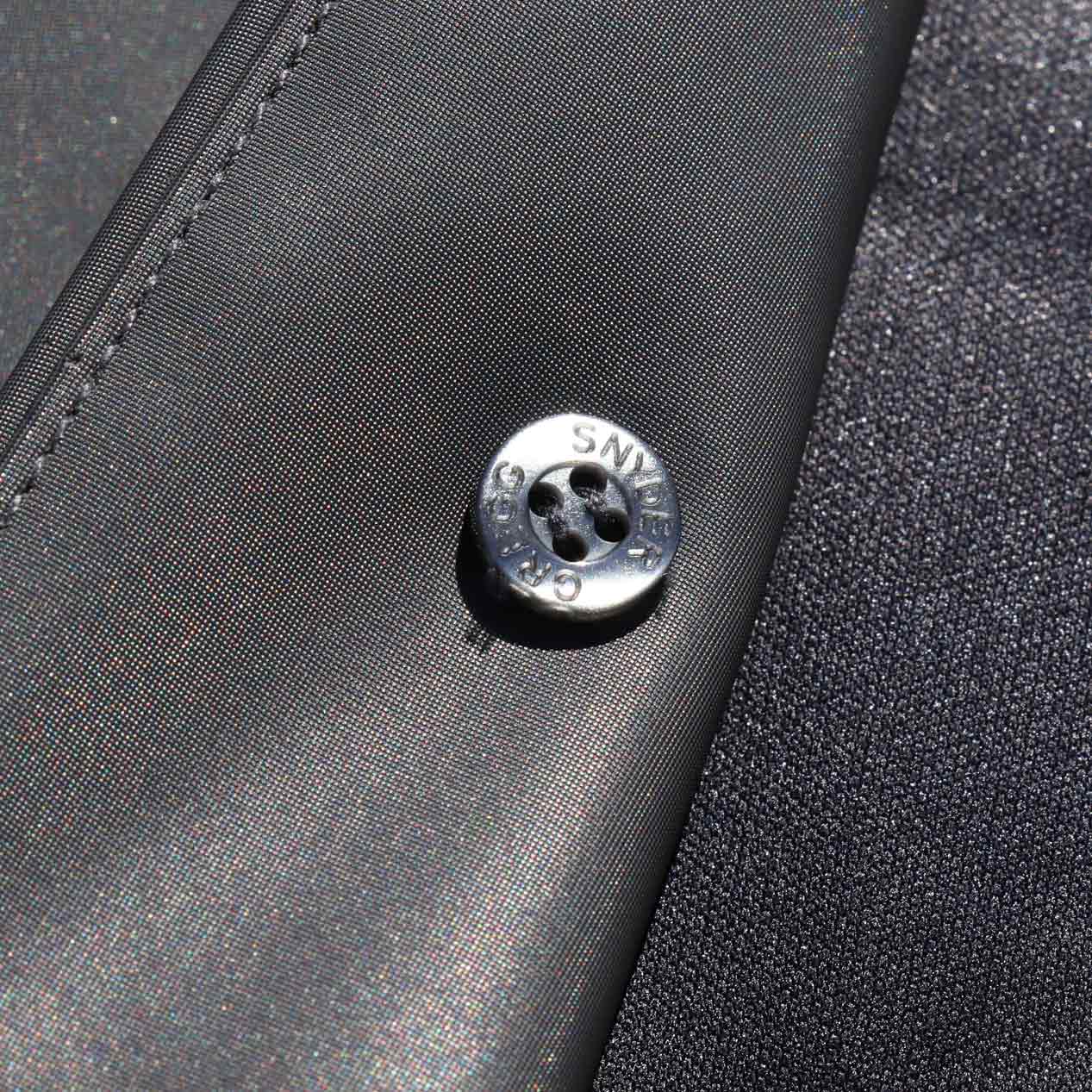 フロントは比翼仕立て、裏面に刻印入りの力ボタン付き。