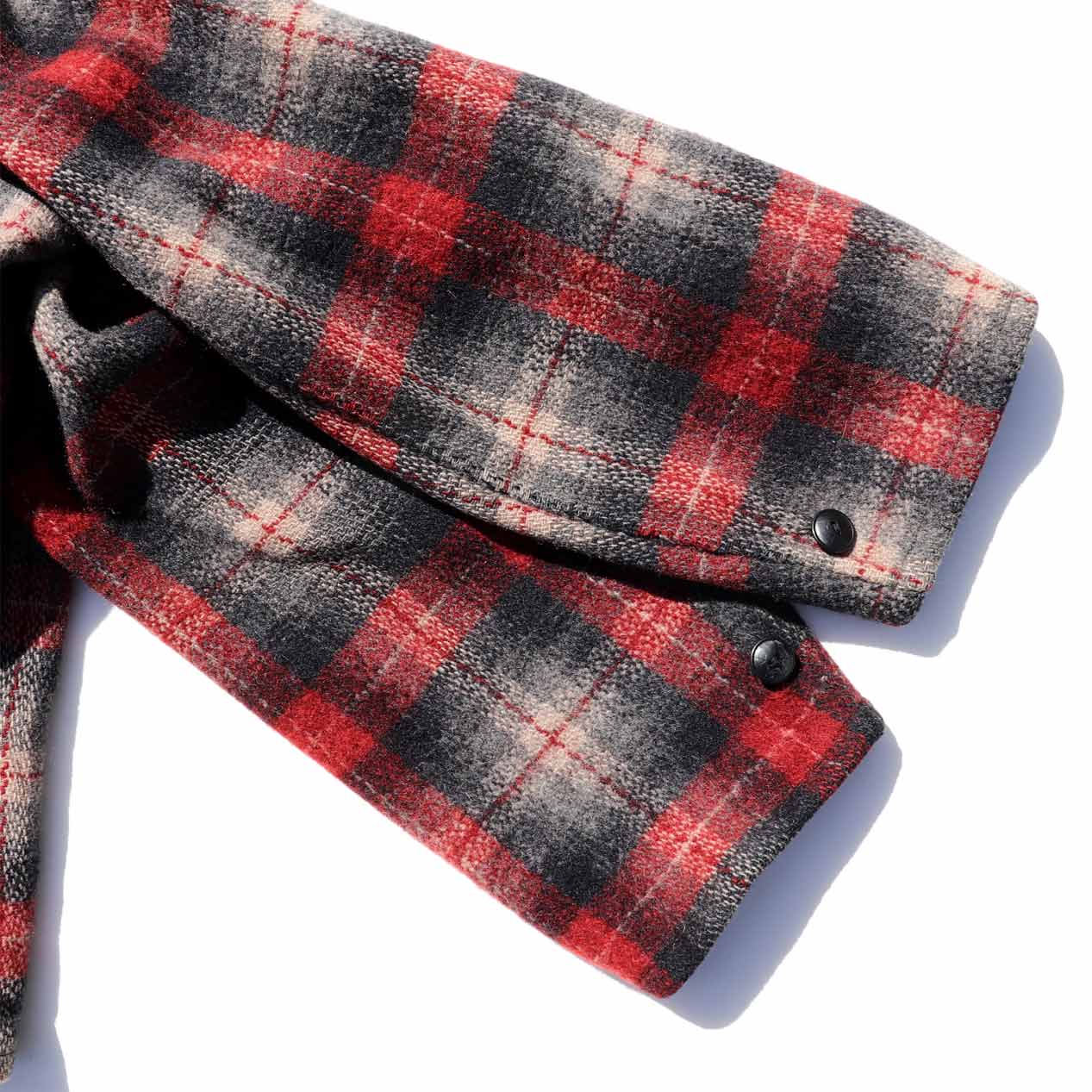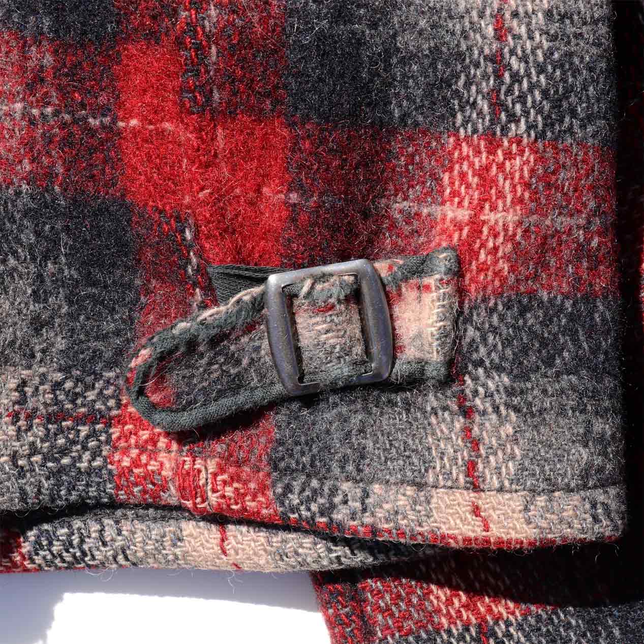 脇にバックルアジャストベルト、袖口には飾りボタン。