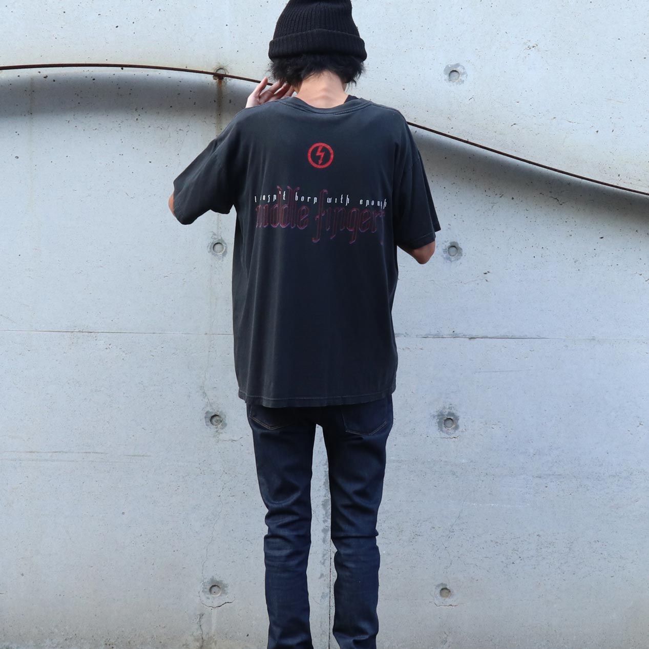 バックには1996年リリースの2ndアルバム ”ANTICHRIST SUPERSTAR” の収録曲、IRRESPONSIBLE HATE ANTHEMのリリックプリント。