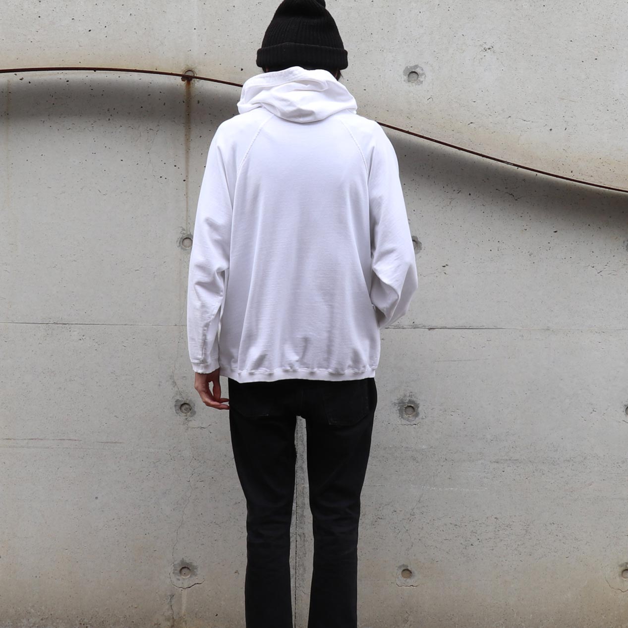 フード付き、袖先・裾はリブ仕様。