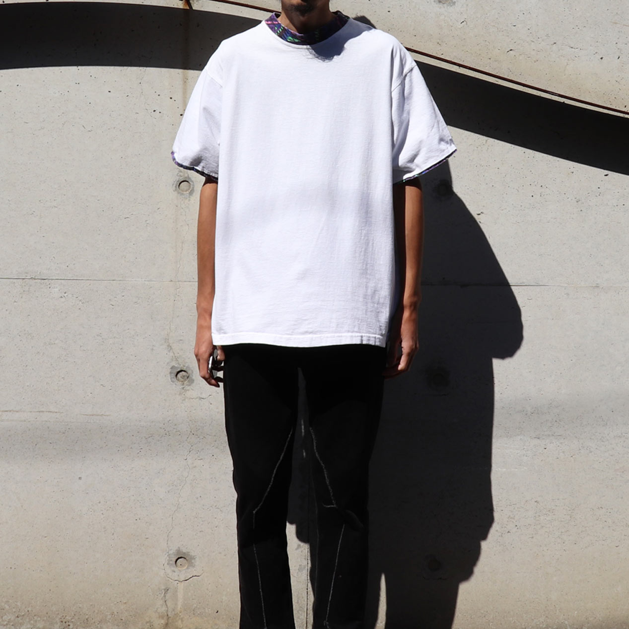 オールドサーフな柄でさりげなく遊びを効かせたレイヤード無地TEE。